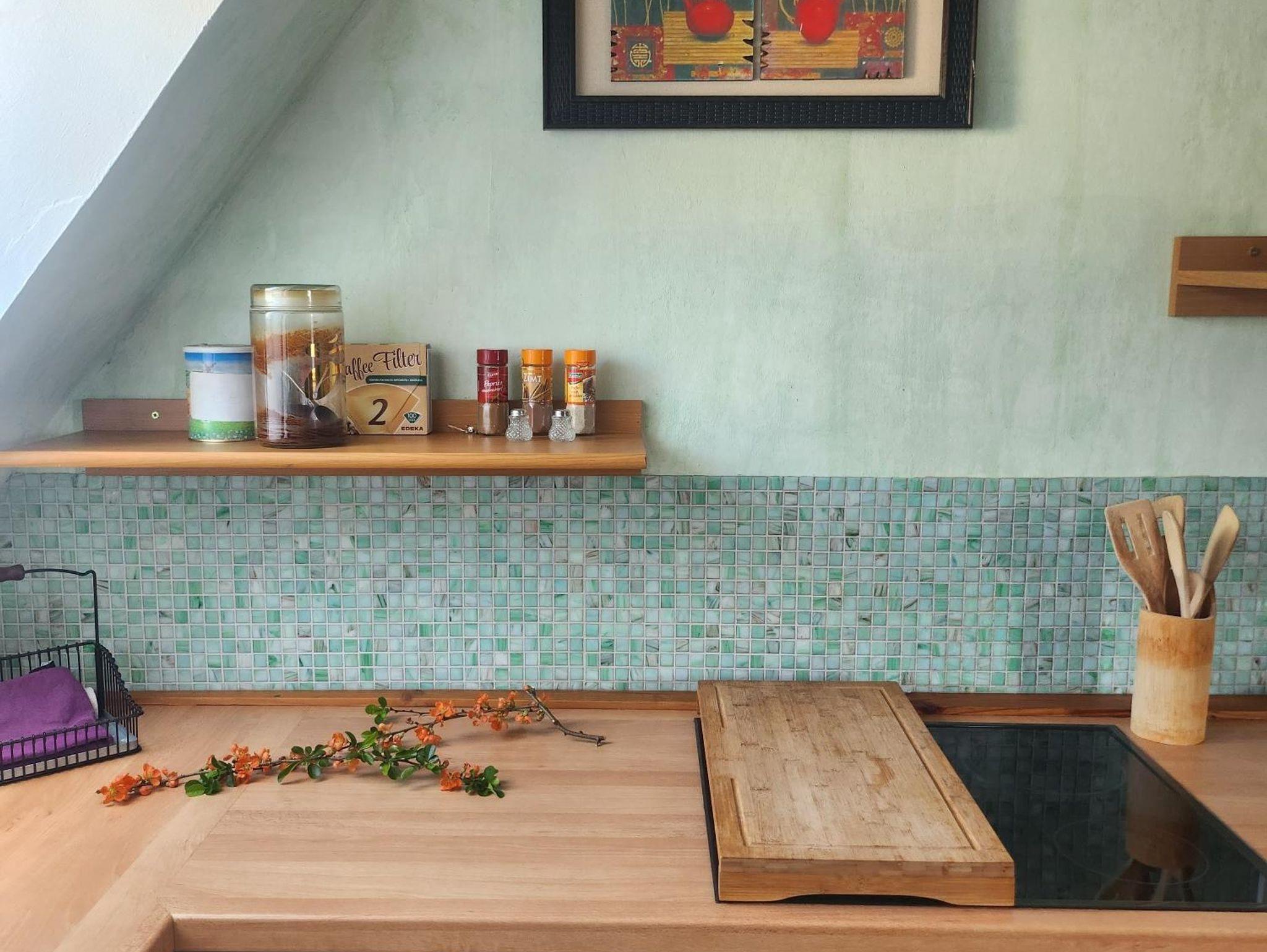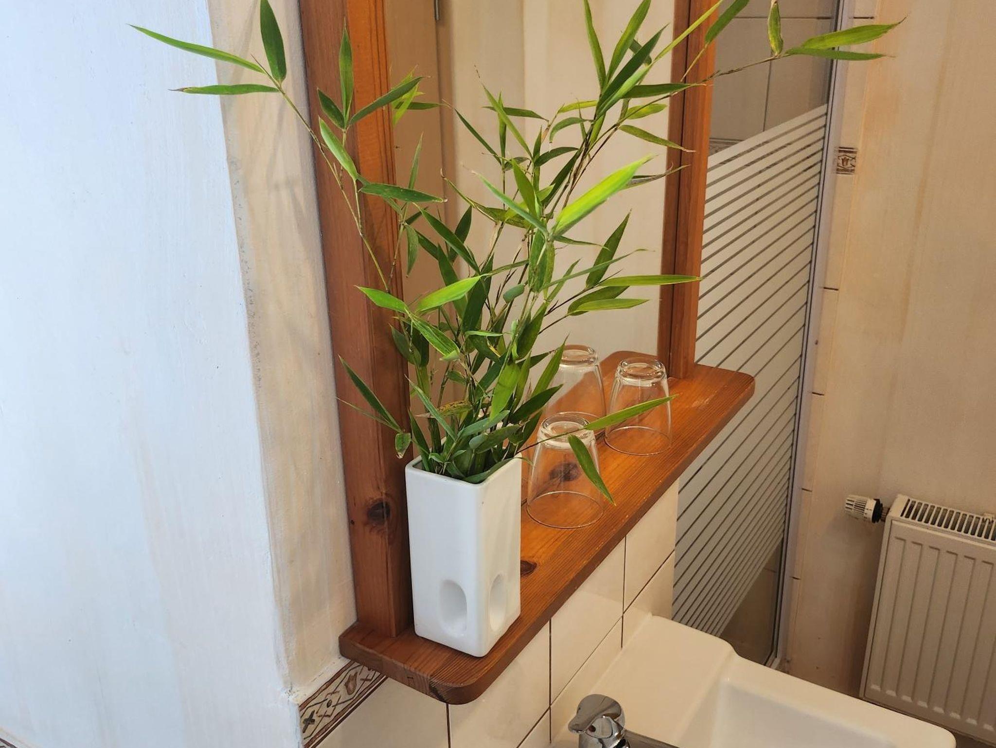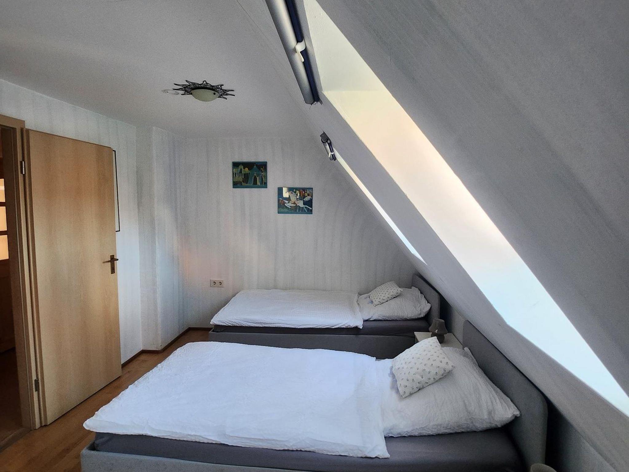 In unserer gemütlichen Mansardenwohnung im Dachgeschoss ist 55m² groß. Sie verfügt über eine große, vollständig ausgestattete Wohnküche mit Mikrowelle, Kaffeemaschine, Kühlschrank mit Gefrierfach, Wasserkocher, Toaster, sowie ausreichend Geschirr und Besteck. Außerdem gibt es einen großen Esstisch. Im linken Teil des Raumes befindet sich der Wohnbereich mit zwei Sesseln und Sofa, Sat-TV, einem kleinen Tisch und einem Bücherregal mit Lektüre über Schweinfurt und Umgebung. Die Wohnung verfügt über zwei Schlafzimmer. Ein Schlafzimmer ist mit zwei Einzelbetten (zusammengeschoben Doppelbett) mit Nachttischen und Lampen bestückt. Das zweite, kleinere Schlafzimmer verfügt über zwei Einzelbetten und eine Kommode. Das Badezimmer ist mit Dusche, Waschbecken, WC und Fön ausgestattet.