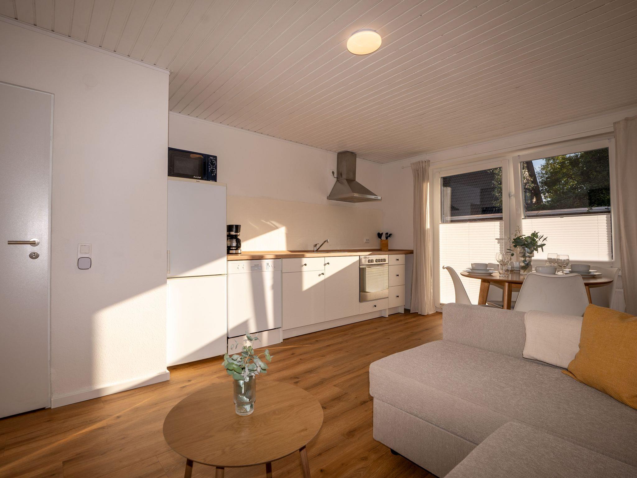 Der offene Wohnbereich beherbergt eine Küchenzeile, einen Essplatz und eine Sofaecke. Von hier aus gelangen Sie auf die Sonnenterrasse. Ein Tageslichtbad mit ebenerdiger Dusche und Badewanne ist großzügig bemessen.