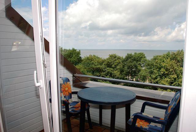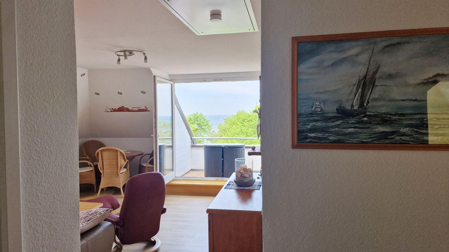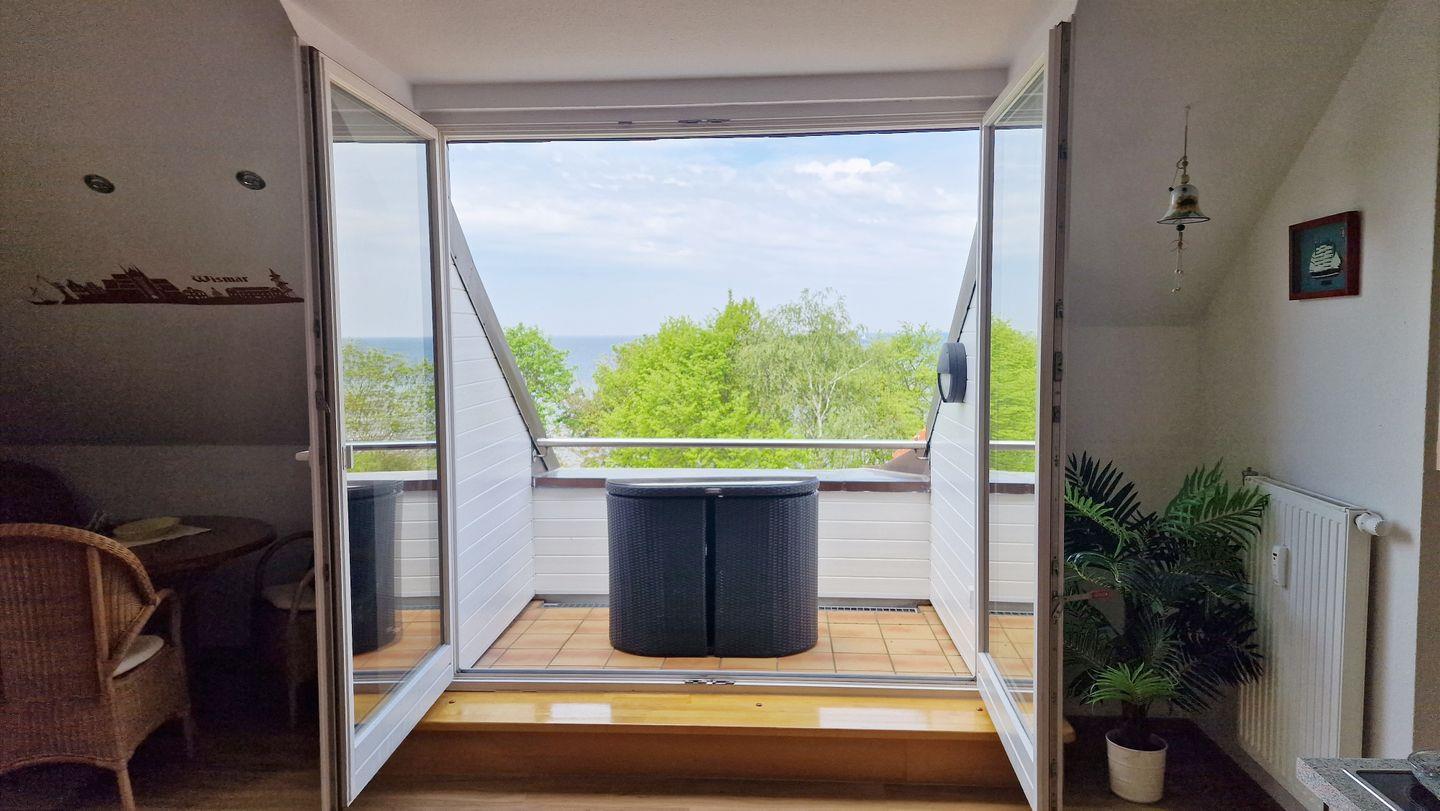 Vom Wohnbereich haben Sie außerdem Zugang zum möblierten Balkon, der Ihnen einen unverbaubaren Blick auf das Meer bietet. Wellenrauschen und Möwengeschrei sind hier inklusive.