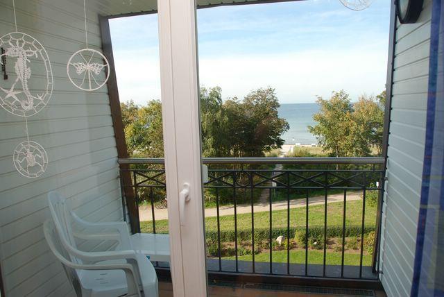 Das gemütliche Wohnzimmer mit Sofaecke, TV-Gerät und Zugang zum Balkon verfügt außerdem über die integrierte Küche. Diese ist mit Kühlschrank mit Gefrierfach, Herd mit Backofen, Geschirrspülmaschine, Kaffeemaschine, Wasserkocher und vielem mehr ausgestattet. Vom möblierten Balkon haben Sie einen tollen Blick auf die Promenade und den Strand und die Ostsee.