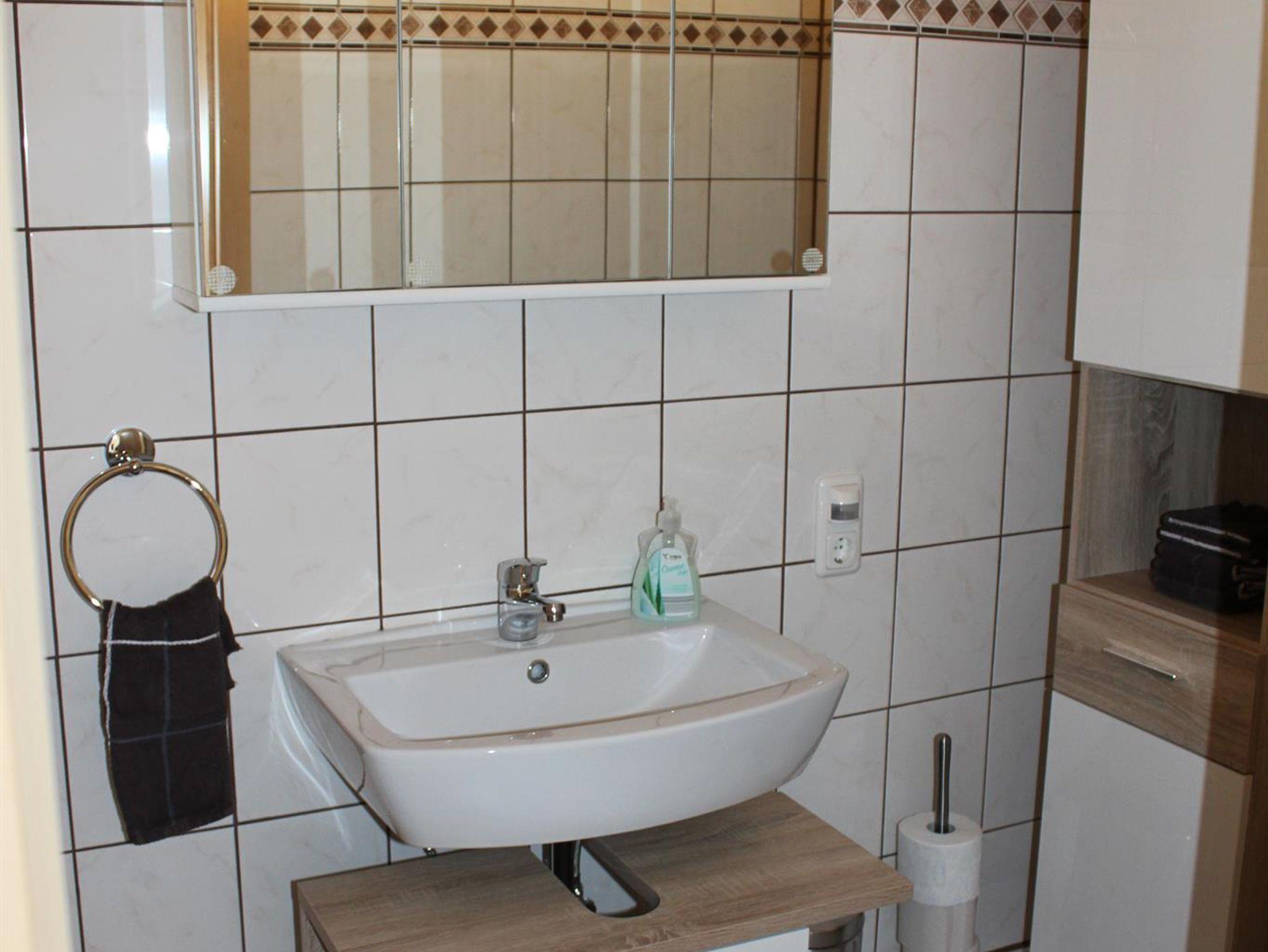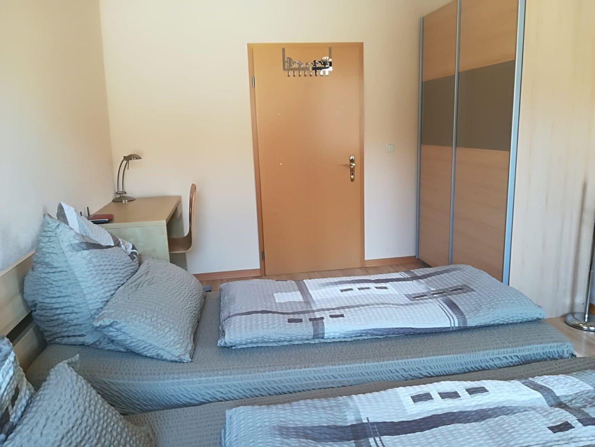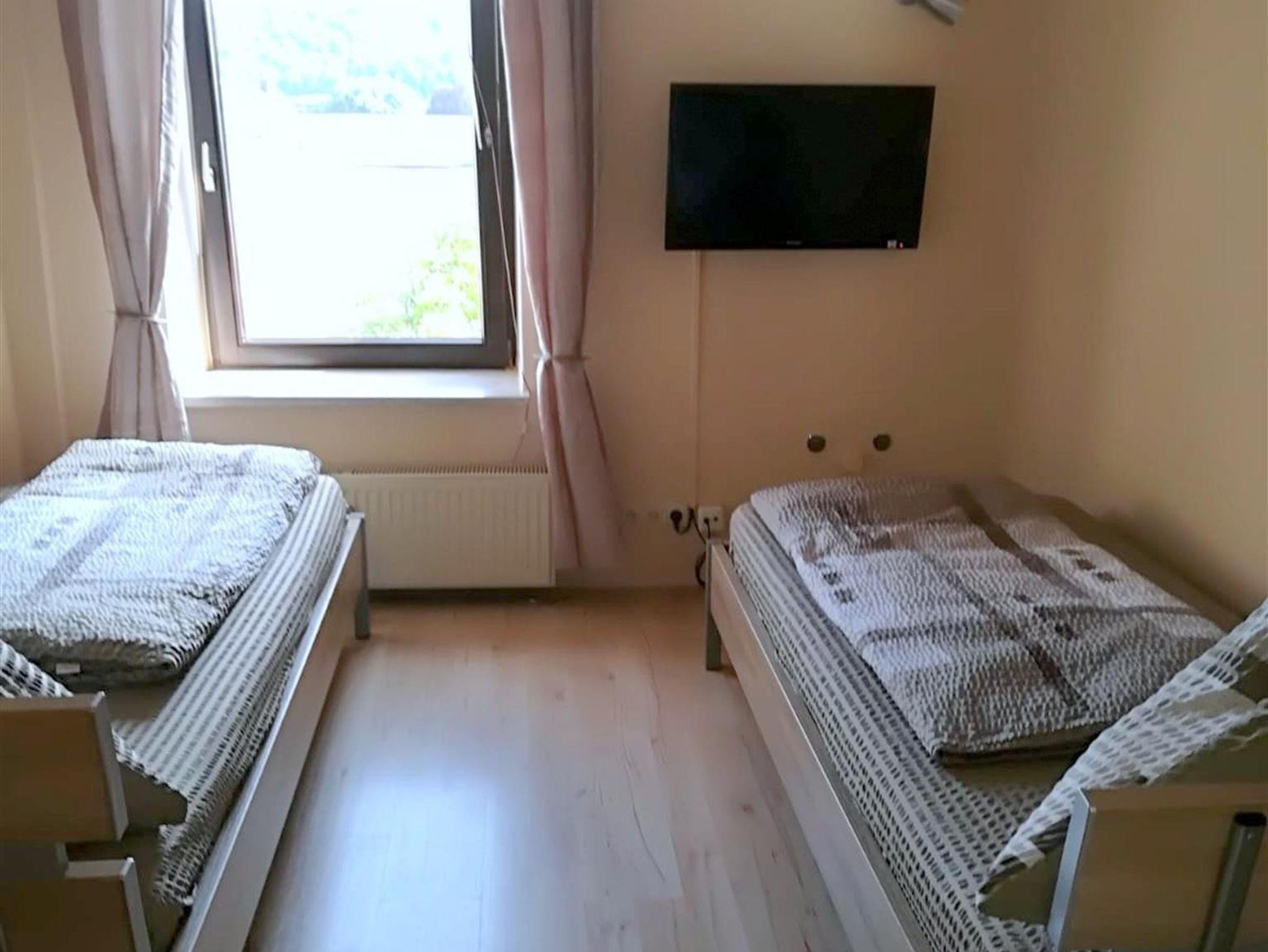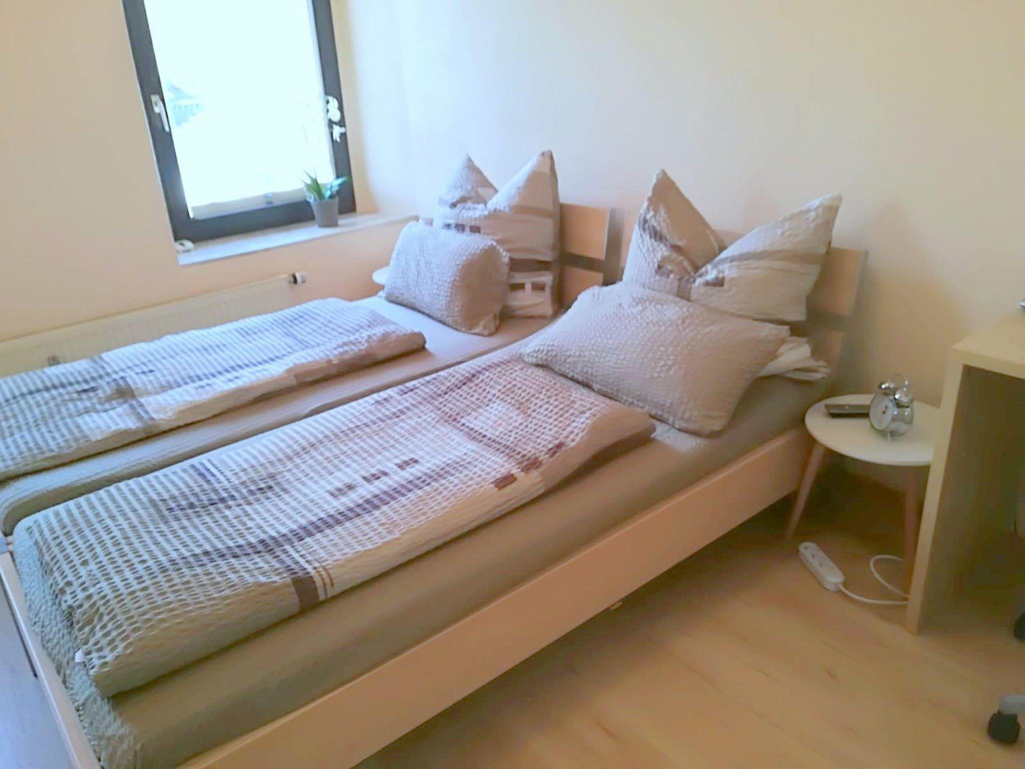 Ferienwohnung mit Doppelschlafzimmer und ein Zweibettzimmer, jeweils mit Kabel-TV, separates Bad, kleine Küche, Kaffemaschine, Pad-Maschine, Wasserkocher, Mikrowelle, Kühlschrank, Wohnzimmer mit Kabel-TV, Essecke.