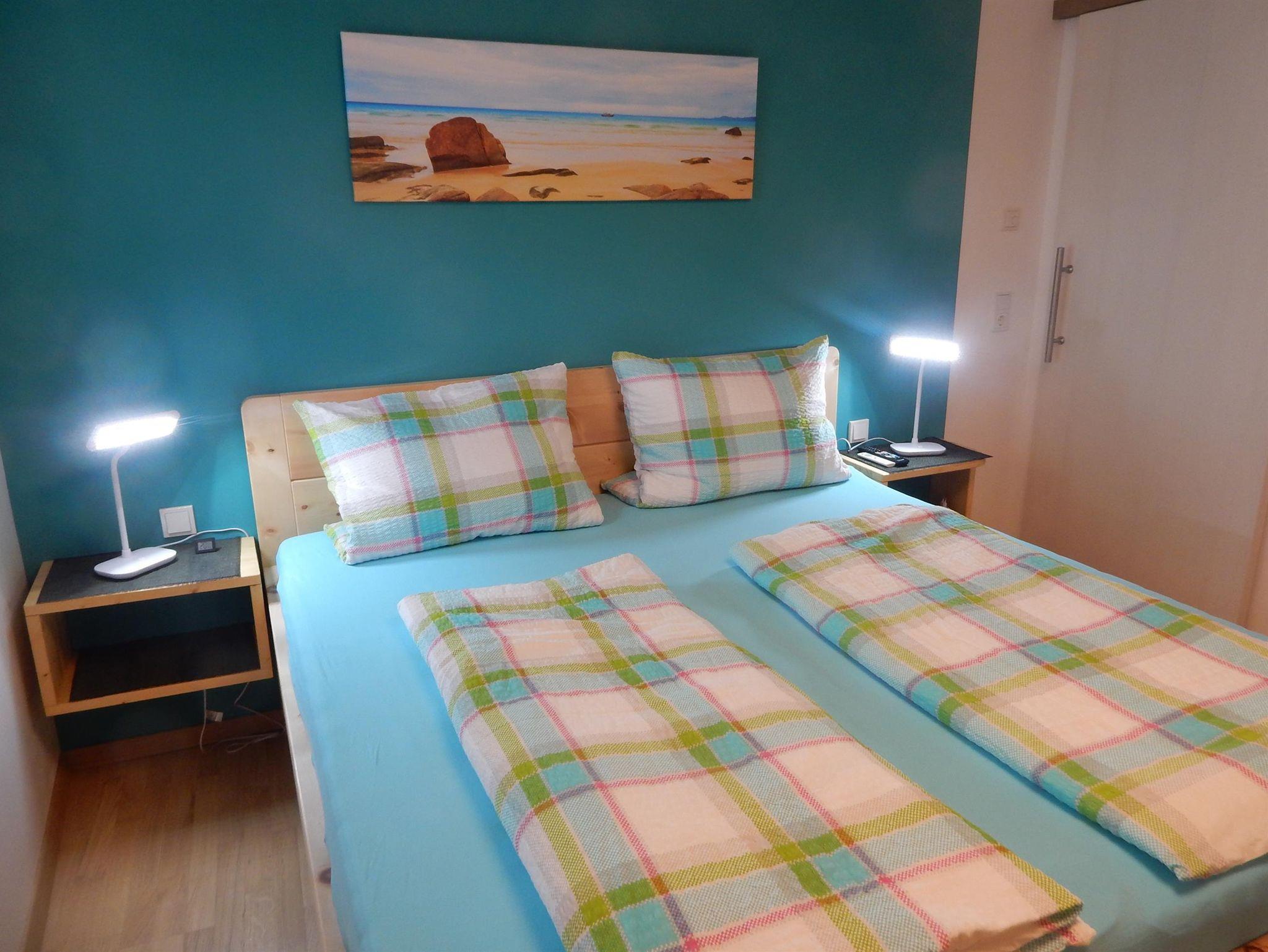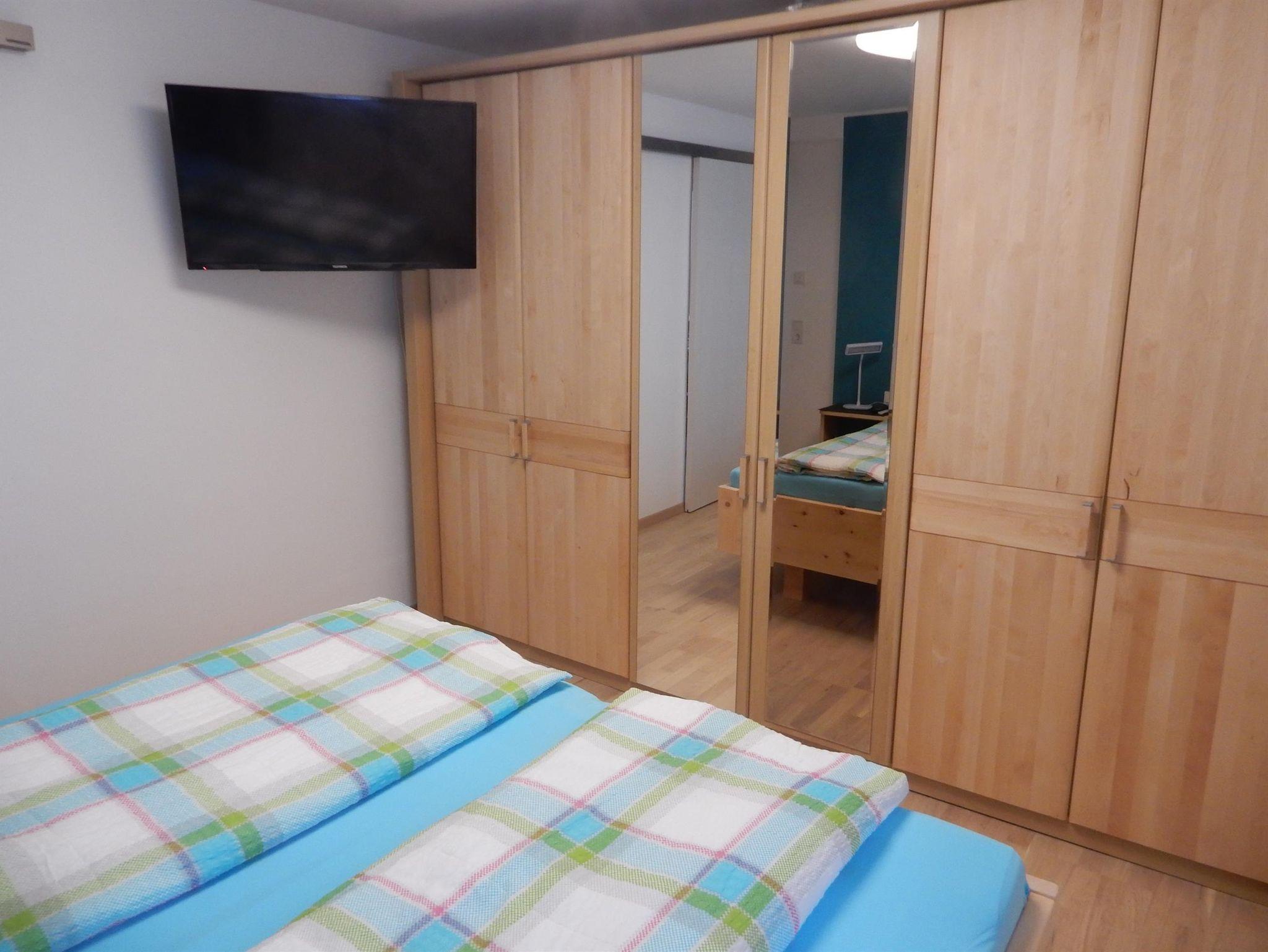 Schlafzimmer: original Zirbenholzbett, 180 x 200 m, Zirben Holz hat einen beruhigenden Einfluss auf Herz und Kreislauf, sowie für einen erholsameren Schlaf, 2 atmungsaktive Matratzen 90 x 200 m, die man von Härtegrad 3 auf Härtegrad 4 wenden kann. Bettwäsche wird bereitgestellt. Holzparkettboden Fernseher
