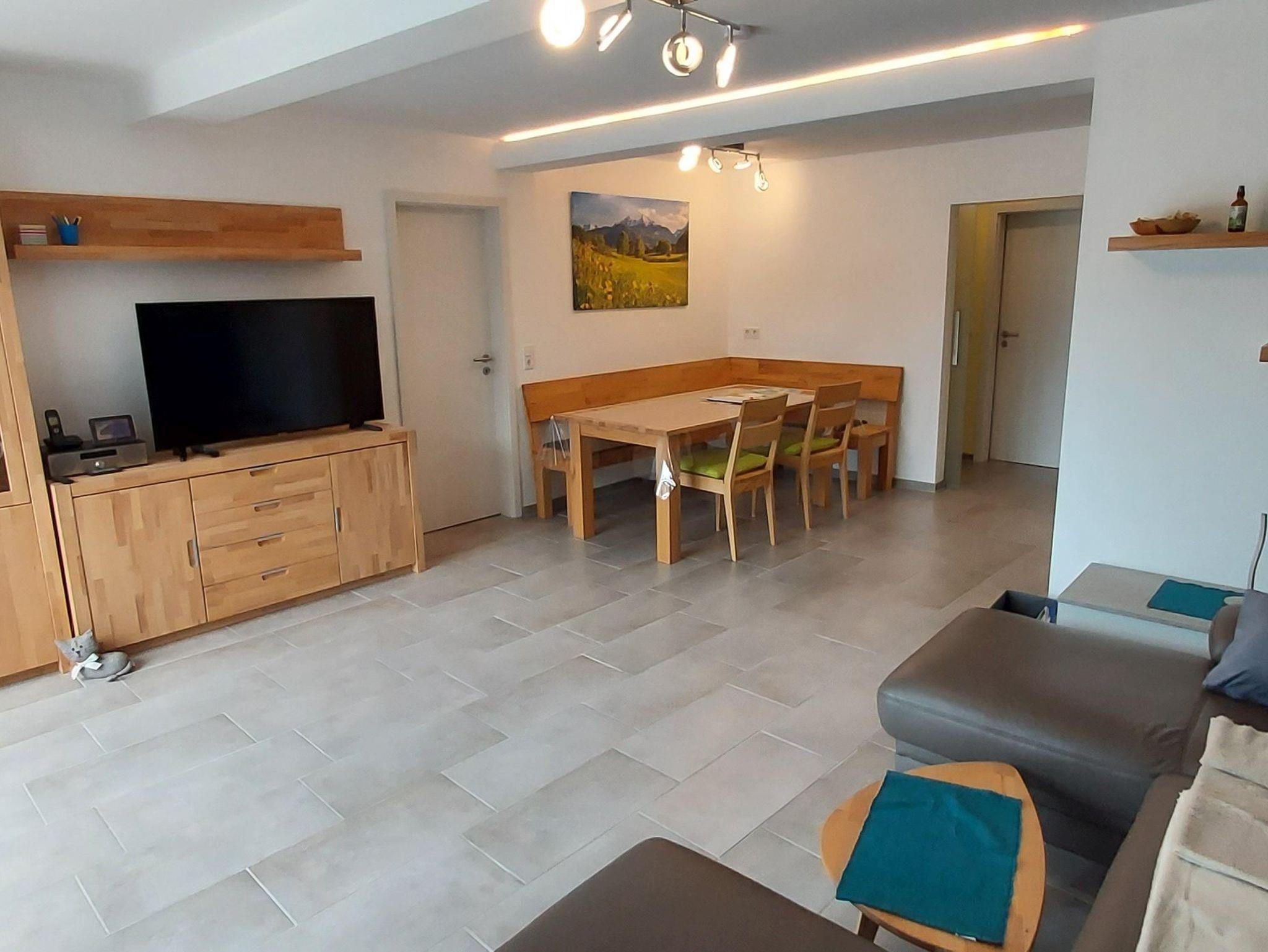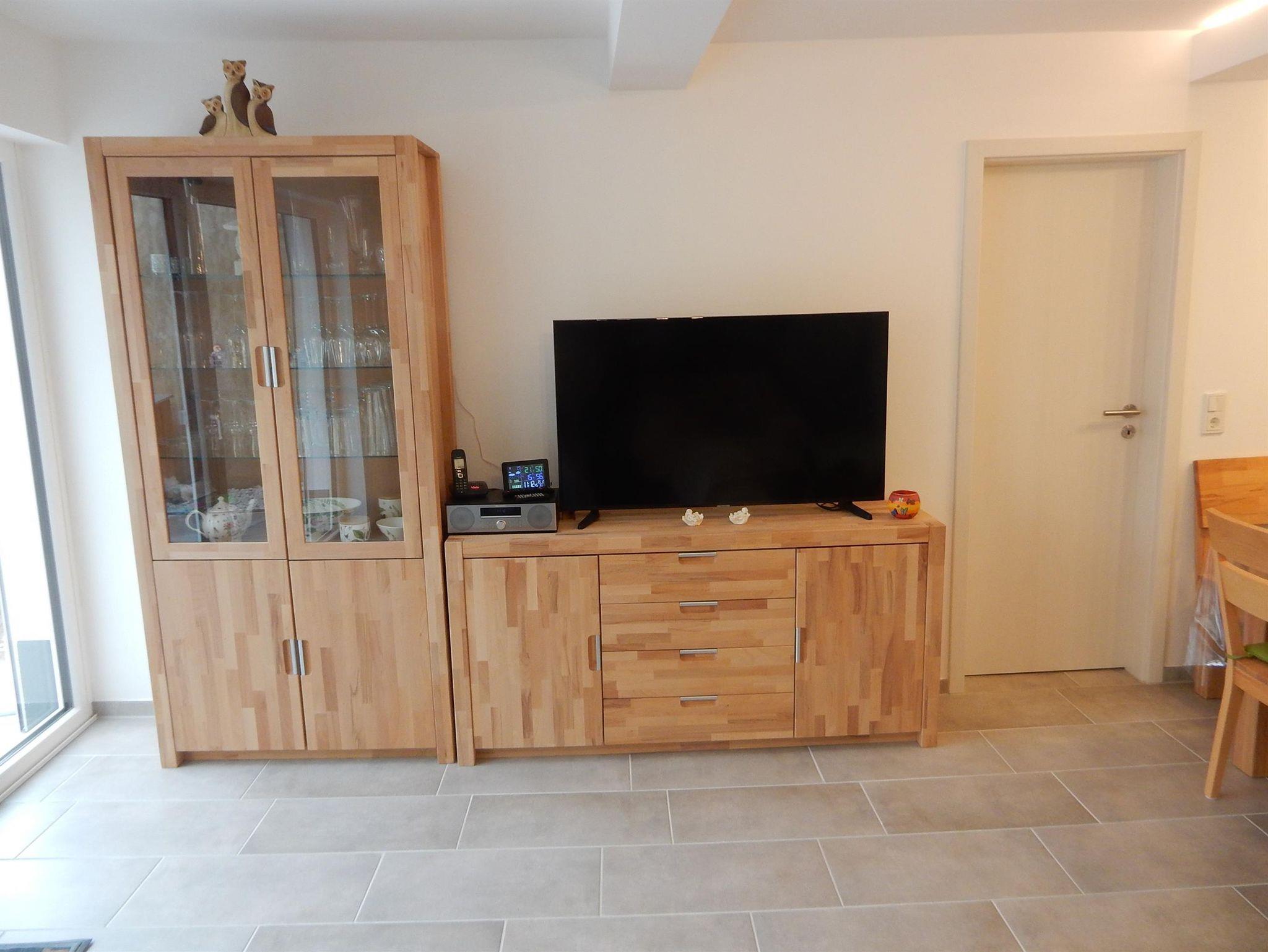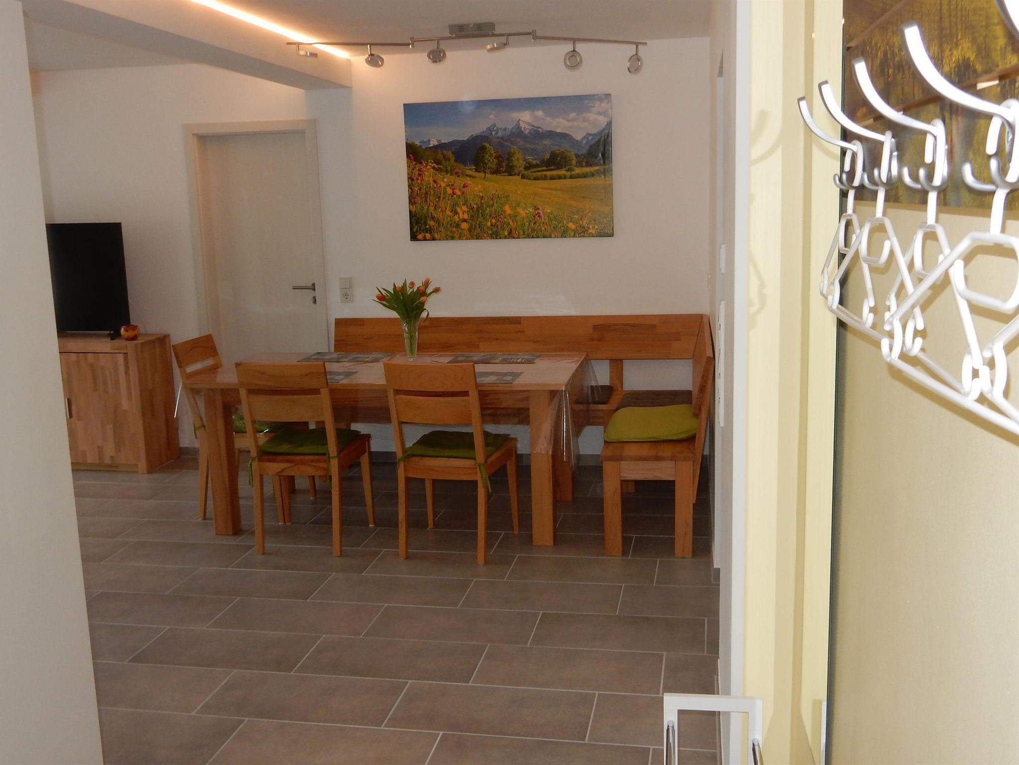 Ess-Wohnzimmer: gemütliche Holzeckbank mit Tisch und 3 Stühlen, bequemes Ledersofa zum Ausziehen, 50er Smart SAT-TV, CD-Radiorecorder sowie diverse Gesellschaftsspiele und Bücher, kostenfreies WLAN und Deutsches Festnetz