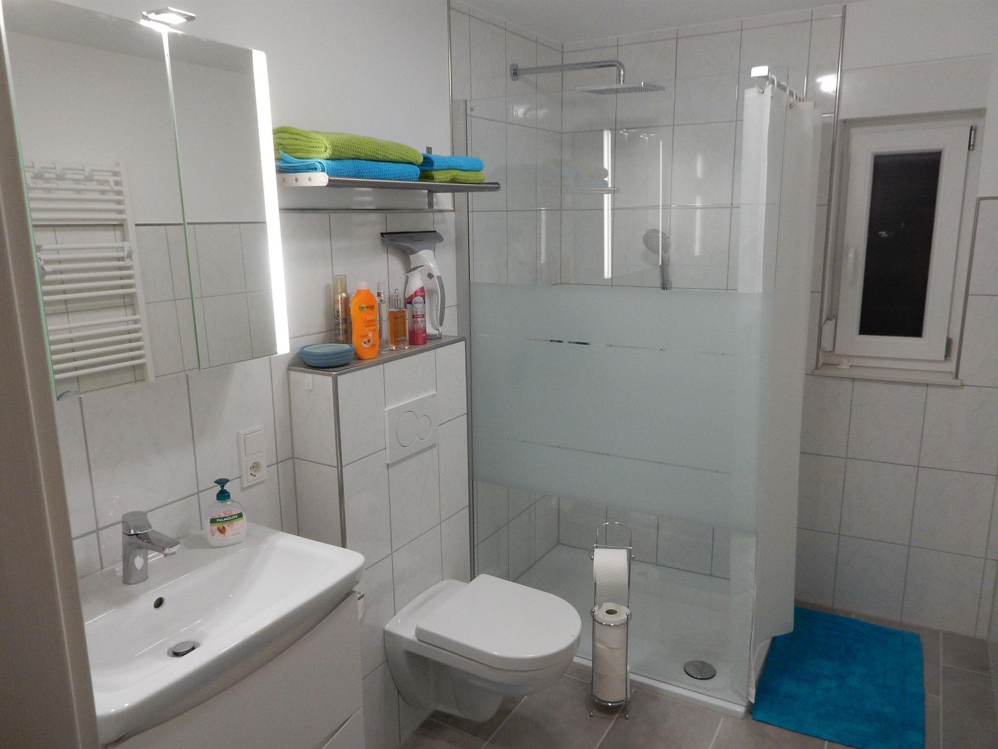 Das Bad Modernes, stilvolles Badezimmer mit Fenster, begehbare Regendusche, WC, Wandheizung für Handtücher, Großer Spiegelschrank, Haartrockner. Gerne stellen wir Ihnen Hand bzw. Duschtücher kostenfrei bereit.