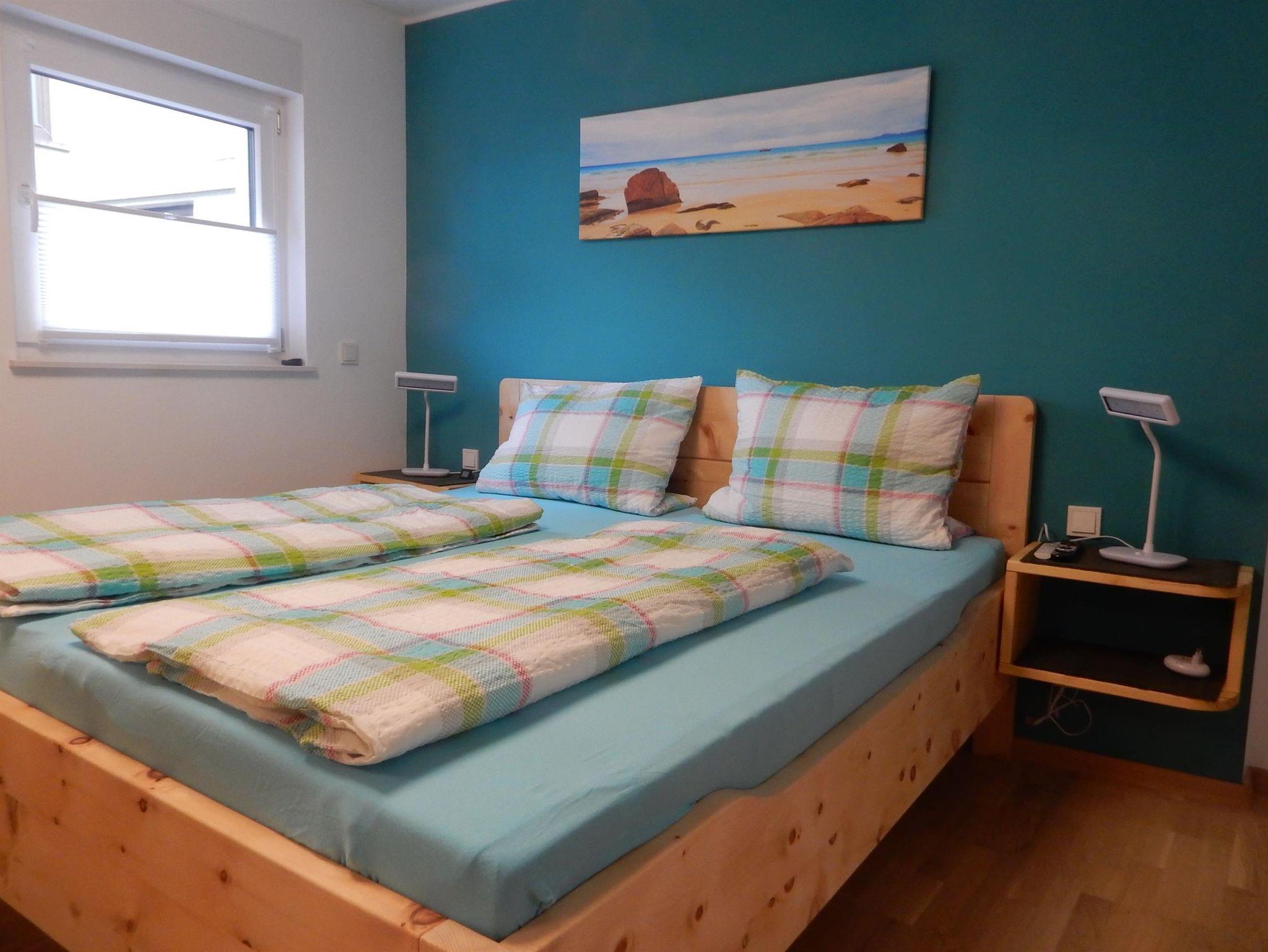 Das Schlafzimmer Wie man sich bettet, so liegt man. Erleben Sie erholsamen Schlaf wie in den Bergen. Original Zirbenholzbett, 180 x 200 m, Zirbenholz hat einen beruhigenden Einfluss auf Herz und Kreislauf, sowie für einen erholsameren Schlaf, 2 atmungsaktive Matratzen 90 x 200 m, nutzbar in Härtegrad 3 oder Härtegrad 4. Die Bettwäsche stellen wir Ihnen kostenfrei zur Verfügung. Allergiker profitieren dank des Holzparkettbodens von einer staubfreien Umgebung.