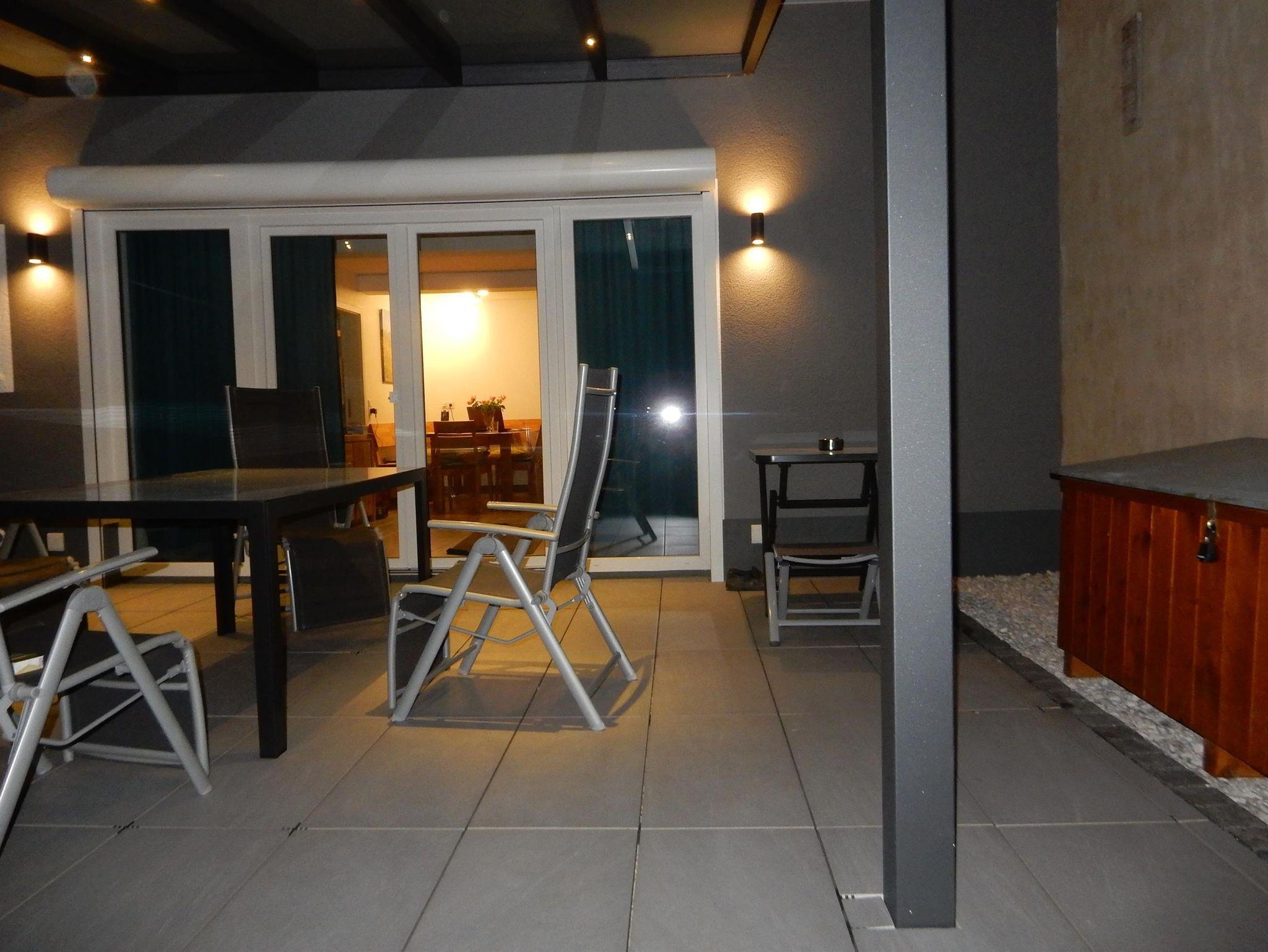Südterrasse Entspannen auf der Südterrasse mit 30 qm, davon 14 qm mit Milchglasüberdachung, Gartenmöbel und Sonnenschirm sind vorhanden.