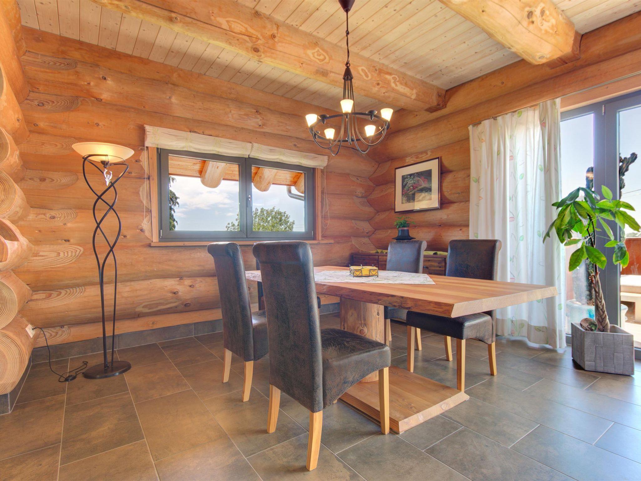 Im Erdgeschoss des Blockhauses bieten wir Ihnen auf 90 qm eine gehobene Ausstattung. Mit der Gestaltung komplett aus Holz, der liebevollen Einrichtung und dem herrlichen Blick ins Grüne fühlt man sich der Natur sehr verbunden. Neben einem Schlafzimmer mit Doppelbett und eigenem Badezimmer finden Sie außerdem eine separate Gästetoilette.