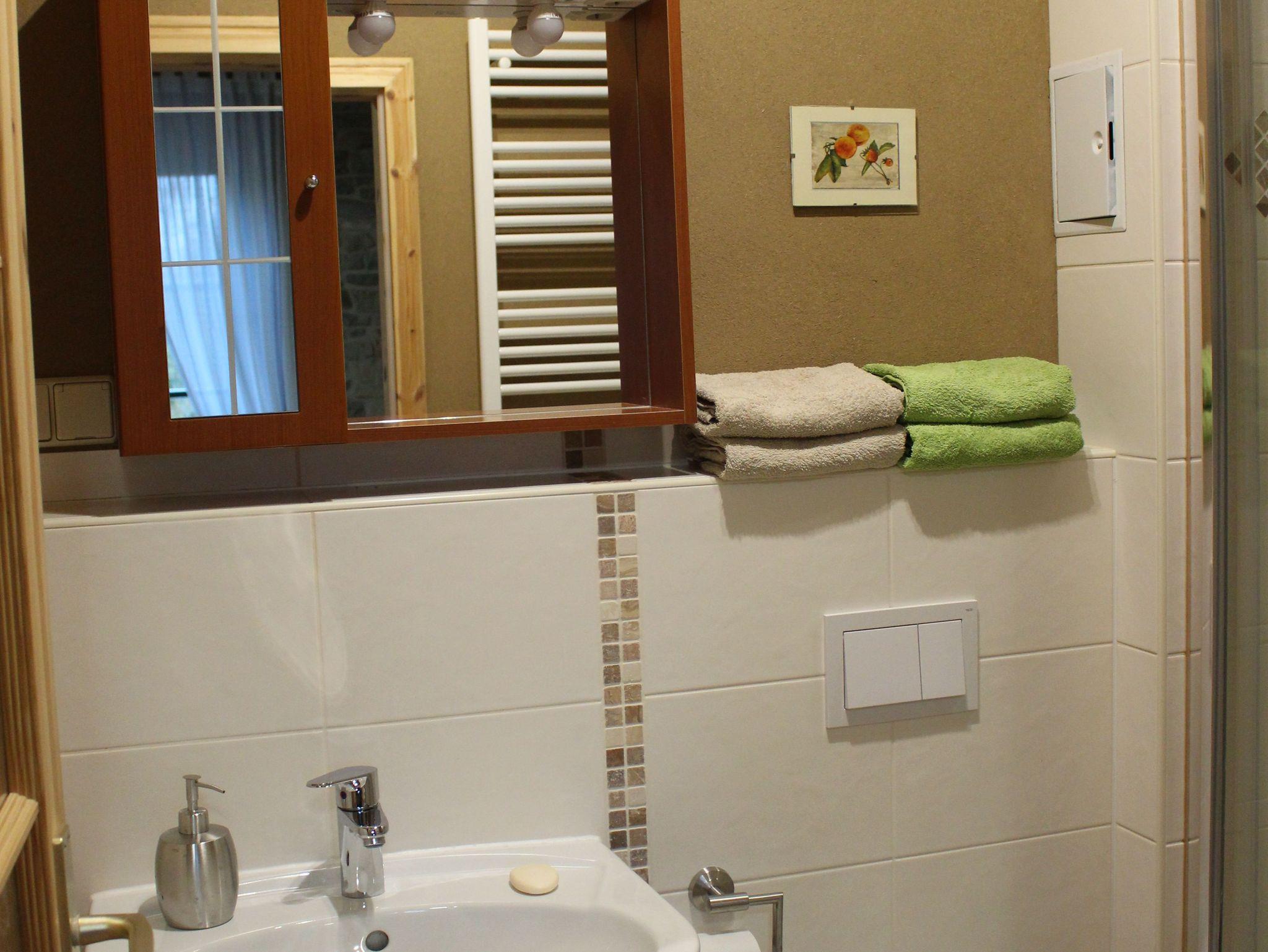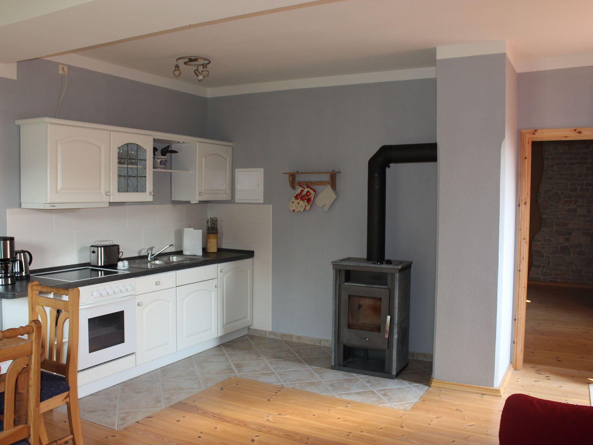 Unsere Ferienwohnung verfügt über eine großzügige Wohnküche mit Kamin, Schlafzimmer, Dusche und WC. Natursteinwände wechseln sich mit Lehmputzwänden ab, was ein angenehmes Wohnklima auch für Allergiker schafft.