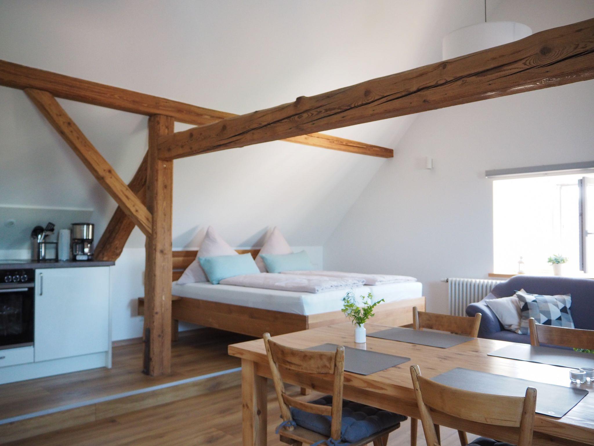 Wasserkocher,Toaster und einer Filterkaffeemaschine ausgestattet. Der Schlafbereich hat ein Doppelbett mit einer Größe von 180x200cm, ein seperates Einzelbett mit 100x200cm steht zusätzlich bereit. Ein Sofa mit Couchtisch und ein Esstisch mit Stühlen lädt zum gemütlichen Wohnen ein. Das neue Bad verfügt über eine Dusche mit Waschbecken und WC. Handtücher sowie Handtuch- und Haartrockner sind vorhanden. Das W-Lan sowie den Parkplatz nutzen Sie kostenlos.