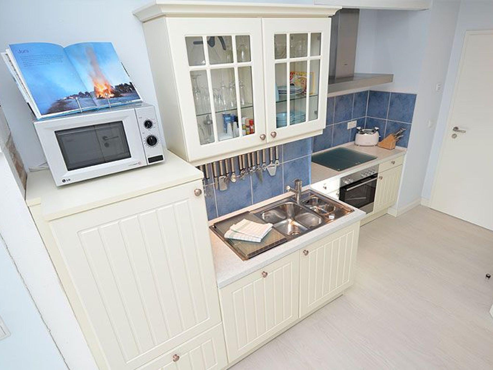 Die Landhausküchenzeile lässt keine Wünsche offen. Hier finden Sie einen Kühlschrank mit Gefrierfach, einen Backofen, ein 4 Platten-Ceranfeld, eine Spülmaschine, sowie Mikrowelle, Toaster, Mixer, einen Eierkocher und diverses Kleininventar, das die Küchenausstattung komplettiert. Der JURA-Kaffeeautomat sorgt auf Knopfdruck für Kaffee satt.
