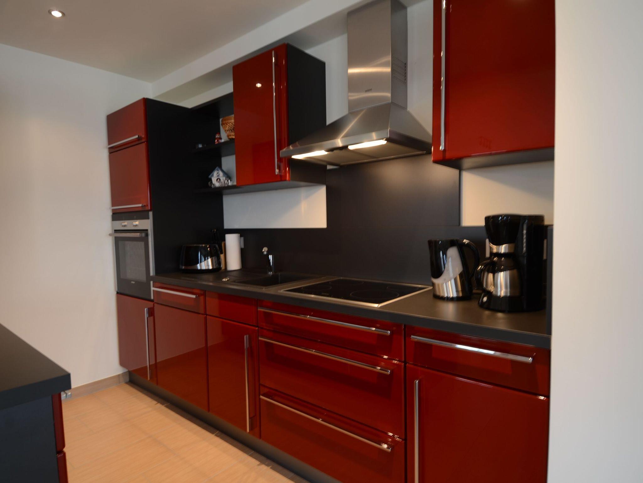 Die voll ausgestattete Küchenzeile verfügt u.a. über einen Kühlschrank mit Gefrierfach, eine Geschirrspülmaschine, ein 4-Zonen-Cerankochfeld mit Backofen, eine Mikrowelle, einen Mixer, eine Kaffeemaschine, einen Wasserkocher, Toaster und diverses Kleininventar, das die sehr gute Ausstattung komplettiert.