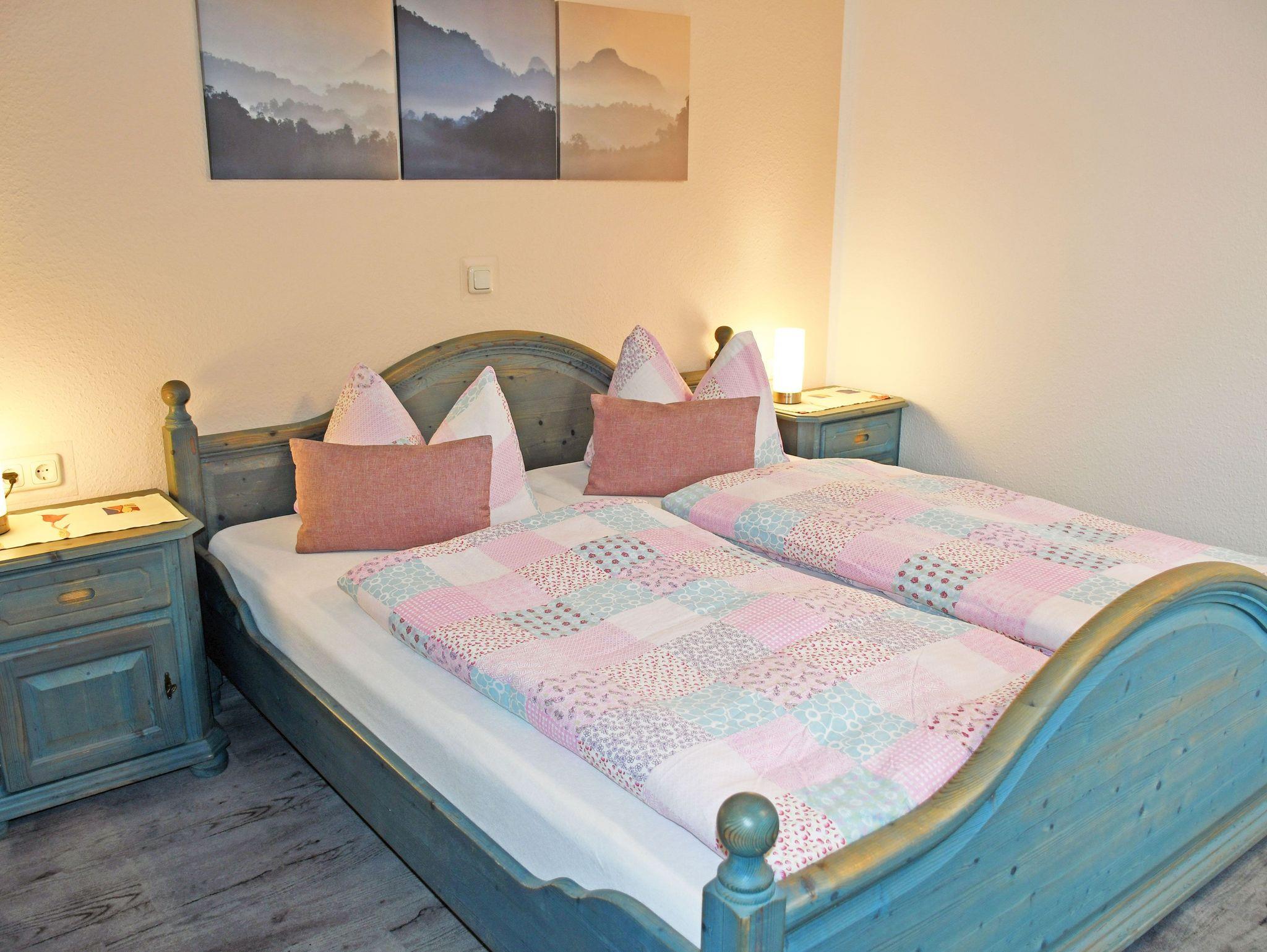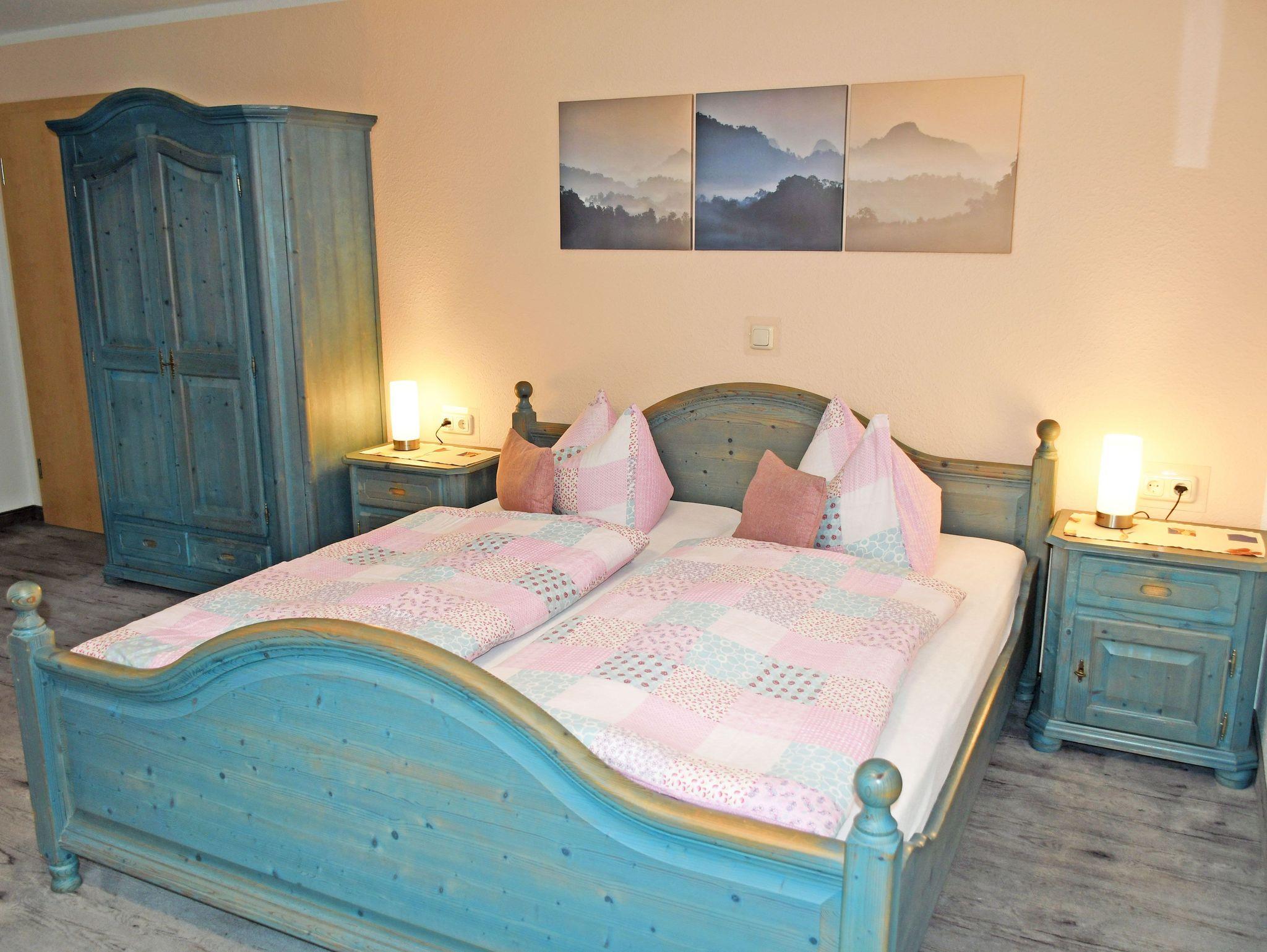 Unsere modern eingerichteten Doppelzimmer (21 qm) sind mit rustikalen Bauernmöbeln komfortabel ausgestattet und in den Farben Blau oder Grün gehalten. Zur Ausstattung gehören bequeme Doppelbetten mit Nachttischen und Leselampen, Sitzmöbel mit Tisch, Kleiderschrank, Kühlschrank, Wasserkocher, Flachbild-TV und Radio. Tassen und Löffel sind ebenfalls vorhanden. Separat für alle Gäste haben wir Geschirr, wie Teller, Teetassen sowie Besteck und Geschirrhandtücher. Ab 2016 gibt es auch einen kostenlosen WLAN-Anschluss. Bei Ihrer Anreise liegen frische Handtücher bereit und die Betten sind selbstverständlich bereits mit Bettwäsche bezogen. Alle Zimmer verfügen über ein separates Bad mit Tageslicht, Dusche und WC. In unserem Frühstücksraum starten Sie den Tag mit einem ausgiebigen Frühstück vom reichhaltigem Buffet. Wir halten auch eine Auswahl an Getränken für Sie bereit.