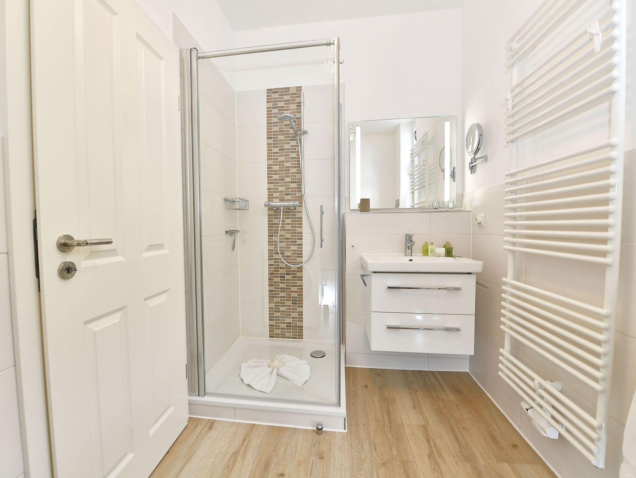 Das modern geflieste Badezimmer verfügt über Dusche, WC, einen beleuchteten Waschtisch nebst Kosmetikspiegel und einen beheizbaren Handtuchtrockner. Eine Waschmaschine, Bügelutensilien und ein kleiner Safe stehen Ihnen darüber hinaus ebenfalls kostenfrei zur Verfügung.