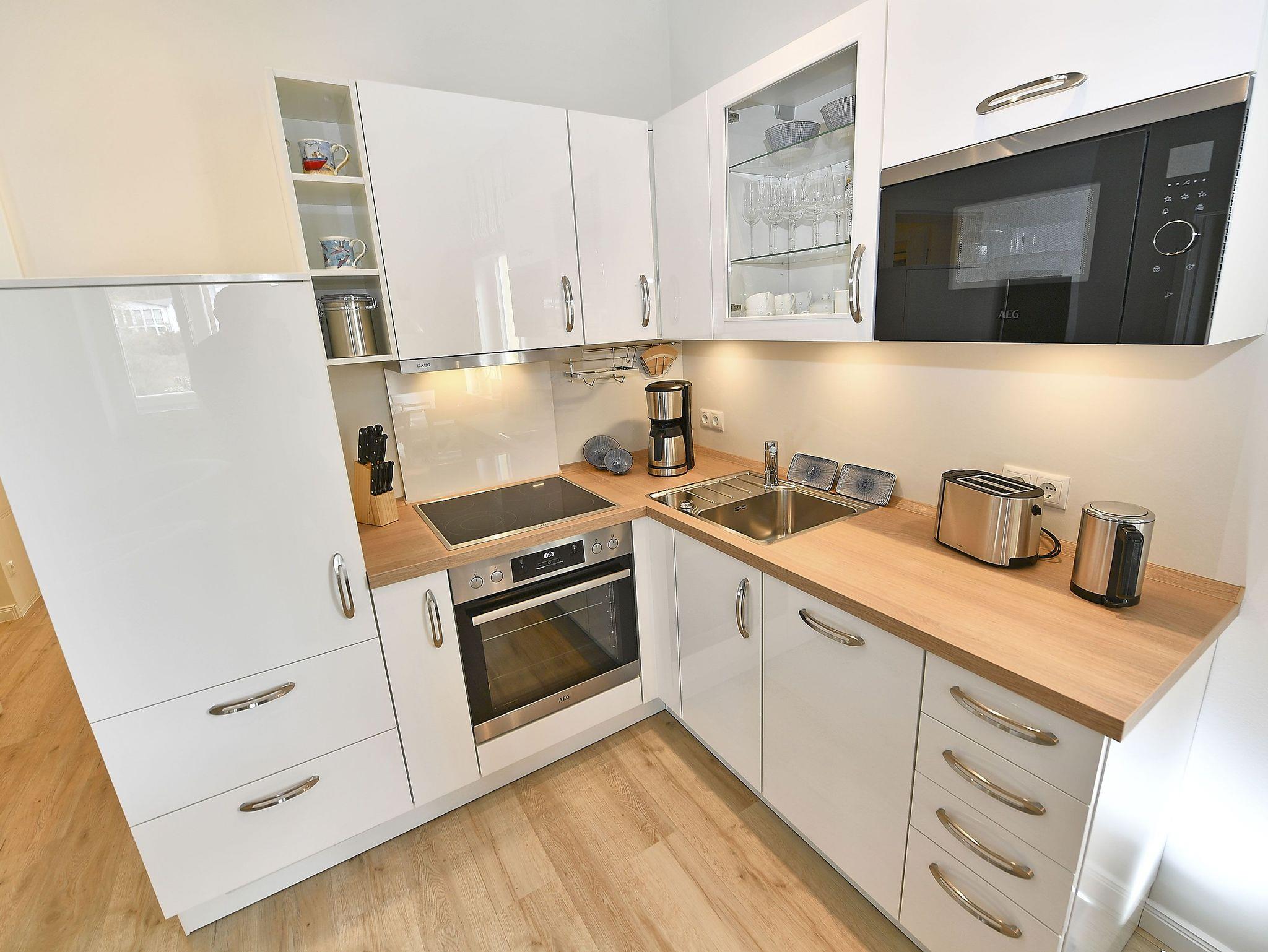Vom Eingangsbereich gelangen Sie in den modern und freundlich eingerichteten Wohn- und Essbereich, der mit einem 43? Flachbild-Fernseher und einer Stereoanlage mit CD-Player ausgestattet ist. Die in den Wohnbereich harmonisch integrierte Küche ist mit Herd (Backofen, Grill), Einbau-Mikrowelle, Geschirrspüler, Kaffeemaschine, Toaster, Eierkocher, Wasserkocher und einem Kühlschrank mit 4* Gefrierfach sowie diversem Kleininventar, das die Küchenausstattung komplettiert, eingerichtet.