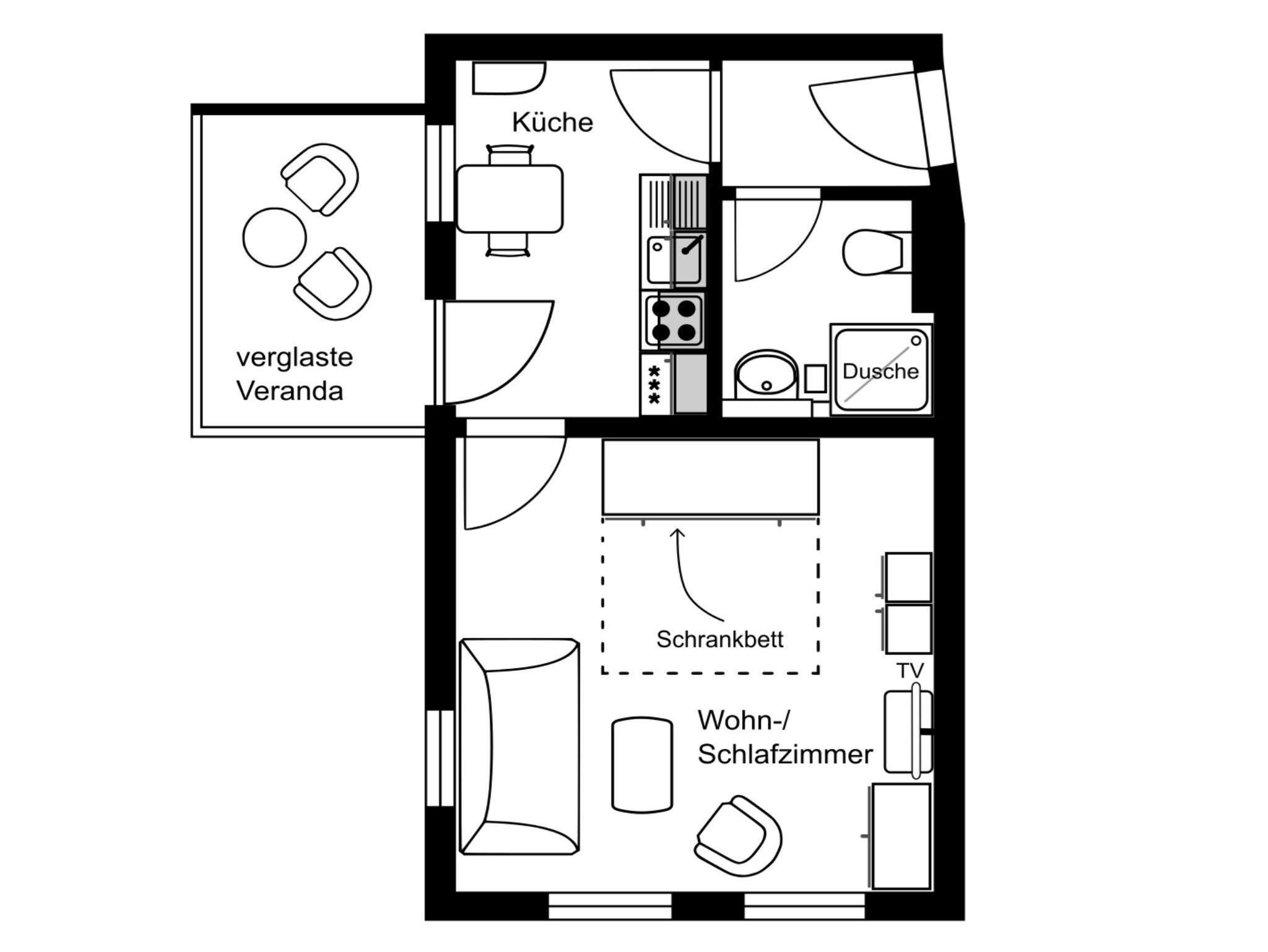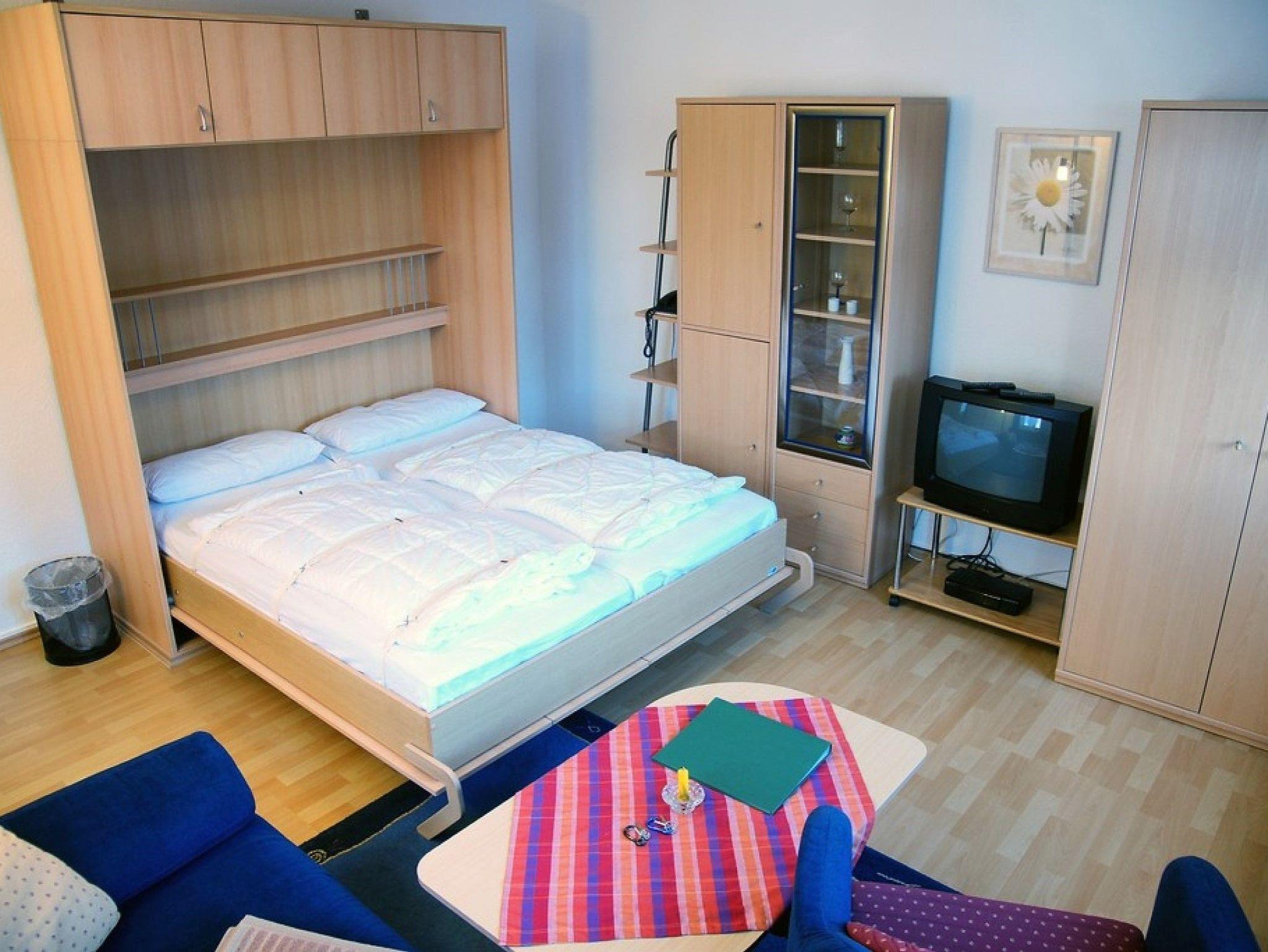 • kombiniertes Wohn-/Schlafzimmer mit Schrankbett, Couch sowie Flachbild-TV