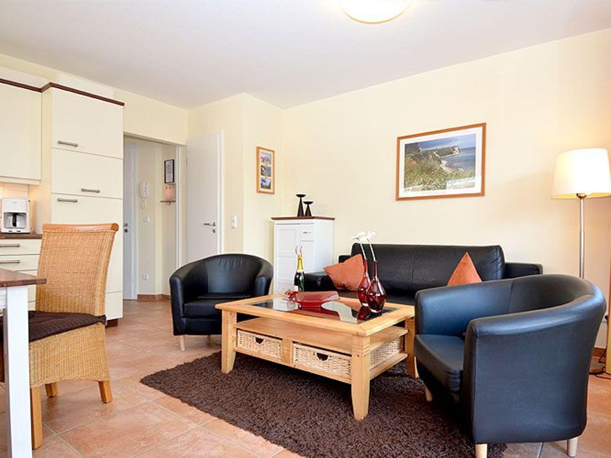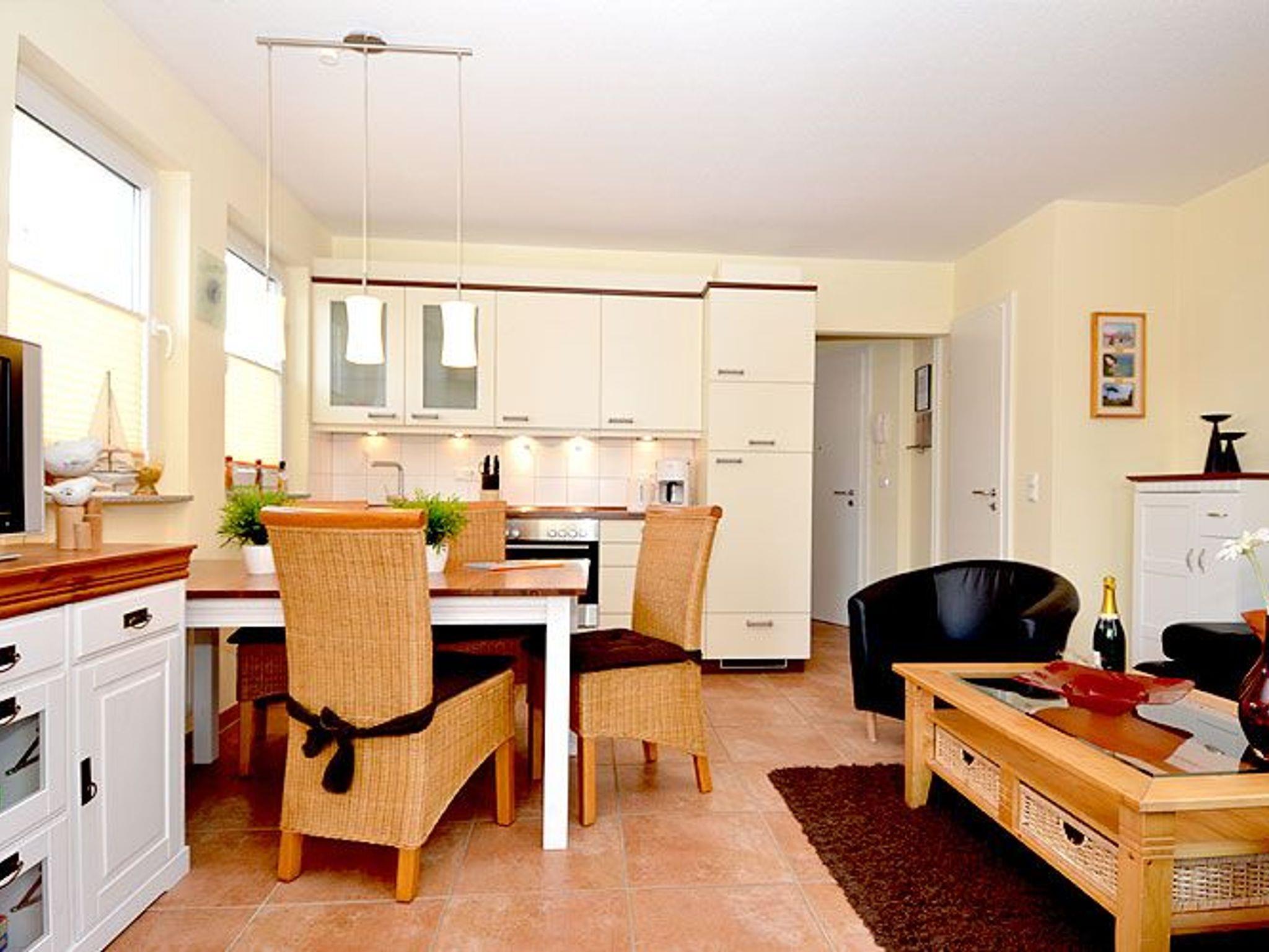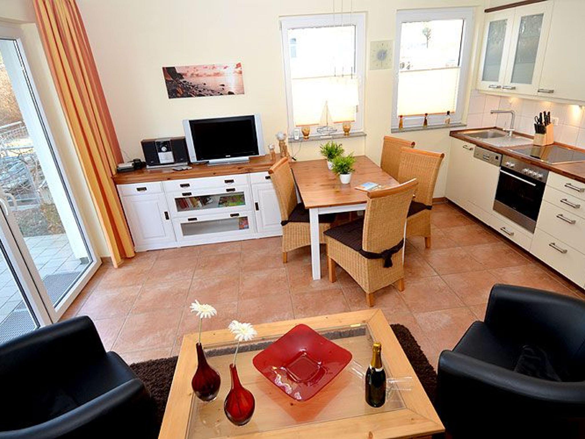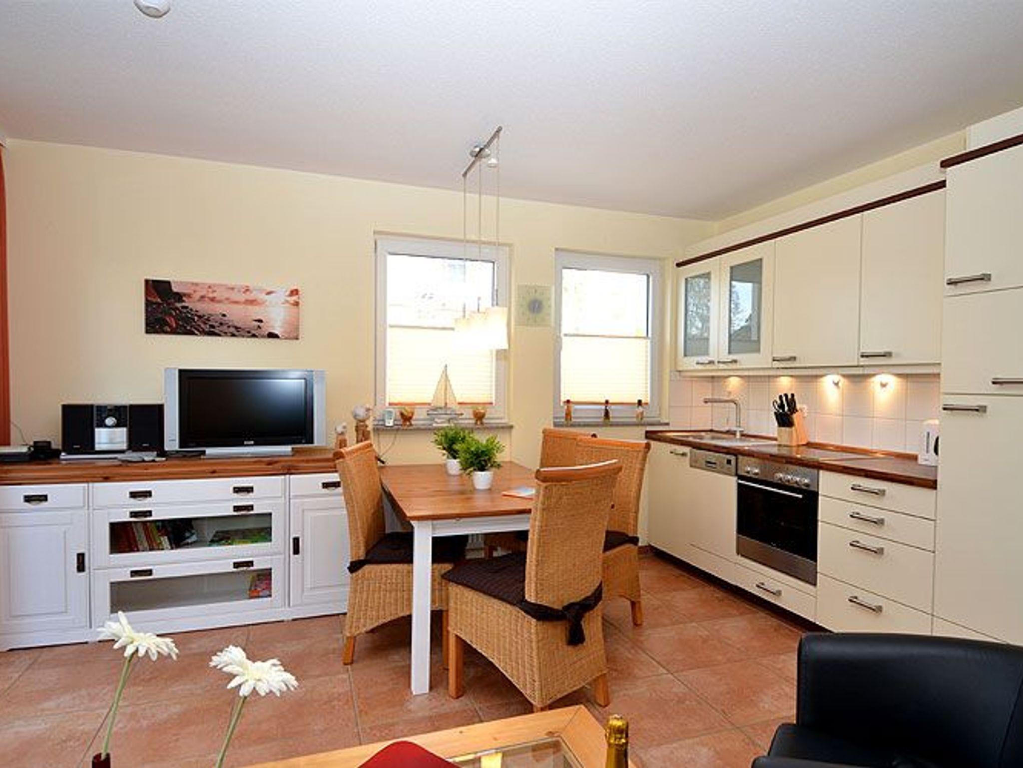 Die Nichtraucher-Wohnung bietet ein geräumiges Wohnzimmer mit einer bequemen Schlafcouch, einem Esstisch und einer Küchenzeile die keine Wünsche offen lässt. Sie finden hier eine Spülmaschine, eine Mikrowelle, einen Kühlschrank, 4-Platten-Ceranfeld, einen Backofen und diverse Kleingeräte, die die Ausstattung komplettieren.