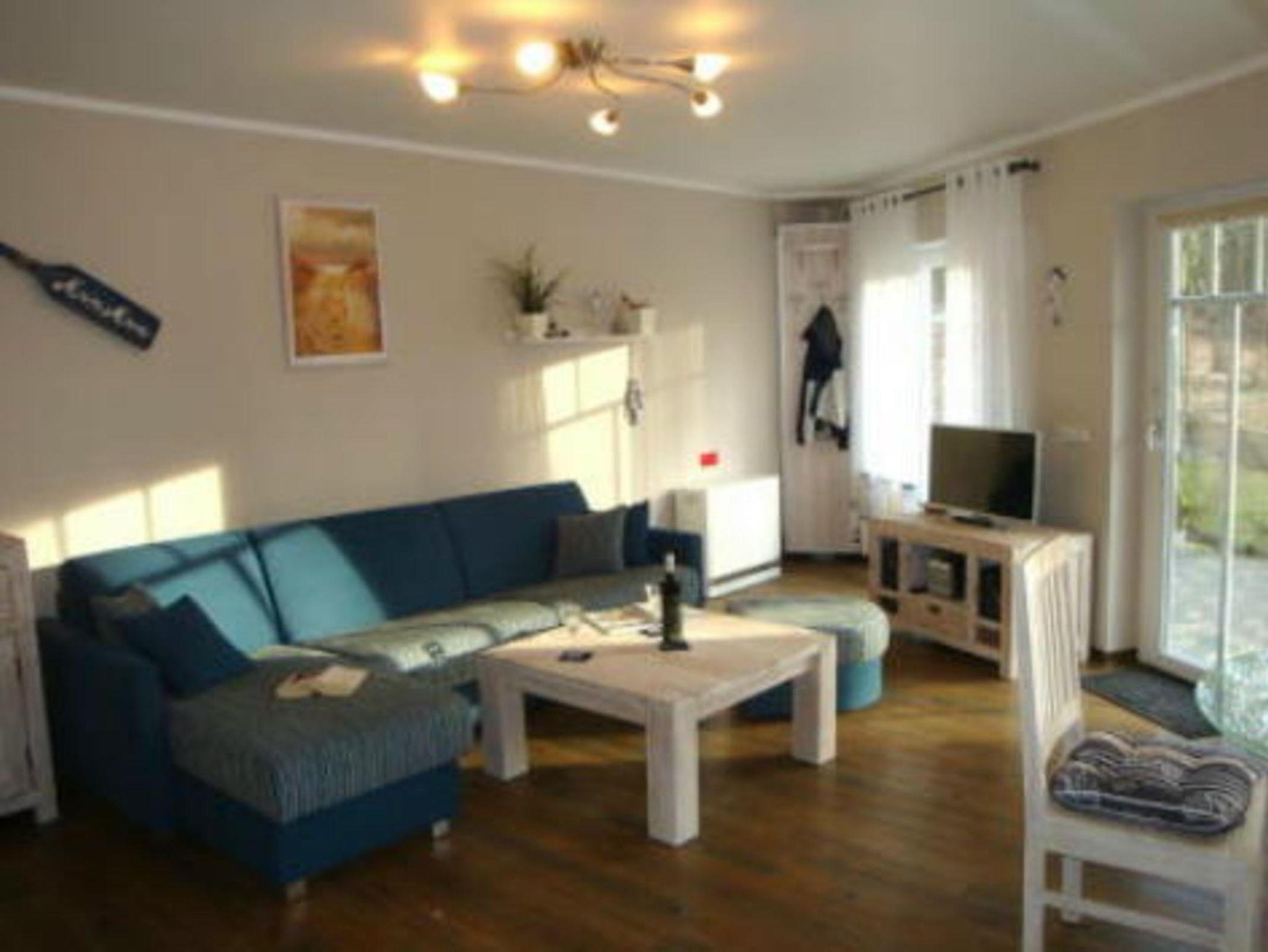 Die Ferienwohnung befindet sich im Erdgeschoß und ist für 2-4 Personen geeignet. Die 2-Raum Wohnung hat ein Wohnzimmer mit Sitzecke (Eckcouch), Essplatz und eine sehr gut ausgestattete Küchenzeile. Zur Küchenausstattung gehören der Kühlschrank mit Gefrierfach, eine Mikrowelle, Herd mit Backofen, Kaffeemaschine, Brotschneidemaschine, Toaster, Wasserkocher.