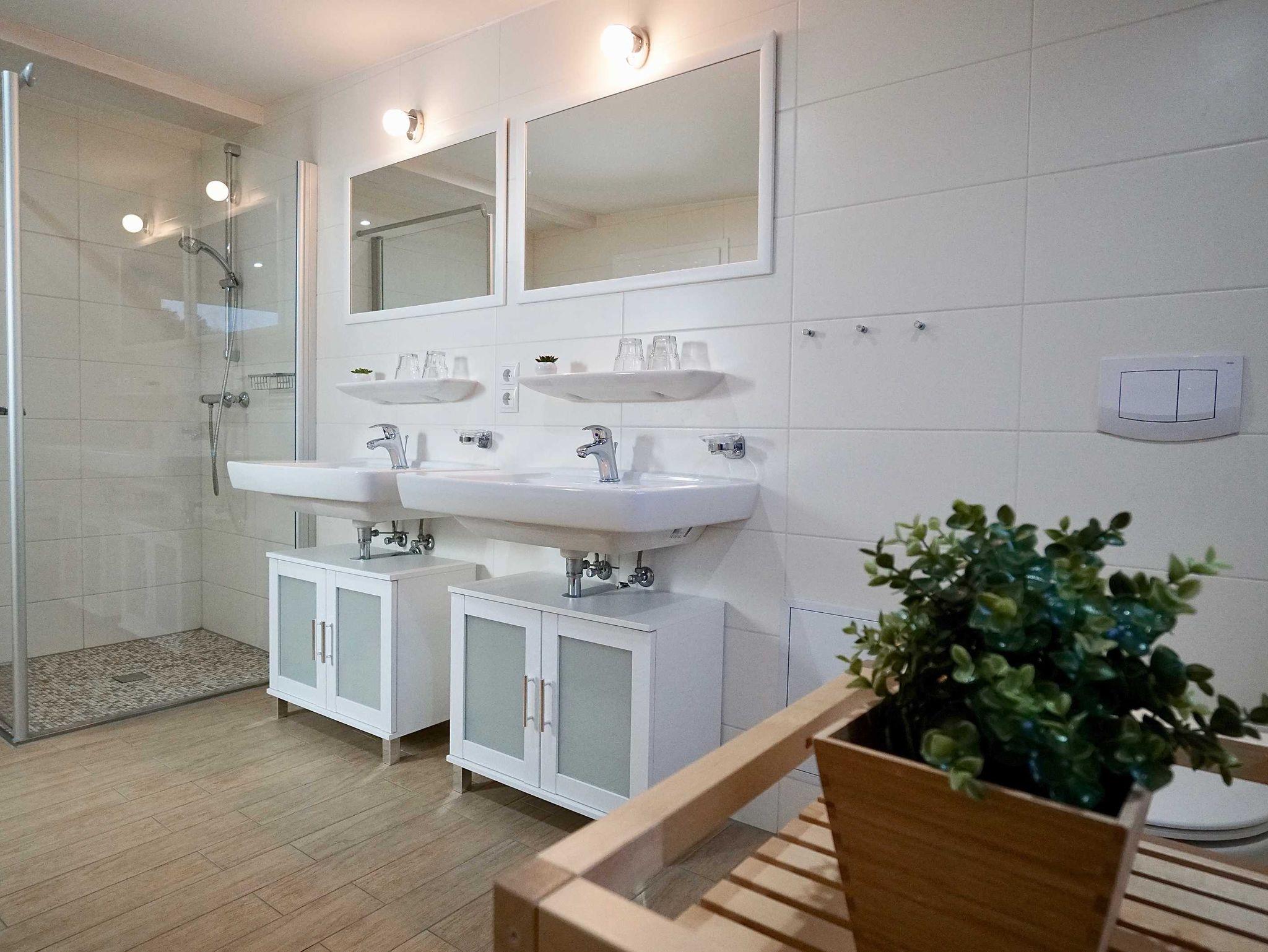 Starten Sie hier idyllisch in Ihren Urlaubstag und genießen Sie ein leckeres Frühstück direkt auf Ihrem Balkon. Die Ausrichtung der Balkone sind nach Süd bzw. Nord. Eine Treppe führt Sie direkt in den Küchenbereich, in dem die große Küchenzeile über alles verfügt, was das Herz zum Kochen begehrt. Nutzen Sie den Backofen sowie das moderne 4-Platten-Cerankochfeld und lassen Sie doch den Geschirrspüler das Abwaschen übernehmen. Am großzügigen Esstisch finden alle Gäste dieser Wohnung bequem Platz. Von hier aus erreichen Sie auch die beiden separaten Schlafzimmer, die jeweils mit einem bequemen Doppelbett und einem großen Kleiderschrank ausgestattet sind. Ebenso grenzt hier das Tageslicht durchflutete, moderne Bad mit 2 Waschbecken, WC und ebenerdiger Dusche an.