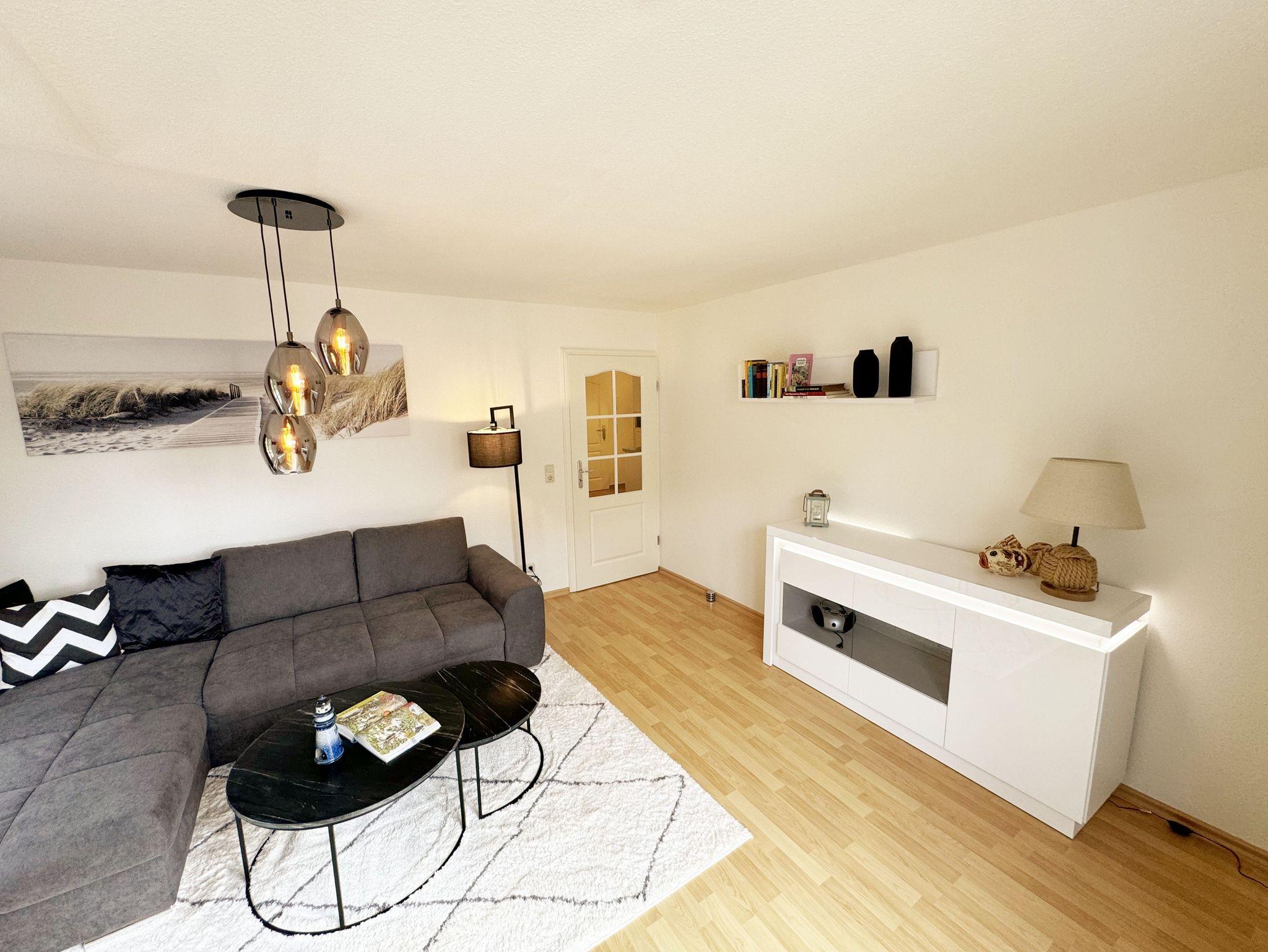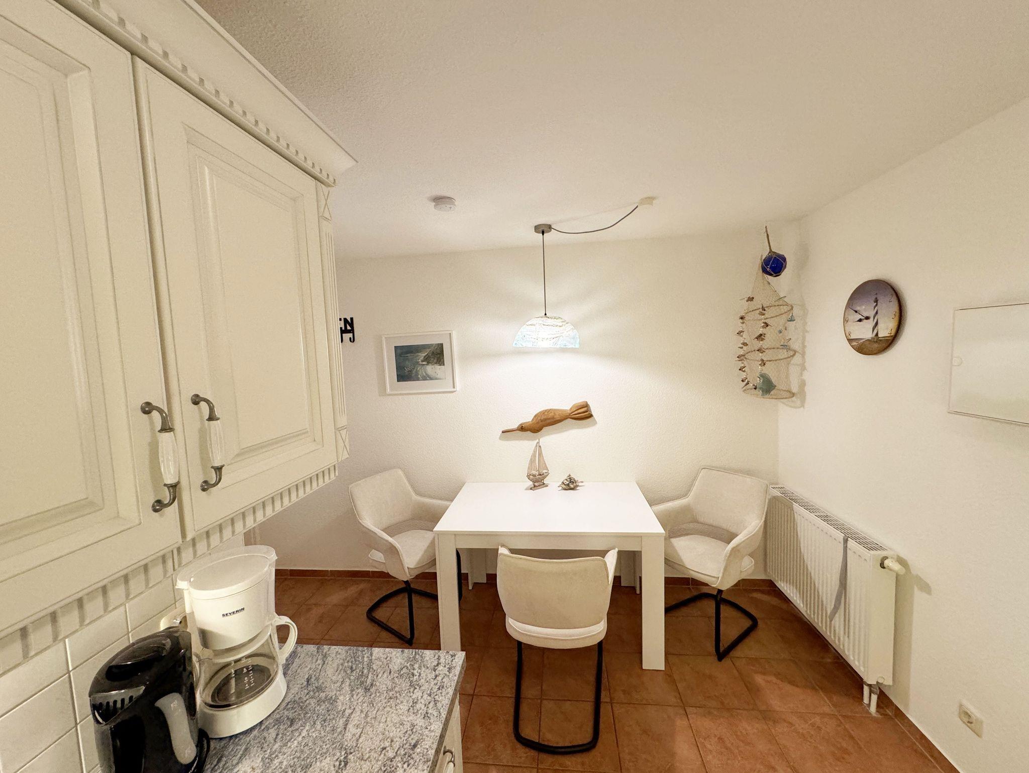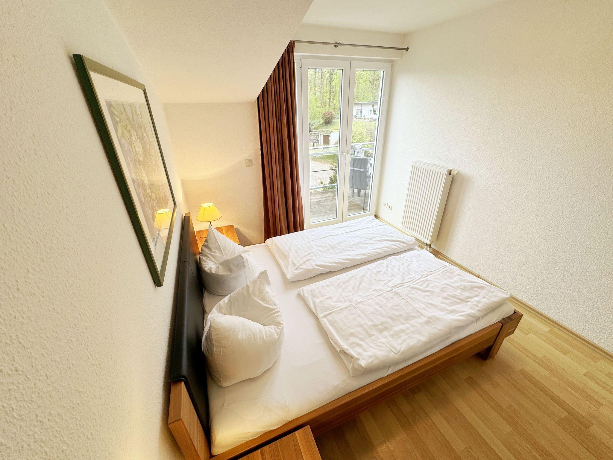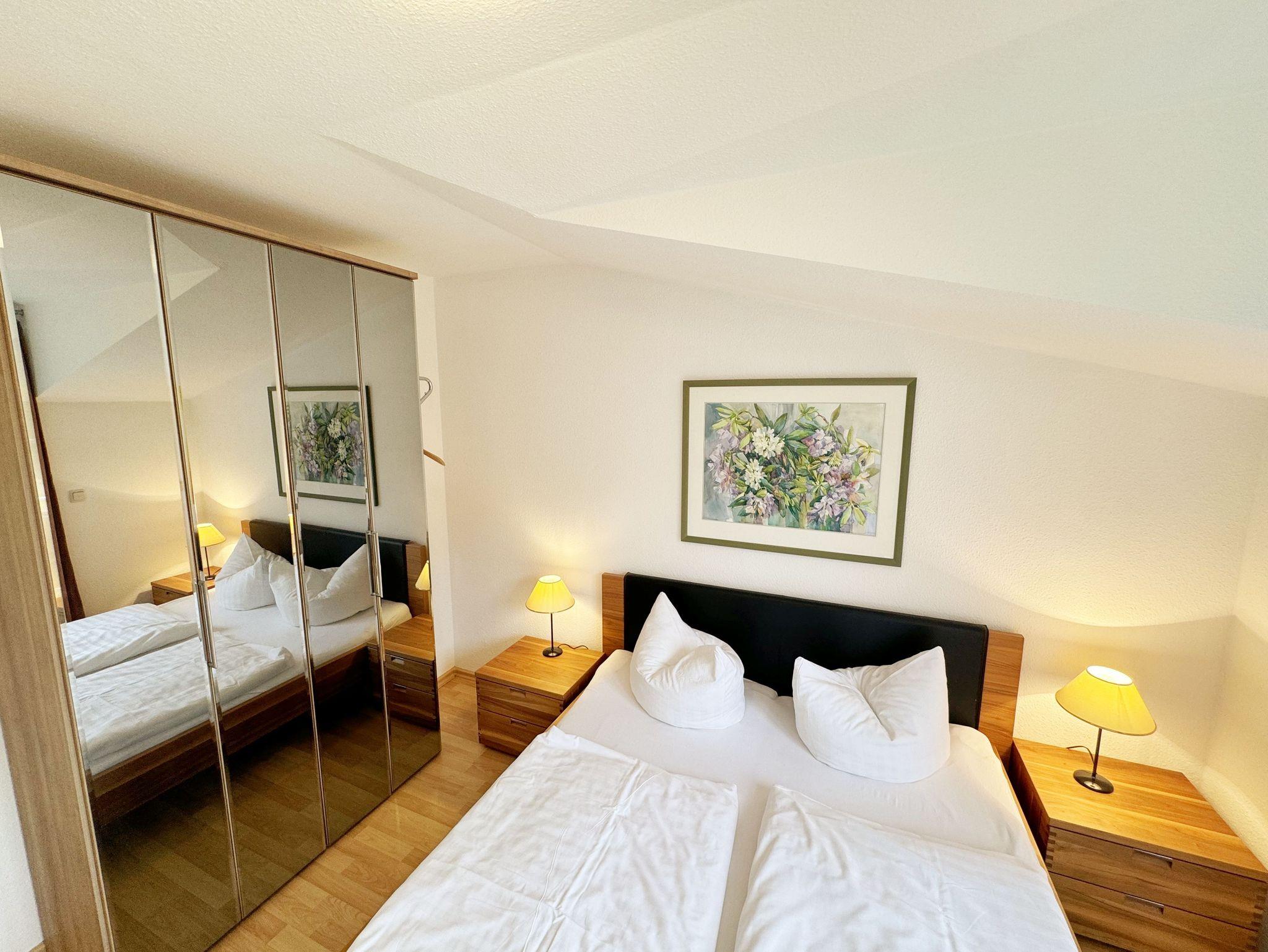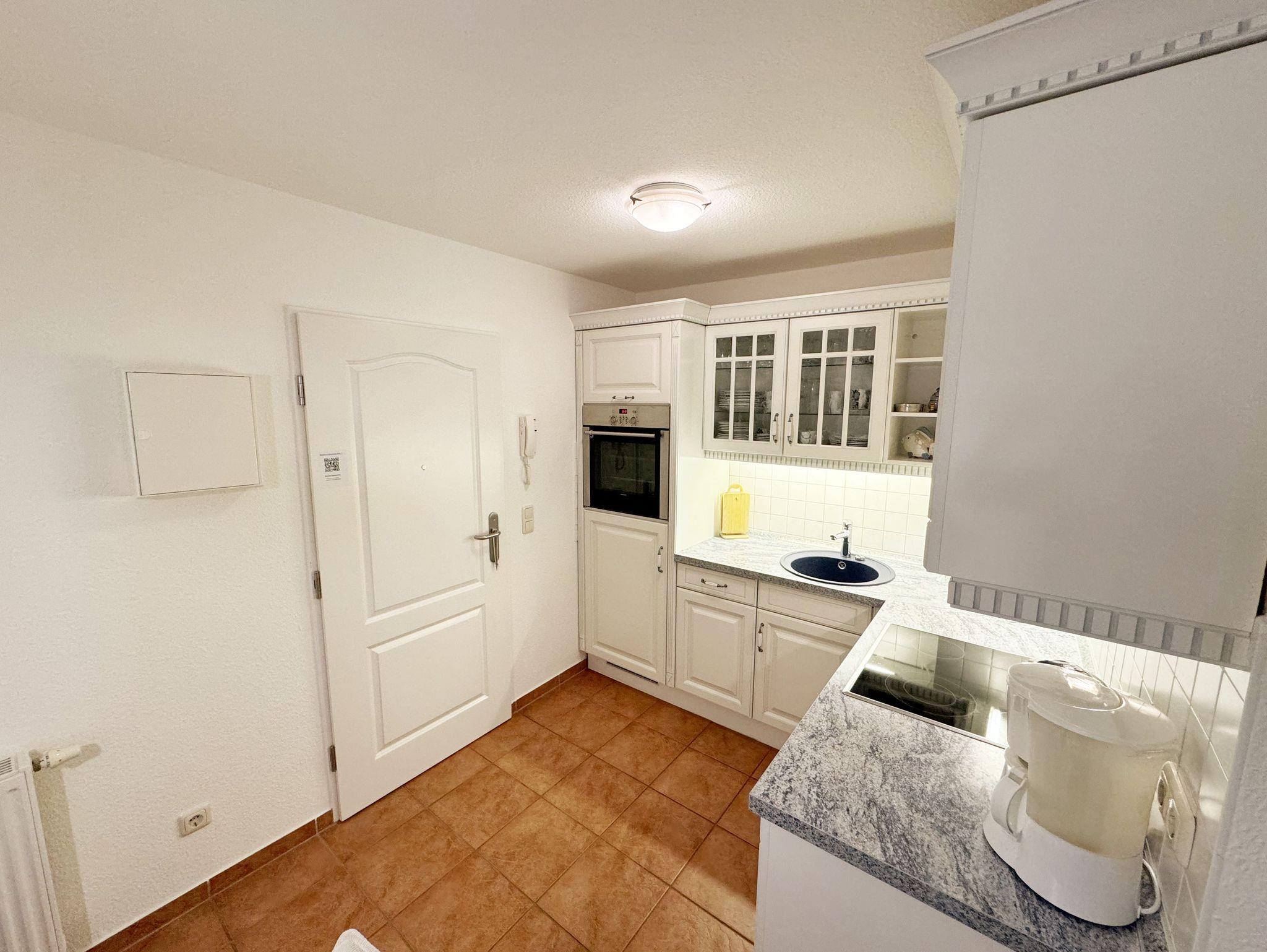 Die ruhig gelegene Nichtraucherwohnung befindet sich in der 1. Etage. Sie bietet Ihnen mit ca. 48 qm ausreichend Platz für 3 Erw. und 1 Kind bis 3 Jahre im Kinderreisebett. Der mit Laminat verlegte Wohnbereich ist durch seine bodentiefen Fenster sehr hell und verfügt über eine Couchecke (Aufbettung für 3. Person /1,30m x 1,90m) mit Couchtisch, einen Sessel, eine Anrichte sowie einen TV-Schrank mit Flachbildschirm. Von hier aus gelangen Sie auf den bestuhlten Balkon (Süd/Ost). Ein Internetanschluss (WLAN) ist für Sie vorhanden. Dieser ist inklusive! Das Doppelbett (1,60m x 2,00m) mit Nachttischkonsolen und ein großzügiger Kleiderschrank runden das Schlafzimmer ab. Auch von hier aus können Sie den Zugang auf den Balkon wählen. In der komplett eingerichteten Küchenzeile finden Sie ein Ceranfeld, einen Backofen auf Augenhöhe, Geschirrspüler, Kühlschrank, Kaffeemaschine, Wasserkocher, Toaster und diversen Küchenutensilien sowie einen Esstisch mit 3 Stühlen. Das geflieste Badezimmer weist eine Dusche, Waschtisch und ein WC vor. Ein Tiefgaragenstellplatz (Nr. 14, Einfahrtshöhe 2,00m) ist für Ihren Pkw reserviert. Die Erstausstattung eines Wäschepaketes (komplette Bettwäsche, 1 Duschhandtuch, 1 kleines Handtuch) können Sie bis 14 Tage vor Anreise gegen einen Aufpreis dazu buchen oder durch eigene ergänzen. Ab 2 gebuchten Paketen erhalten Sie einmalig 1 Geschirrhandtuch und 1 Duschvorleger hinzu.