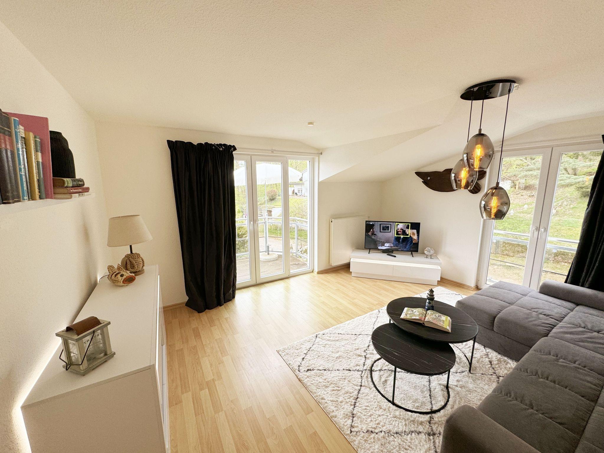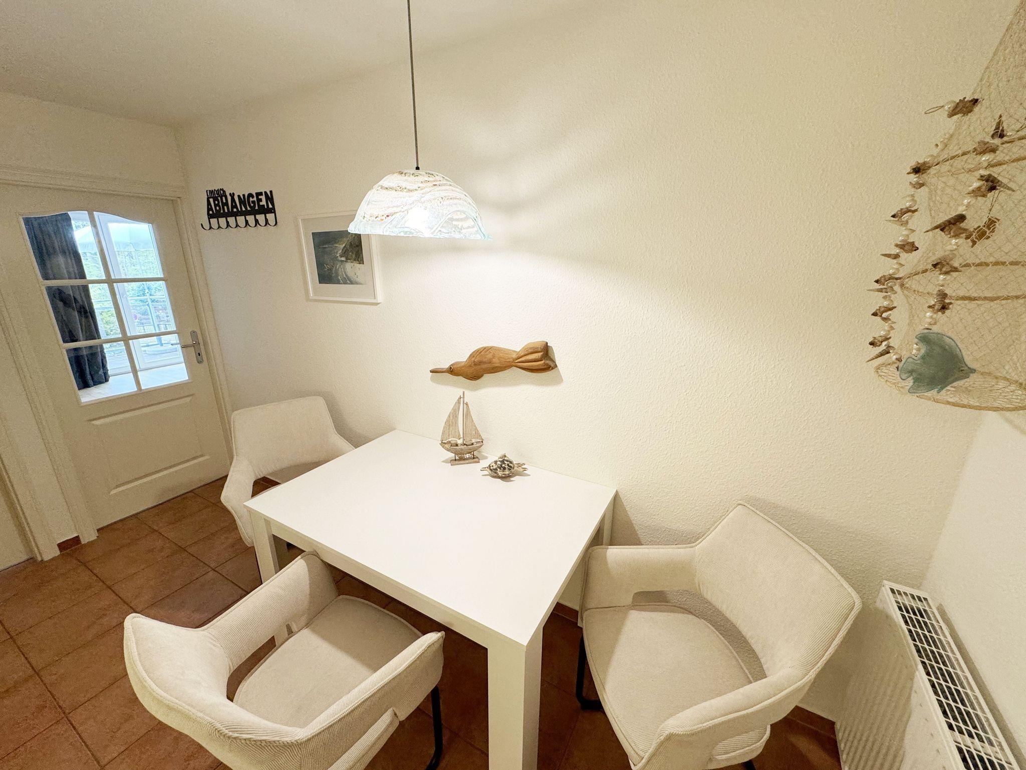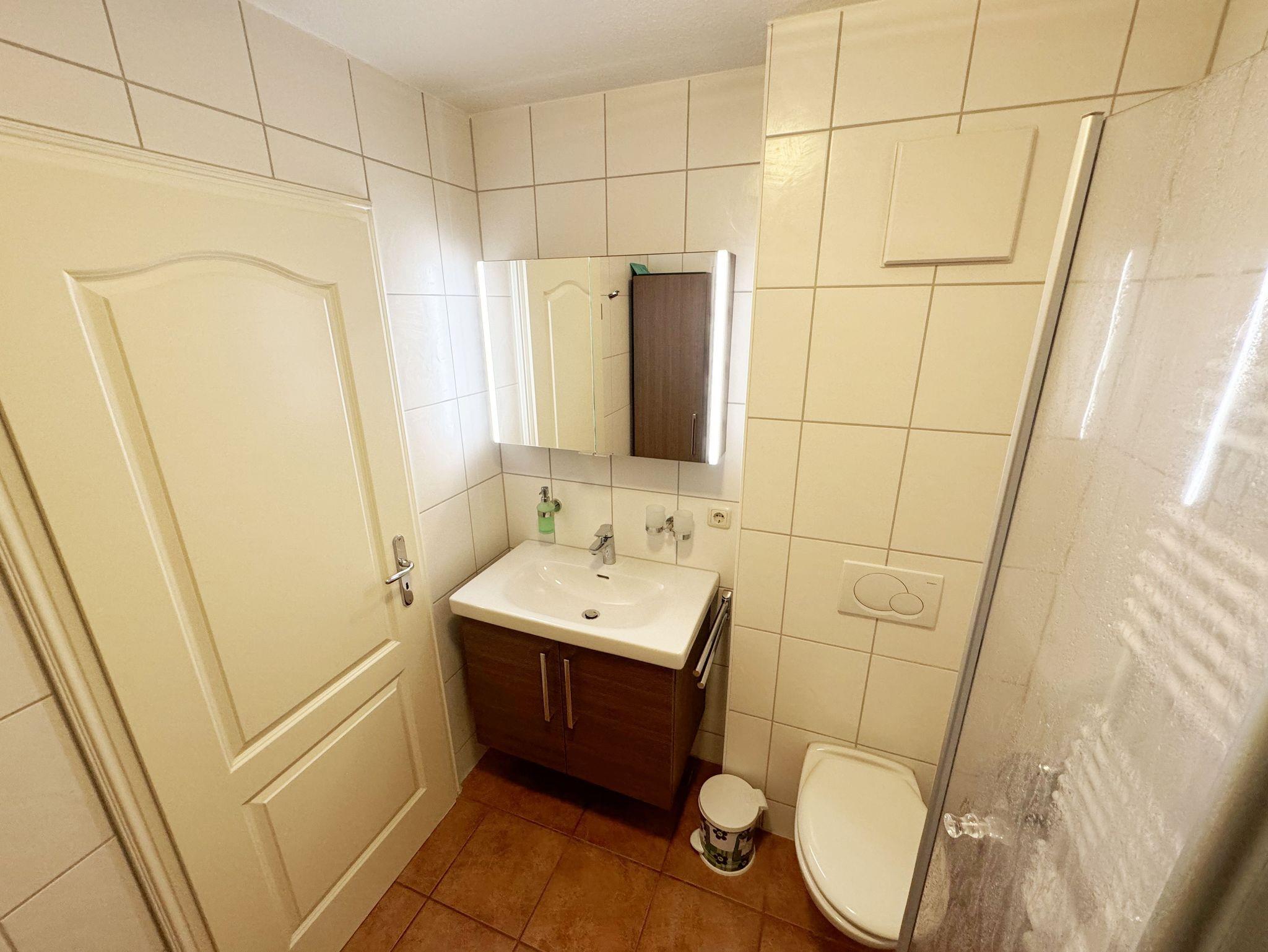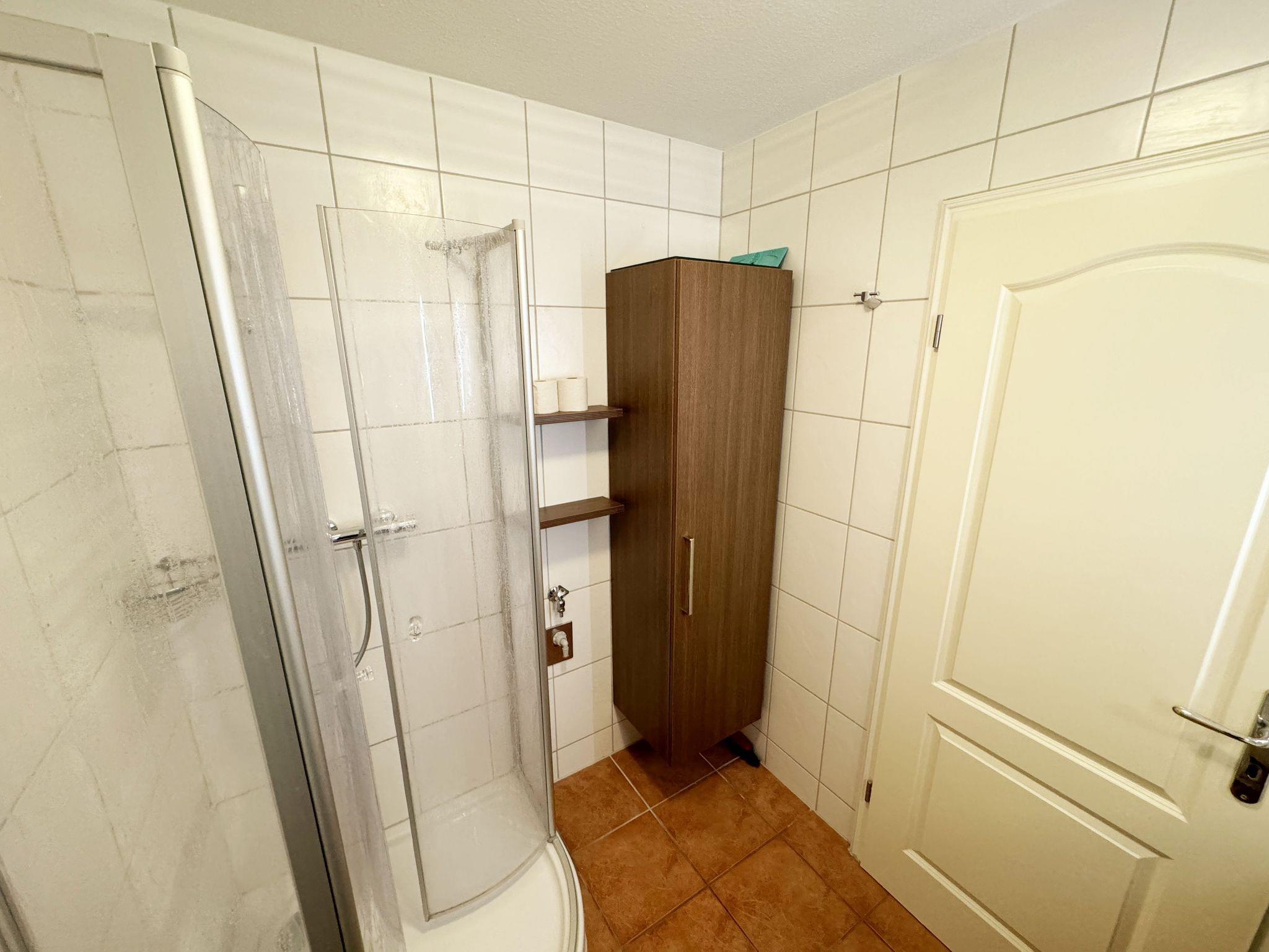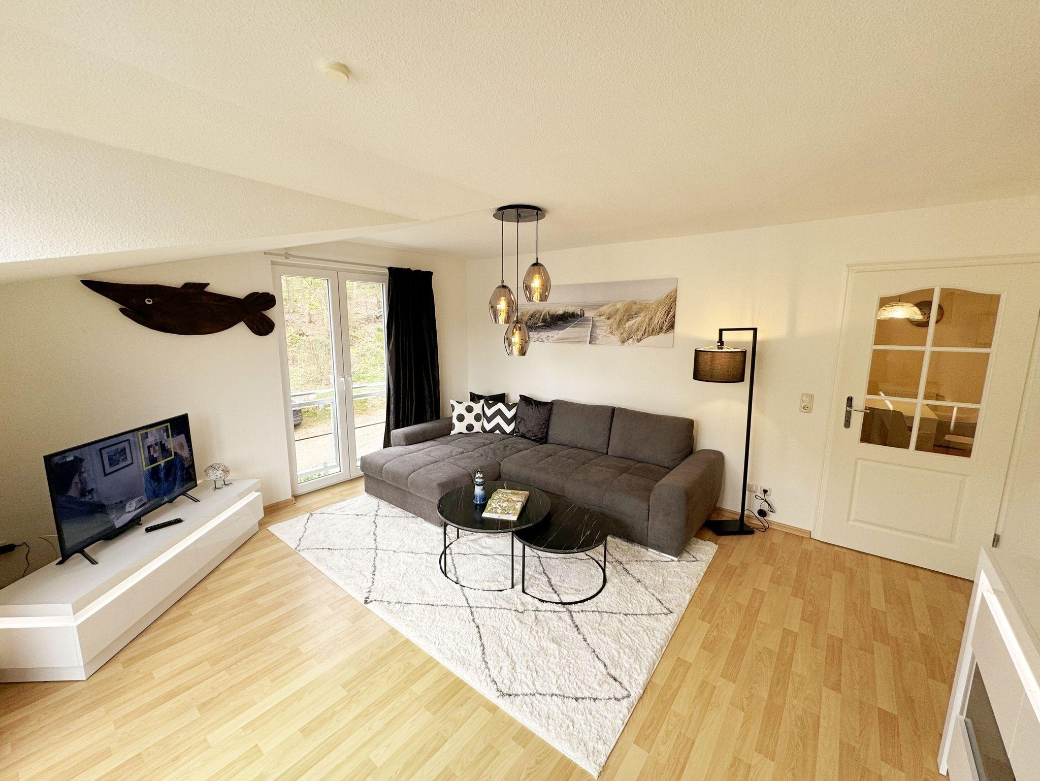 Die ruhig gelegene Nichtraucherwohnung befindet sich in der 1. Etage. Sie bietet Ihnen mit ca. 48 qm ausreichend Platz für 3 Erw. und 1 Kind bis 3 Jahre im Kinderreisebett. Der mit Laminat verlegte Wohnbereich ist durch seine bodentiefen Fenster sehr hell und verfügt über eine Couchecke (Aufbettung für 3. Person /1,30m x 1,90m) mit Couchtisch, einen Sessel, eine Anrichte sowie einen TV-Schrank mit Flachbildschirm. Von hier aus gelangen Sie auf den bestuhlten Balkon (Süd/Ost). Ein Internetanschluss (WLAN) ist für Sie vorhanden. Dieser ist inklusive! Das Doppelbett (1,60m x 2,00m) mit Nachttischkonsolen und ein großzügiger Kleiderschrank runden das Schlafzimmer ab. Auch von hier aus können Sie den Zugang auf den Balkon wählen. In der komplett eingerichteten Küchenzeile finden Sie ein Ceranfeld, einen Backofen auf Augenhöhe, Geschirrspüler, Kühlschrank, Kaffeemaschine, Wasserkocher, Toaster und diversen Küchenutensilien sowie einen Esstisch mit 3 Stühlen. Das geflieste Badezimmer weist eine Dusche, Waschtisch und ein WC vor. Ein Tiefgaragenstellplatz (Nr. 14, Einfahrtshöhe 2,00m) ist für Ihren Pkw reserviert. Die Erstausstattung eines Wäschepaketes (komplette Bettwäsche, 1 Duschhandtuch, 1 kleines Handtuch) können Sie bis 14 Tage vor Anreise gegen einen Aufpreis dazu buchen oder durch eigene ergänzen. Ab 2 gebuchten Paketen erhalten Sie einmalig 1 Geschirrhandtuch und 1 Duschvorleger hinzu.