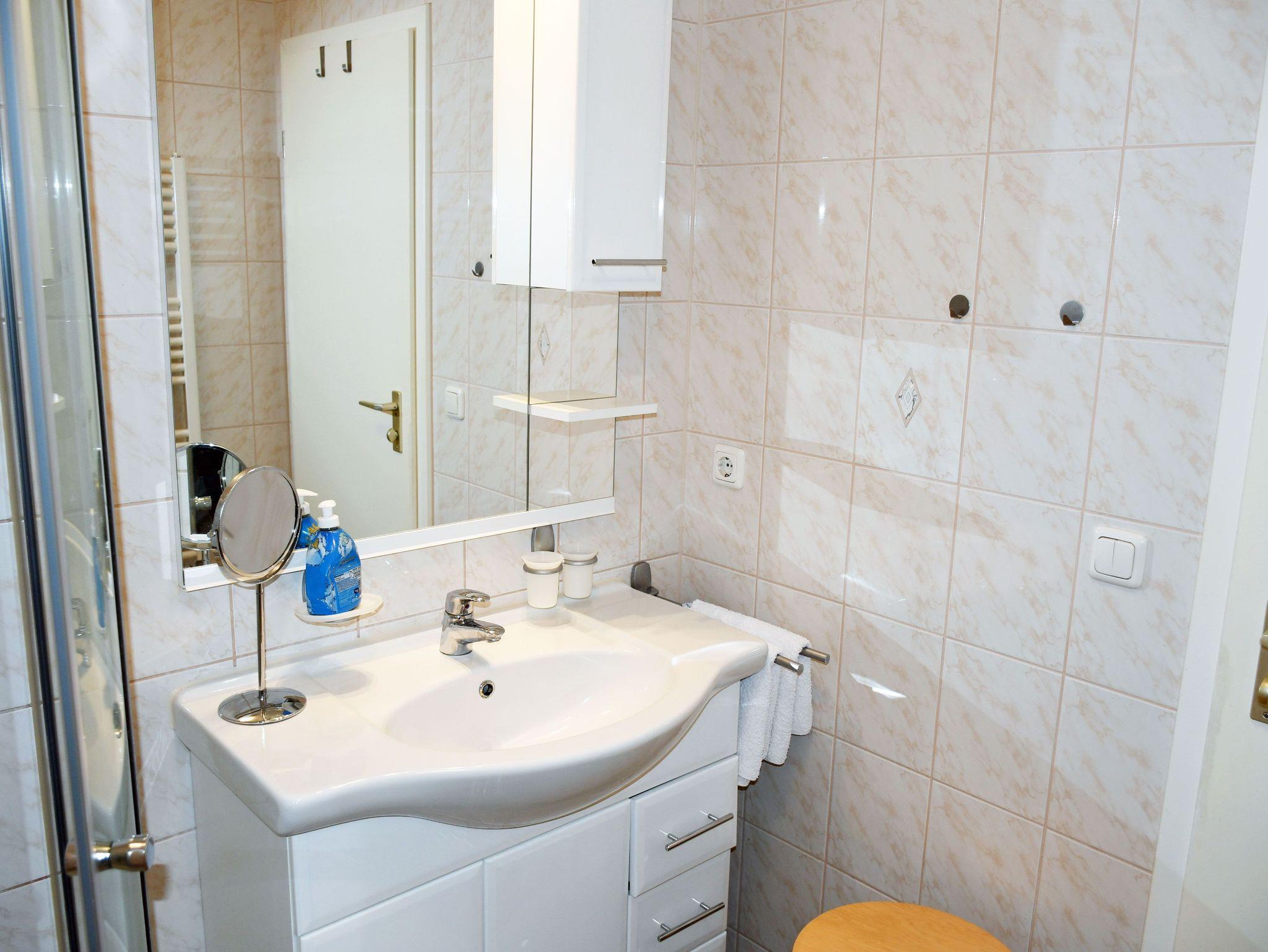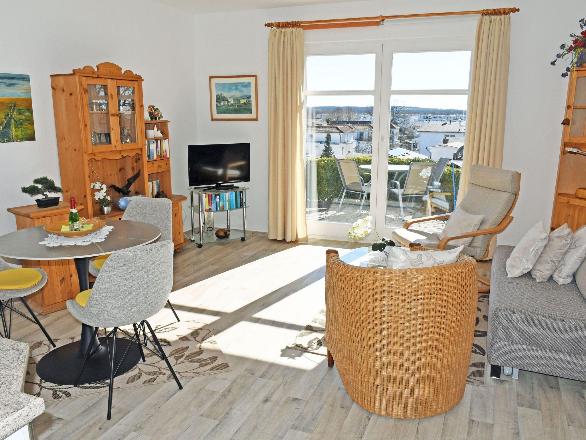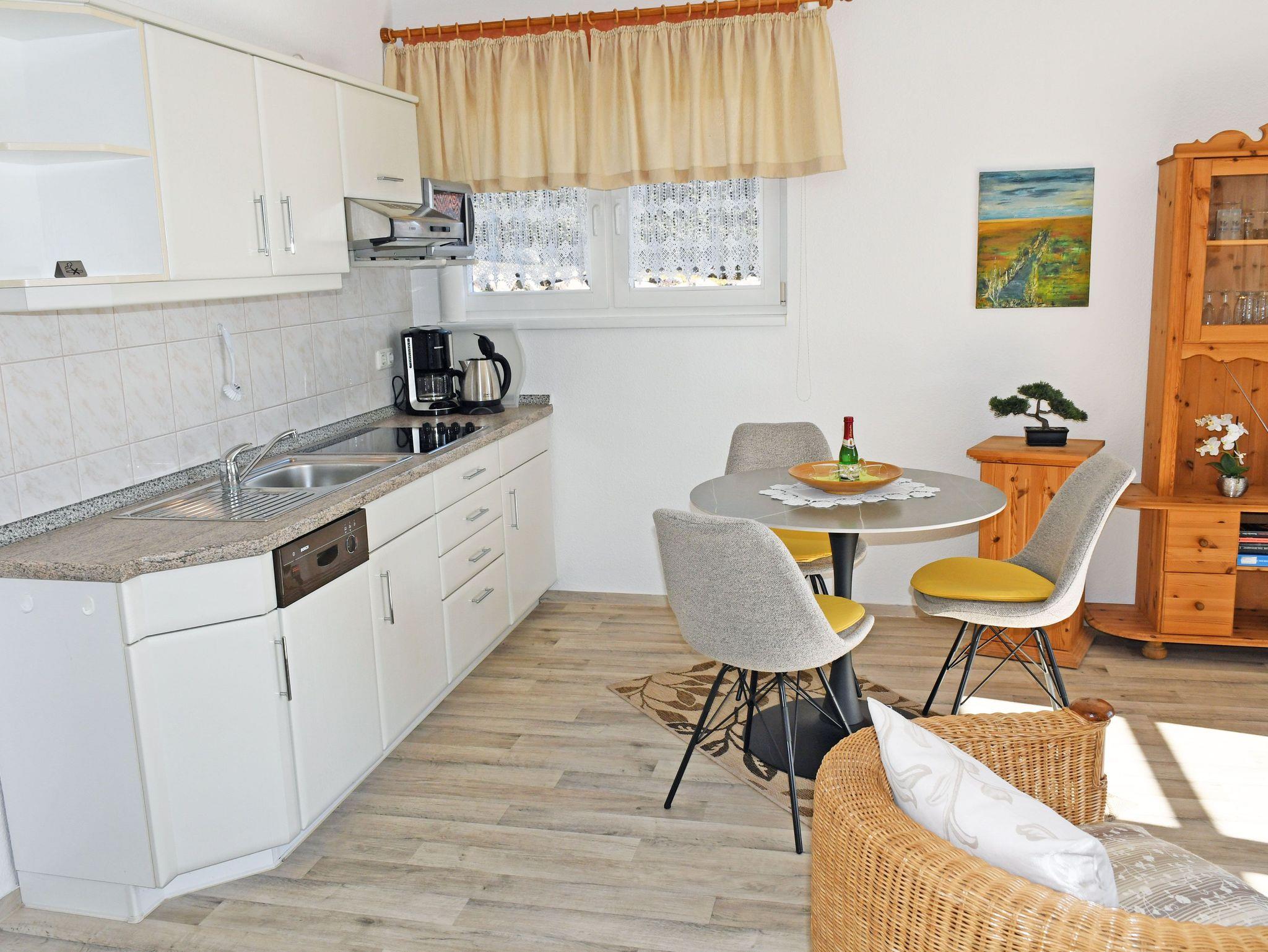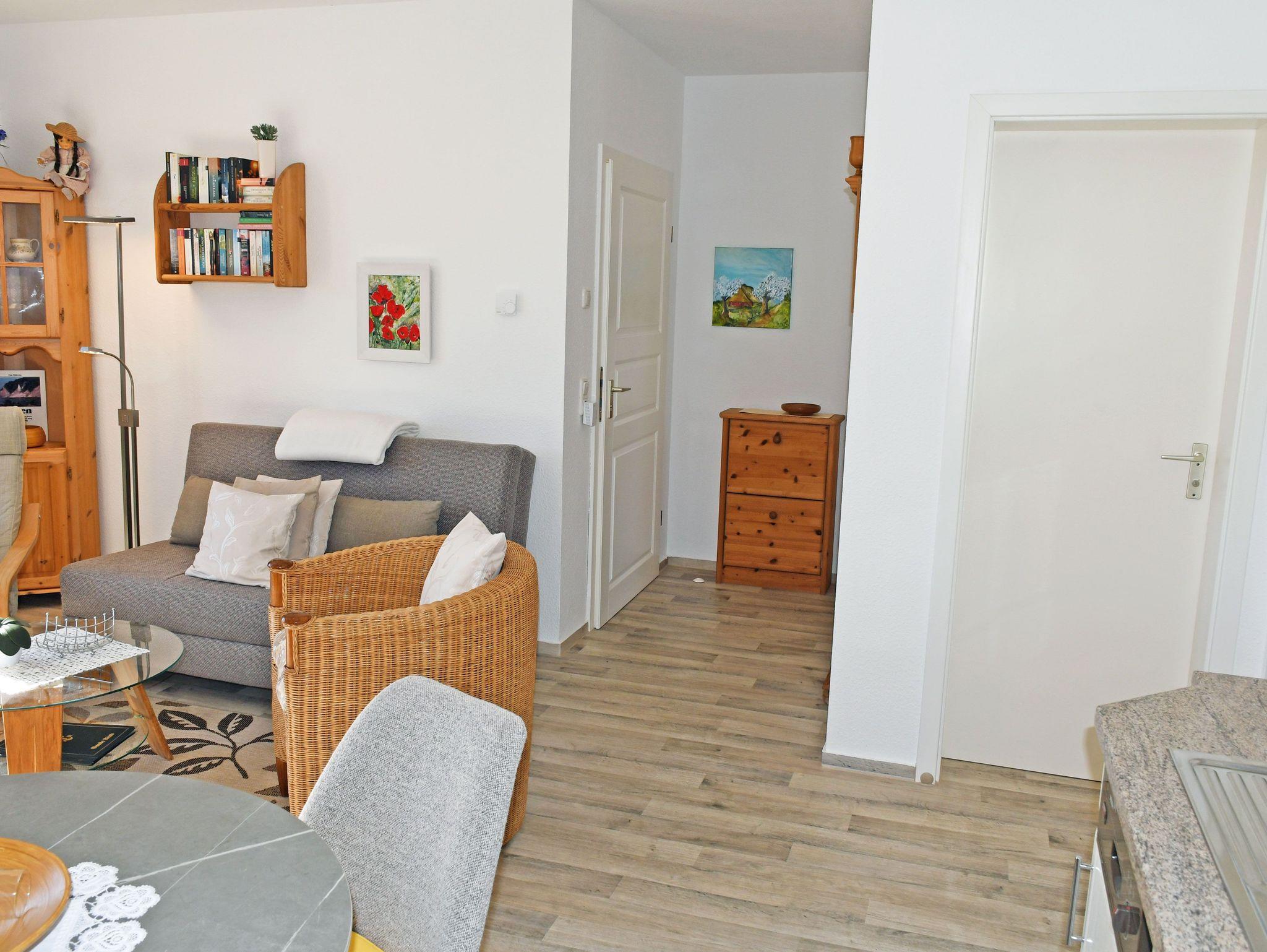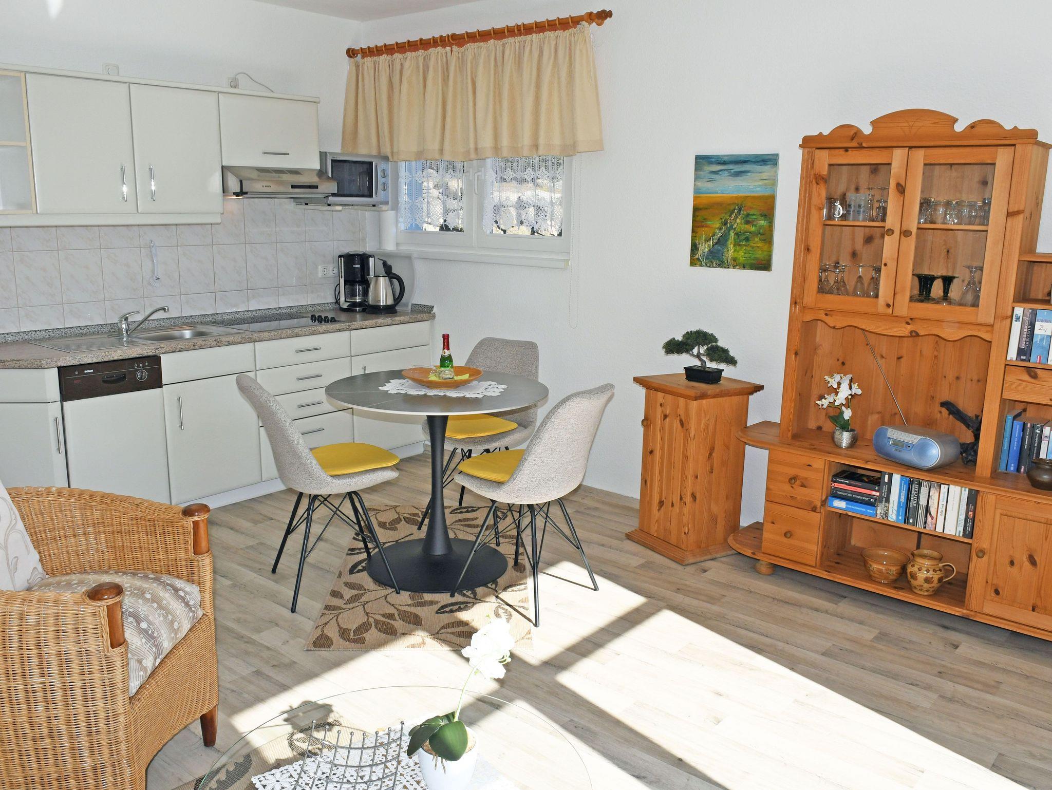 Das 2-Zimmerappartement betreten Sie über einen geräumigen Vorflur. Die durchgehende Fußbodenheizung garantiert an kalten Tagen ein angenehmes Wohngefühl. Die Wohnungen sind mit Komplettküchen ( Cerankochfeld, Kühlschrank, Mikrowelle, Kaffemaschine, Toaster, Wasserkocher etc.) ausgestattet. Der Essbereich geht in das Wohnzimmer über. An einen großen Spiegel mit Garderobe haben wir in unserer angedeuteten Diele für Sie gedacht. In den Wohnzimmern befinden sich jeweils eine bequeme Sitzecke mit Sessel, ein TV-Bereich (Sat-TV) sowie eine kleine Zimmerbibliothek mit Anrichte + Eckvitrine. Von hier haben Sie auch einen Zugang zur Balkonterrasse, die für Sie selbstverständlich Sitzgarnituren mit Polstern und einen Sonnenschirm bereithält. Das Schlafzimmer verfügt über ein Doppelbett, Schränken und Nachtschränkchen sowie einer kleinen zusätzlichen Garderobe. Die hochwertigen Matratzen garantieren Ihnen gepaart mit der ruhigen Lage des Hauses ein gut Durchschlafen. Im Wäschepaket enthalten sind, pro Person zwei Handtücher, ein Duschbadetuch sowie ein Geschirrtuch und eine Duschvorlage (Grundausstattung). Eine DU/WC erwarten Sie etwas geräumiger mit einem Handtuchtrockner und einem Fön. Abschließbare Fahrradunterstellmöglichkeiten stehen bereit. Außerdem können Sie gern Gebrauch von unserem Wäschetrockenplatz machen. Im Wohnbereich ist das Rauchen nicht erwünscht.