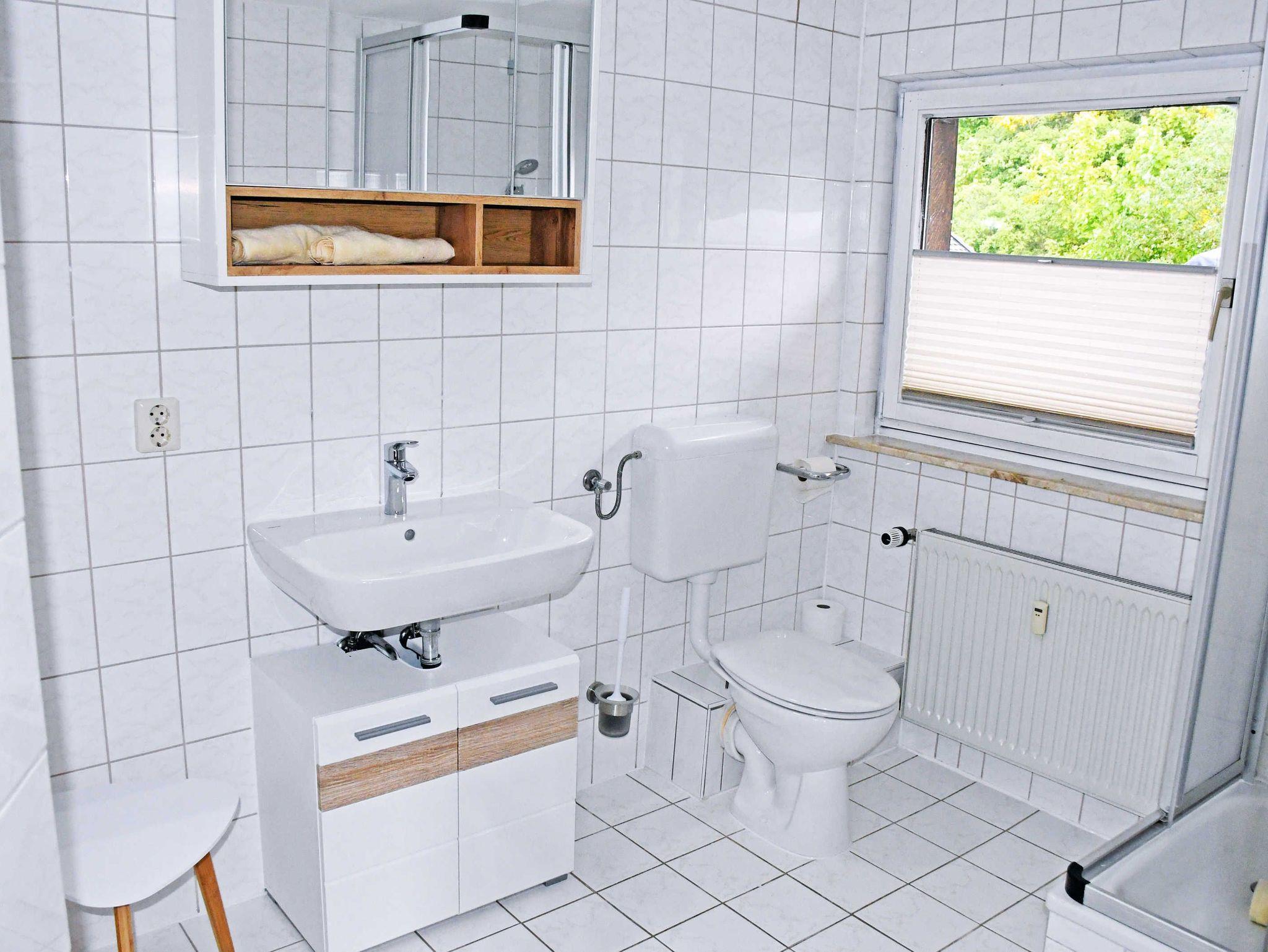 Das Bad ist mit Dusche, WC und Waschtisch ausgestattet und verfügt über Tagelslicht.