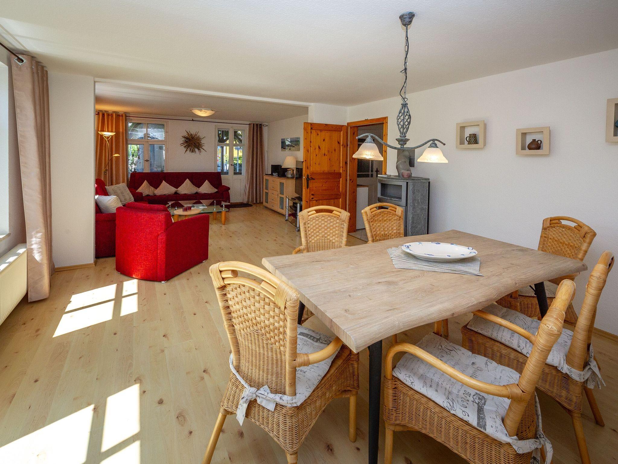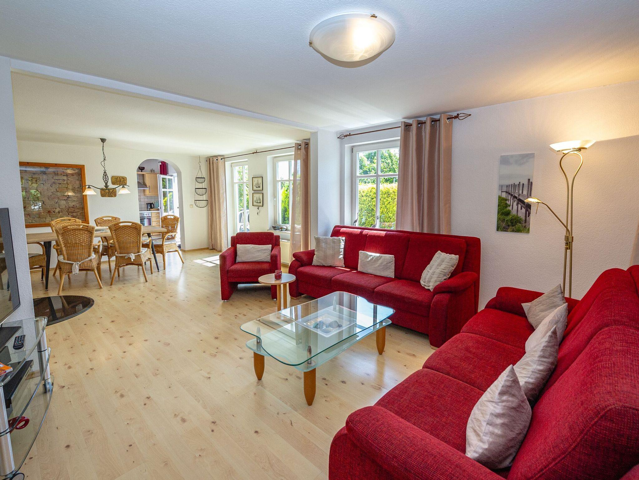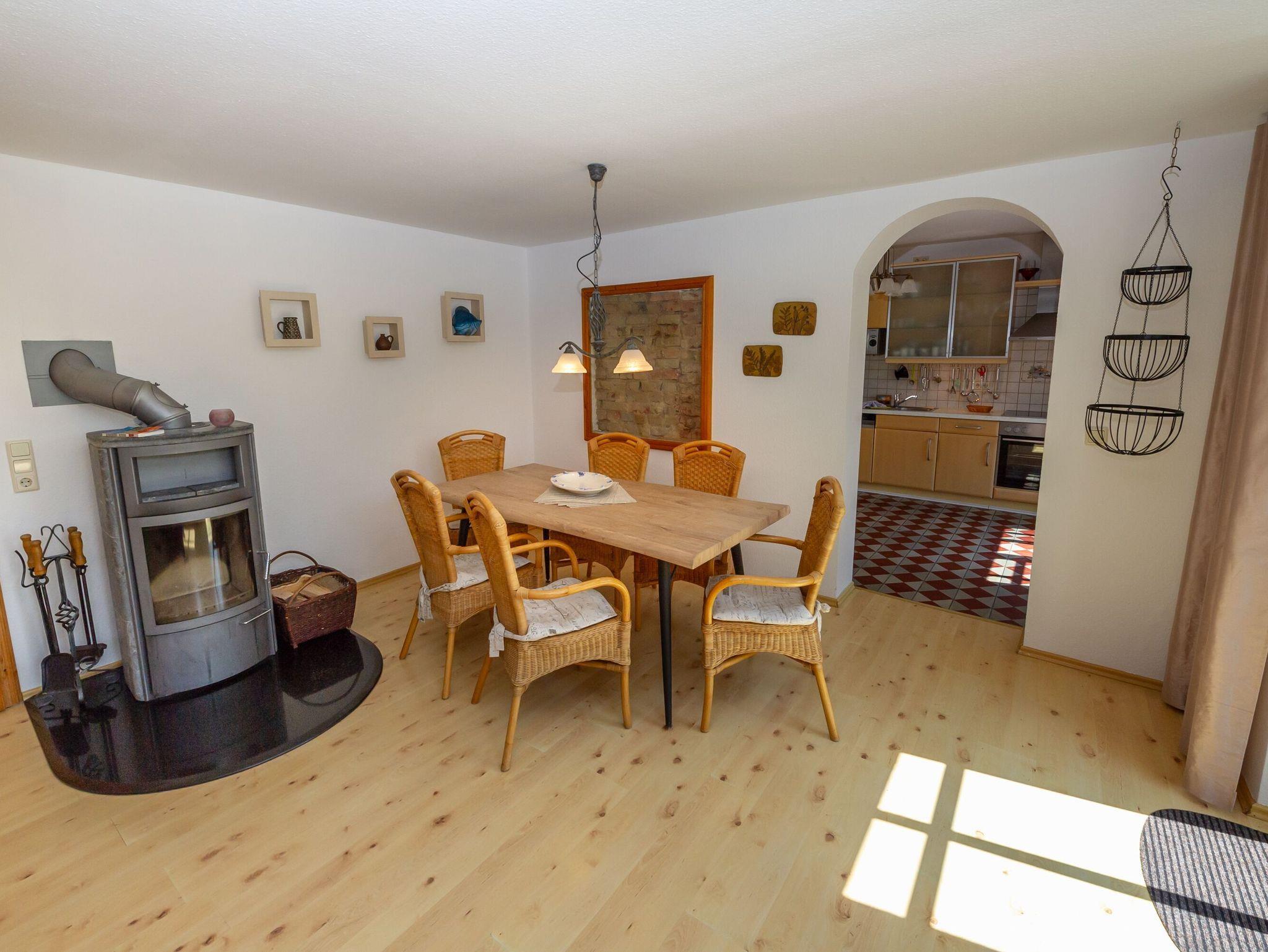 Das weiträumige, zur Küche hin offen gehaltene Wohnzimmer verfügt über eine Essecke mit einem großen Esstisch, eine großzügige Sitzlandschaft mit zwei großen Couchen und einem bequemen Sessel mit Fußhocker. Ein Flachbild-TV, ein DVD-Player und eine kleine Stereonlage mit CD-Player sorgen für Unterhaltung. Kostenfreies W-LAN steht Ihnen natürlich ebenfalls zur Verfügung. Ein schöner Kaminofen verspricht gemütliche Stunden vor dem knisternden Feuer.