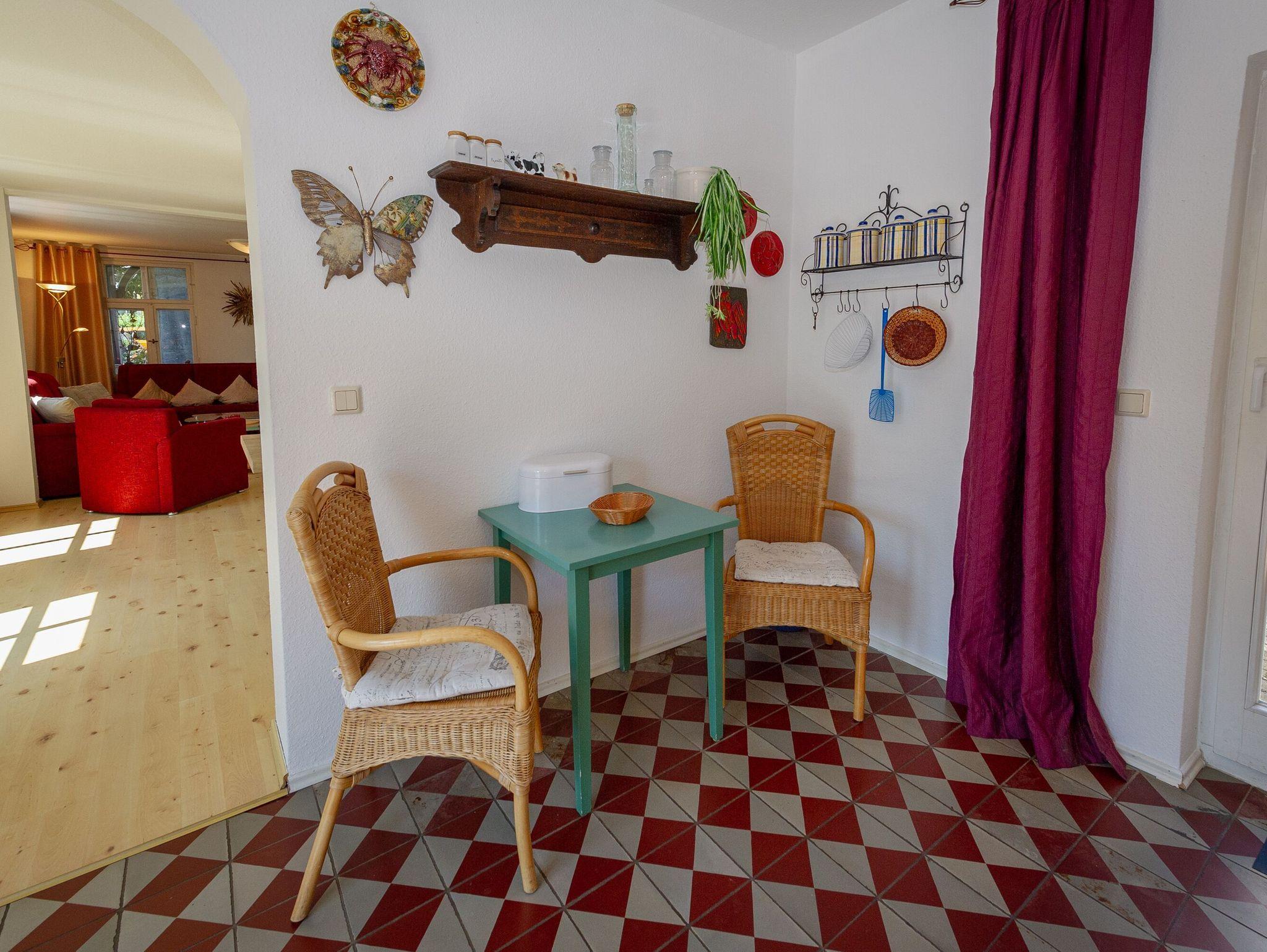 Diese gemütliche 4-Raum-Wohnung mit einer Wohnfläche von ca. 90 m², einer vorgelagerten Sonnenterrasse und einer Einrichtung im Landhausstil erwartet Sie im Erdgeschoss des historischen Hauses. Ein kleiner Garten sowie ein kleiner Innenhof gehören ebenfalls dazu. Die Balkon- bzw. Terrassenmöbel stehen saisonal - in der Regel von Mai bis Ende September - zur Verfügung.