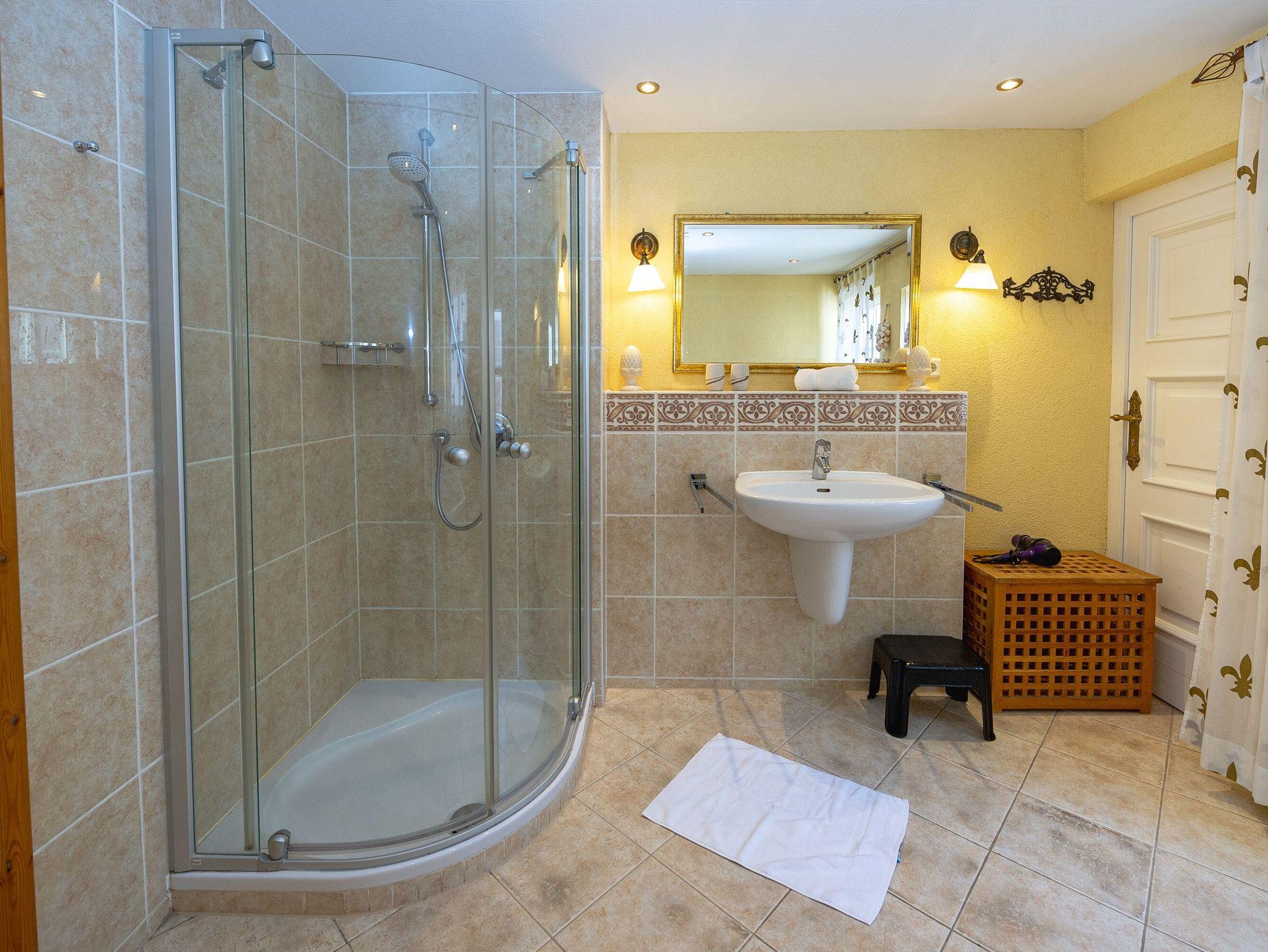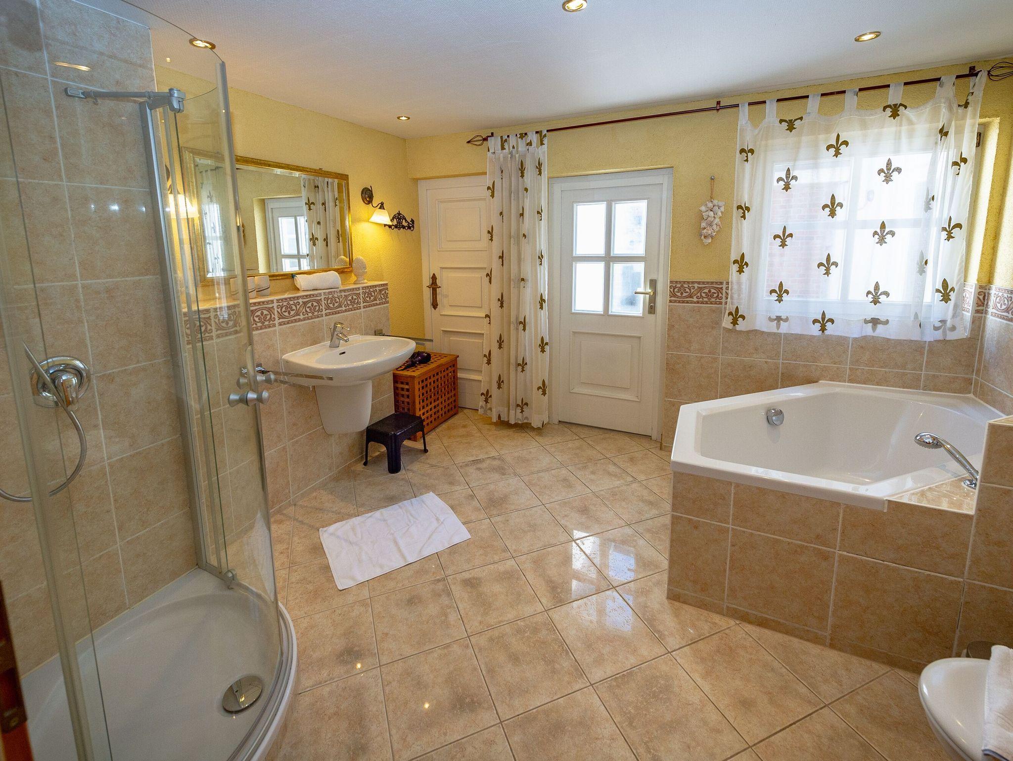 Das große Badezimmer Ihrer Urlaubsunterkunft ist mit WC, Badewanne und einer separaten Dusche ausgestattet.