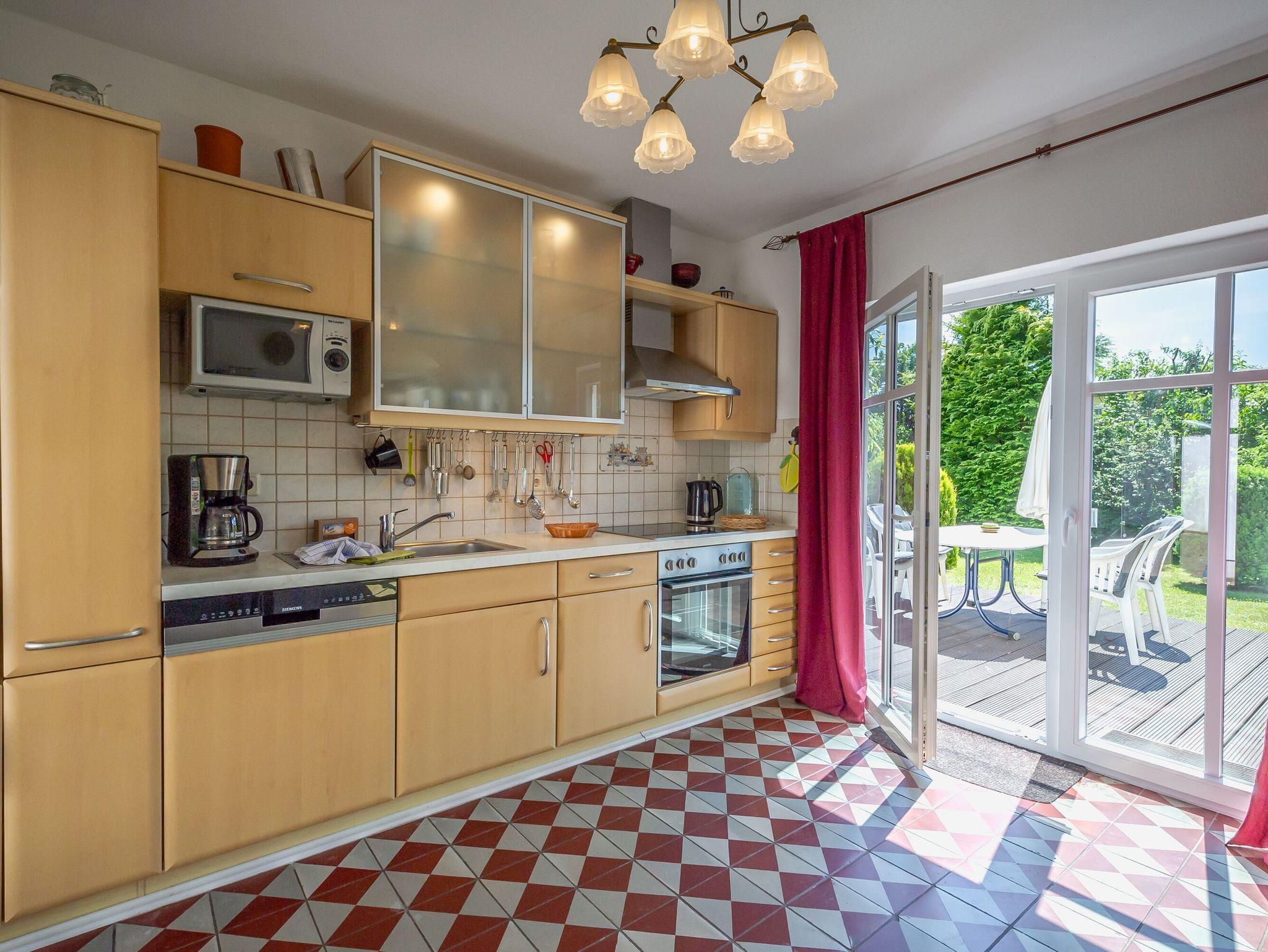 Die Küche ist komplett ausgestattet mit einem 4-Zonen-Cerankochfeld, einem Backofen, einem Kühlschrank, einer Geschirrspülmaschine, einer Mikrowelle, Wasserkocher, Kaffeemaschine, Toaster und diversem Kleininventar. Von hier aus hat man ebenfalls den Zugang zur möblierten Terrasse nach Süden.