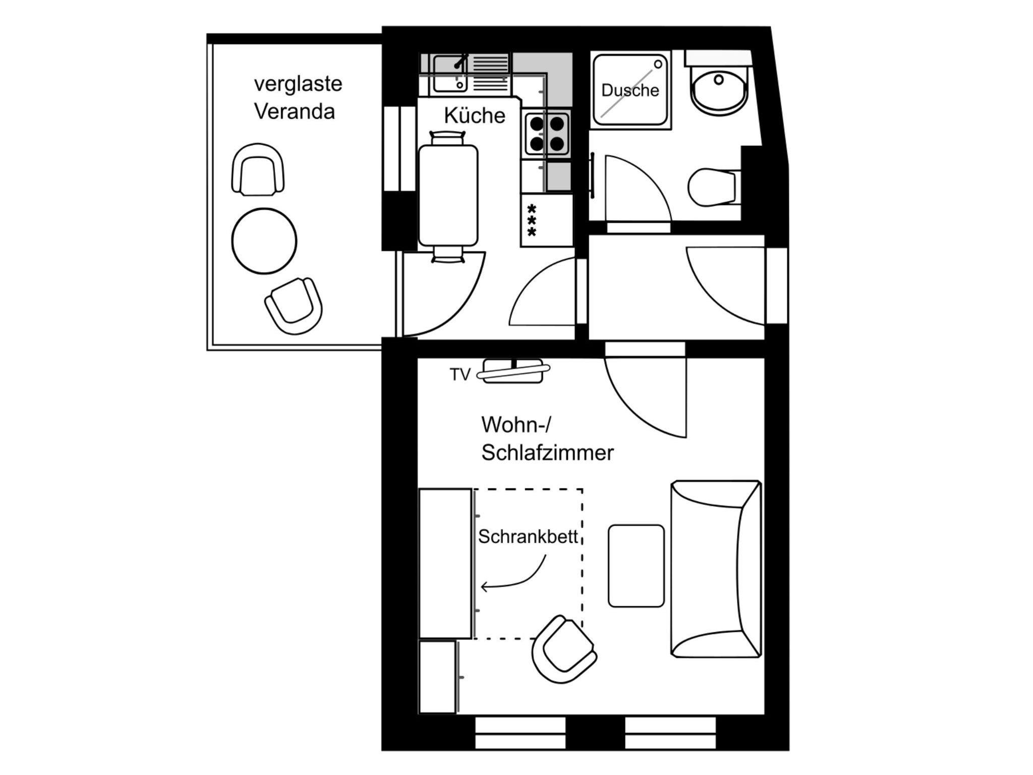 • kombiniertes Wohn-/Schlafzimmer mit Schrankbett, Couch sowie Flachbild-TV