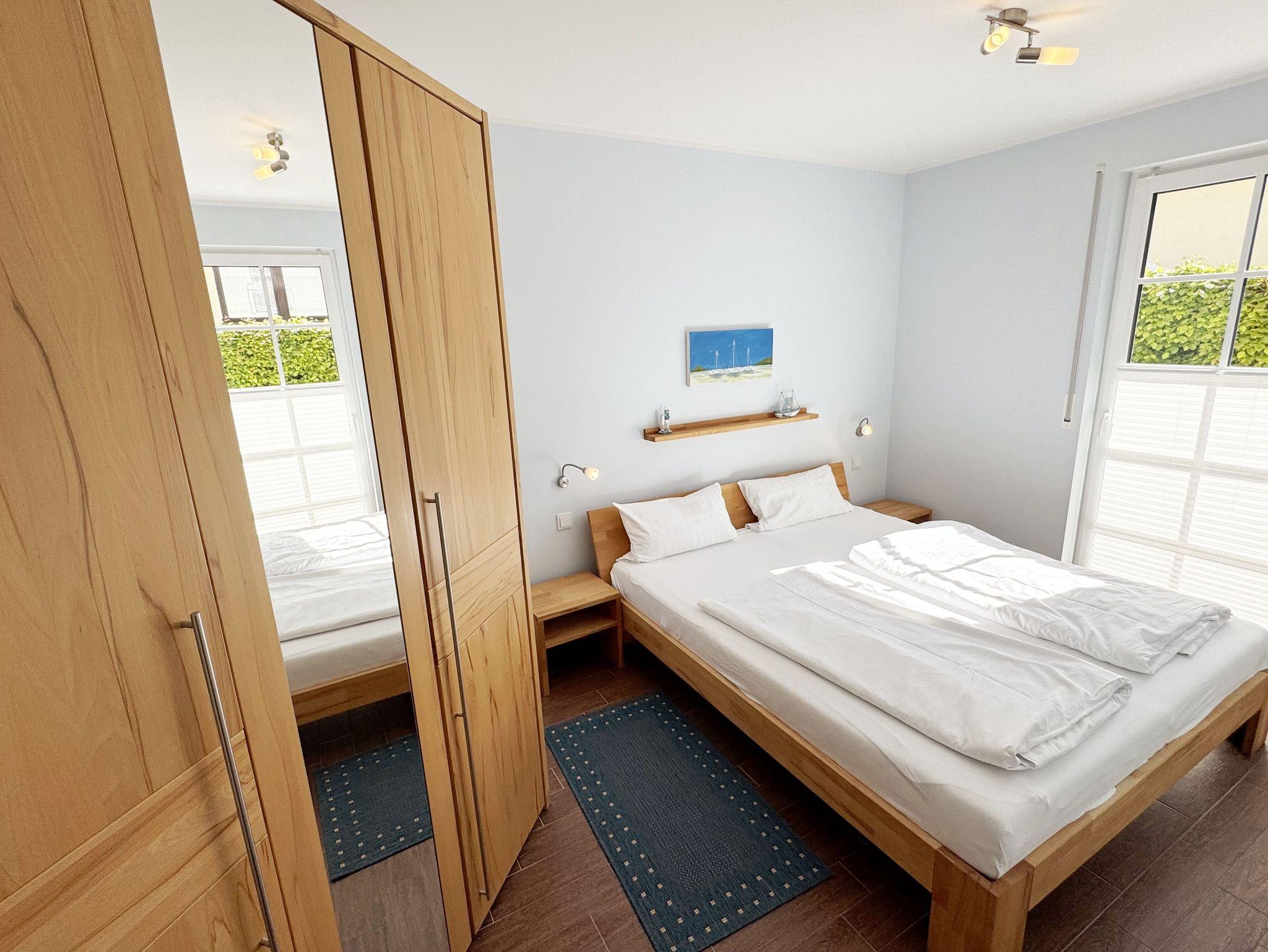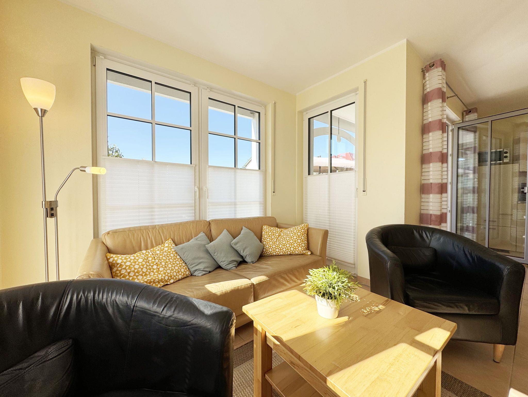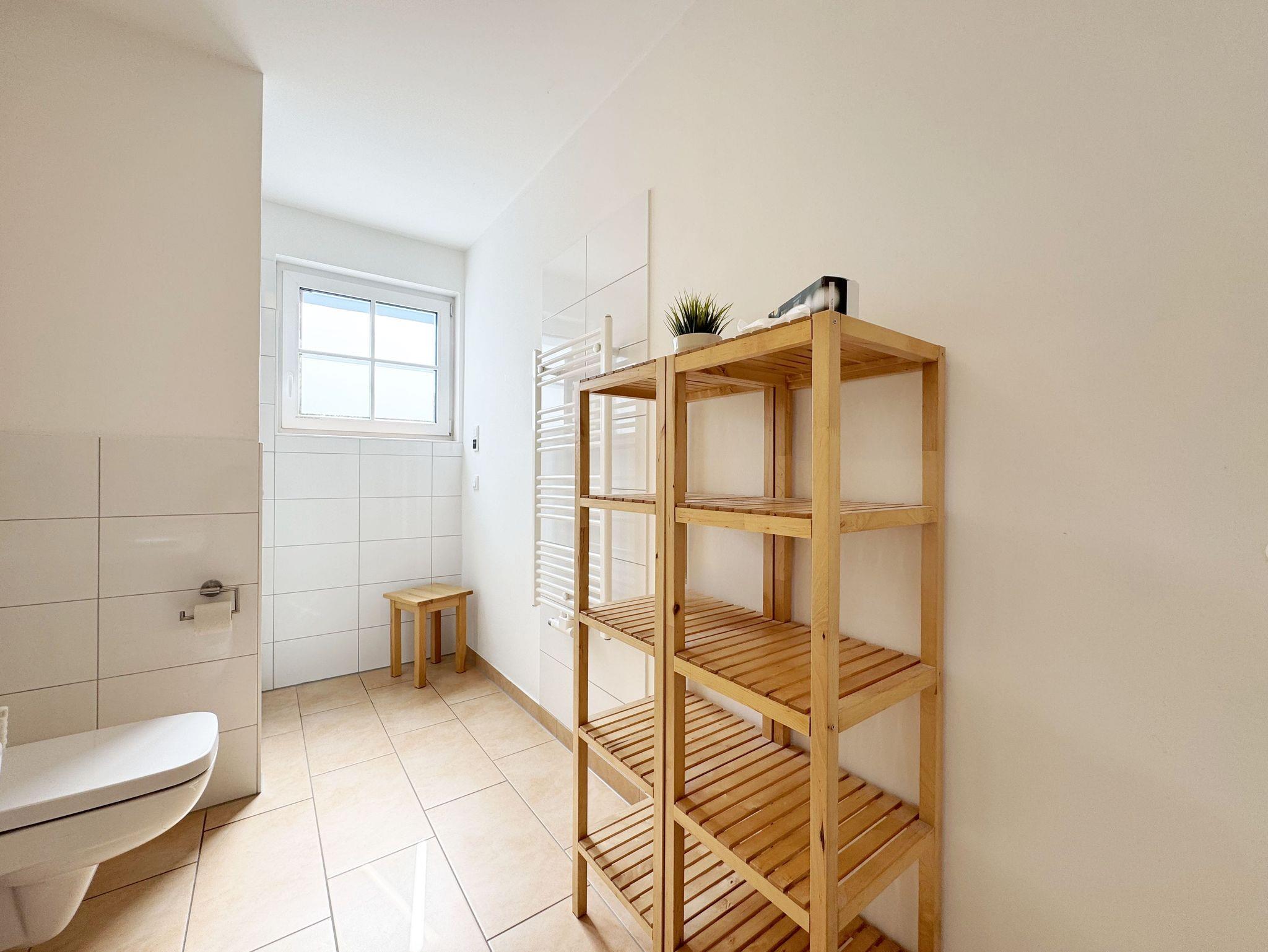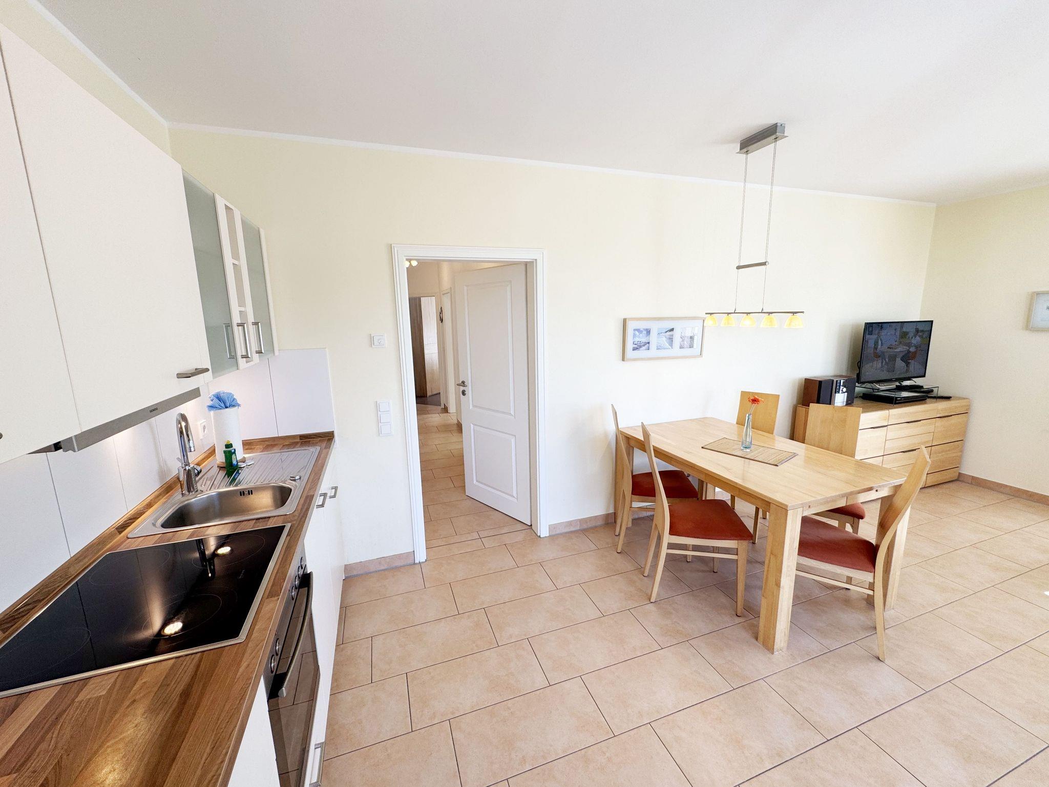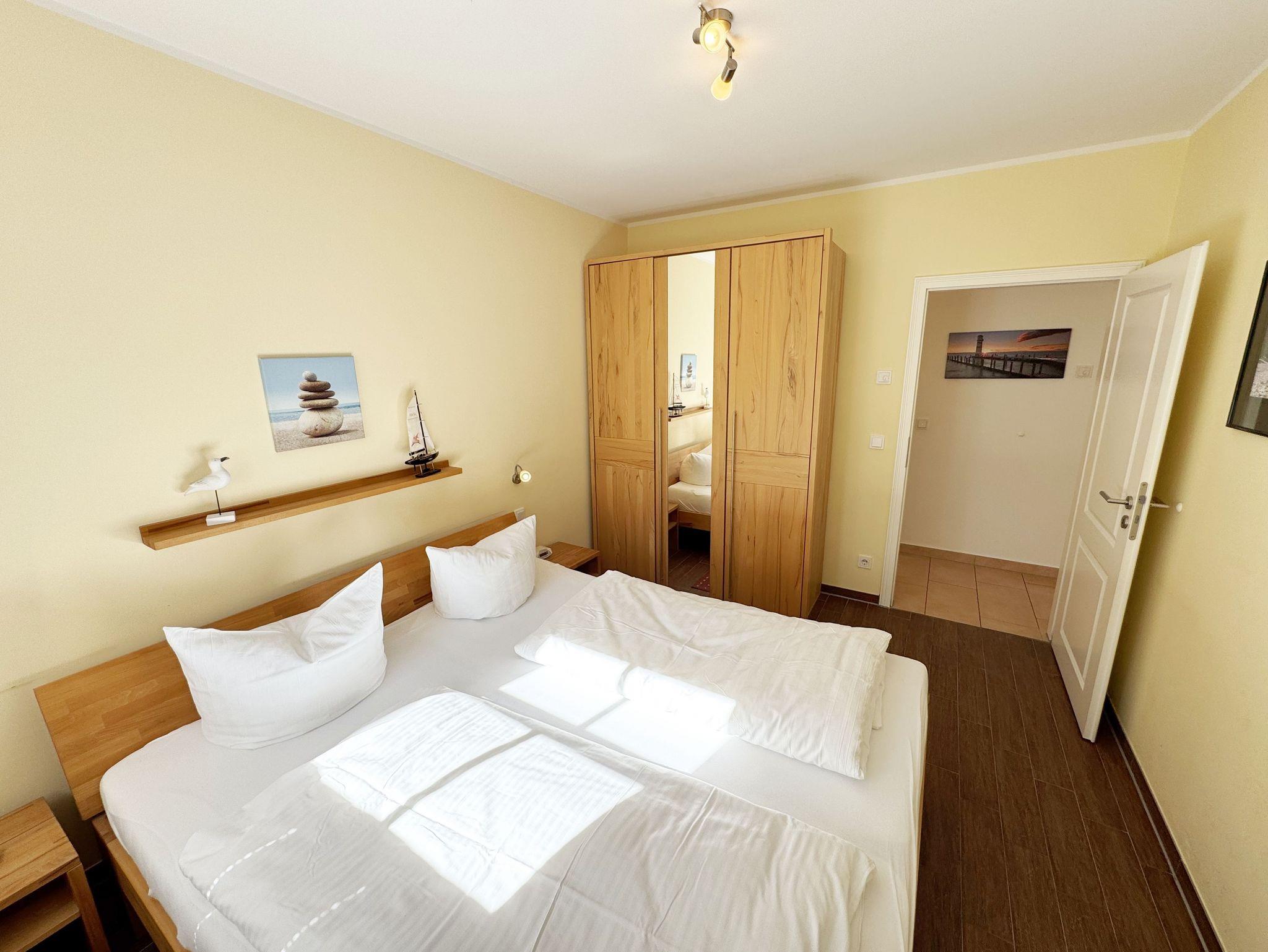Die modern und gemütlich eingerichtete 3-Raumwohnung Nr. 01 (Nichtraucherwohnung) befindet sich im Erdgeschoss und umfasst eine Wohnfläche von ca. 70 qm und bietet ausreichend Platz für 2 bis 5 Erwachsene. Alle Fenster sind zur Verdunkelung mit Rollladen versehen. Der Wohnbereich ist mit einem Ledersofa mit integriertem Vollbett (Liegefläche 1,50m x 2,00m), 2 Sesseln, Smart-TV, Heimkinoanlage und einer Küchenzeile ausgestattet. Die Küchenzeile ist komplett eingerichtet und beinhaltet Ceranfeld, Backofen, Geschirrspüler, Mikrowelle, Kühlschrank mit Gefrierfach und diversen Küchenutensilien. Ein Essplatz mit einem Tisch und 5 Stühlen ist vorhanden. Das Bad verfügt über eine Dusche (90cm x 90cm), WC, Waschbecken, Kosmetikspiegel, Handtuchtrockner und einem Haar Fön. Ein Gäste-WC mit Waschbecken rundet den Sanitärbereich ab. Die beiden Schlafzimmer bestehen jeweils aus einem Doppelbett (2 x 0,90 m x 2,00m), verstellbare Lattenroste mit Nachttischkonsolen und einem Kleiderschrank (1,50m breit). In einem der Schlafzimmer befindet sich ein Flachbildschirm. In allen Räumen sorgt eine Fußbodenheizung für angenehme Wärme. Die zu der Wohnung gehörende Terrasse mit Terrassentisch, Korbsesseln mit Auflagen zeigt Richtung Süd/West und lädt bei Sonnenschein zum Verweilen ein. An die Terrasse grenzt ein kleiner mit umlaufenden Sträuchern dicht eingefriedeter Garten zur Alleinbenutzung/Südlage. Ein eigener PKW-Stellplatz (Nr.01) ist für Sie in der hauseigenen Tiefgarage (Einfahrtshöhe 1,90m) vorhanden, sowie eine Fahrradabstellmöglichkeit auf dem Areal und der in der Tiefgarage. Auch im Urlaub brauchen Sie in der Wohnung nicht auf einen Internetanschluss (WLAN/LAN) verzichten. Dieser ist für Sie inklusive! Ein Haustier ist in der Wohnung nicht erlaubt. Die Erstausstattung eines Wäschepaketes (komplette Bettwäsche, 1 Duschhandtuch, 1 kleines Handtuch) können Sie bis 14 Tage vor Anreise gegen einen Aufpreis dazu buchen oder durch eigene ergänzen. Ab 2 gebuchten Paketen erhalten Sie einmalig 1 Geschirrhandtuch und 1 Duschvorleger hinzu.