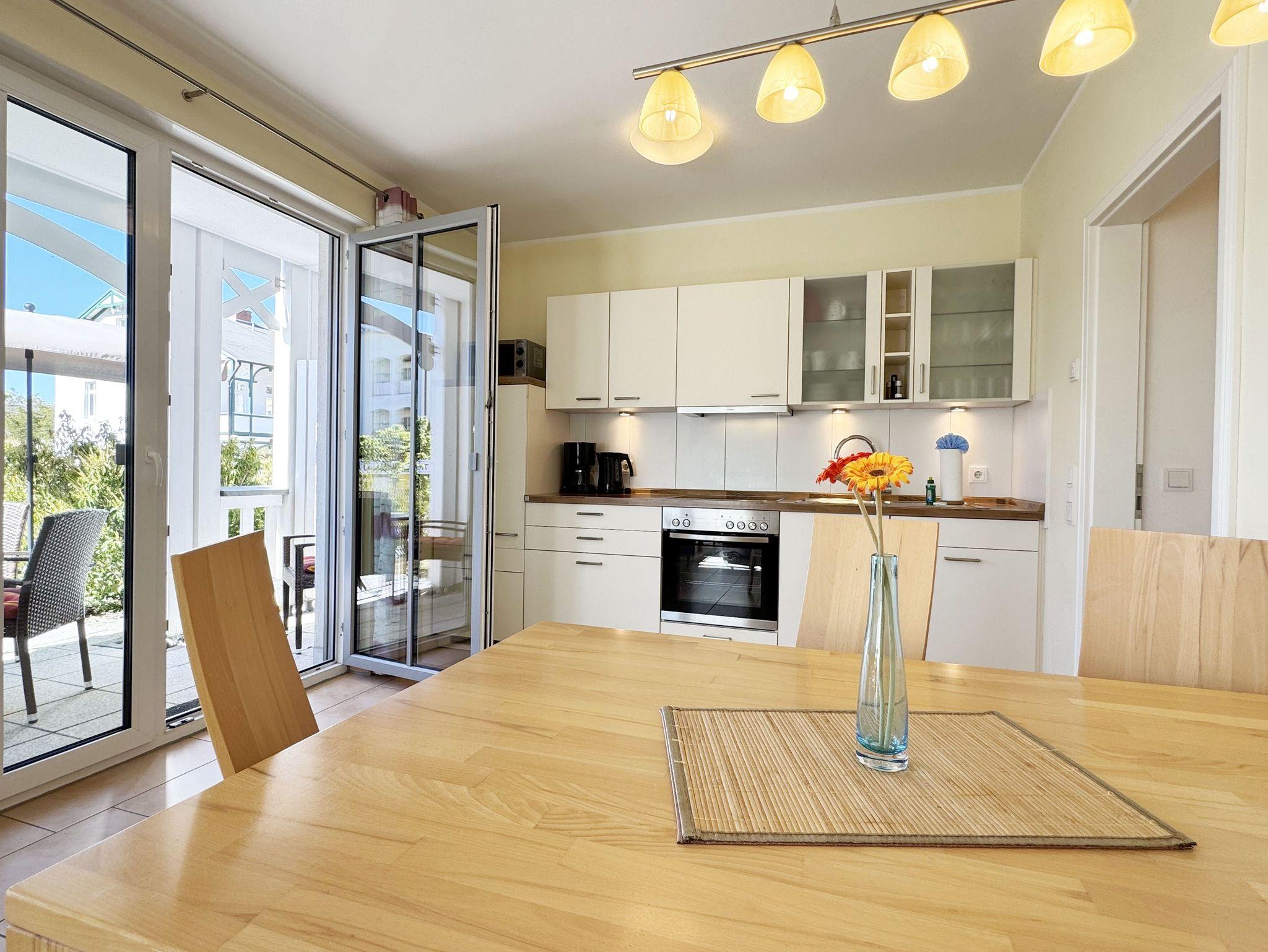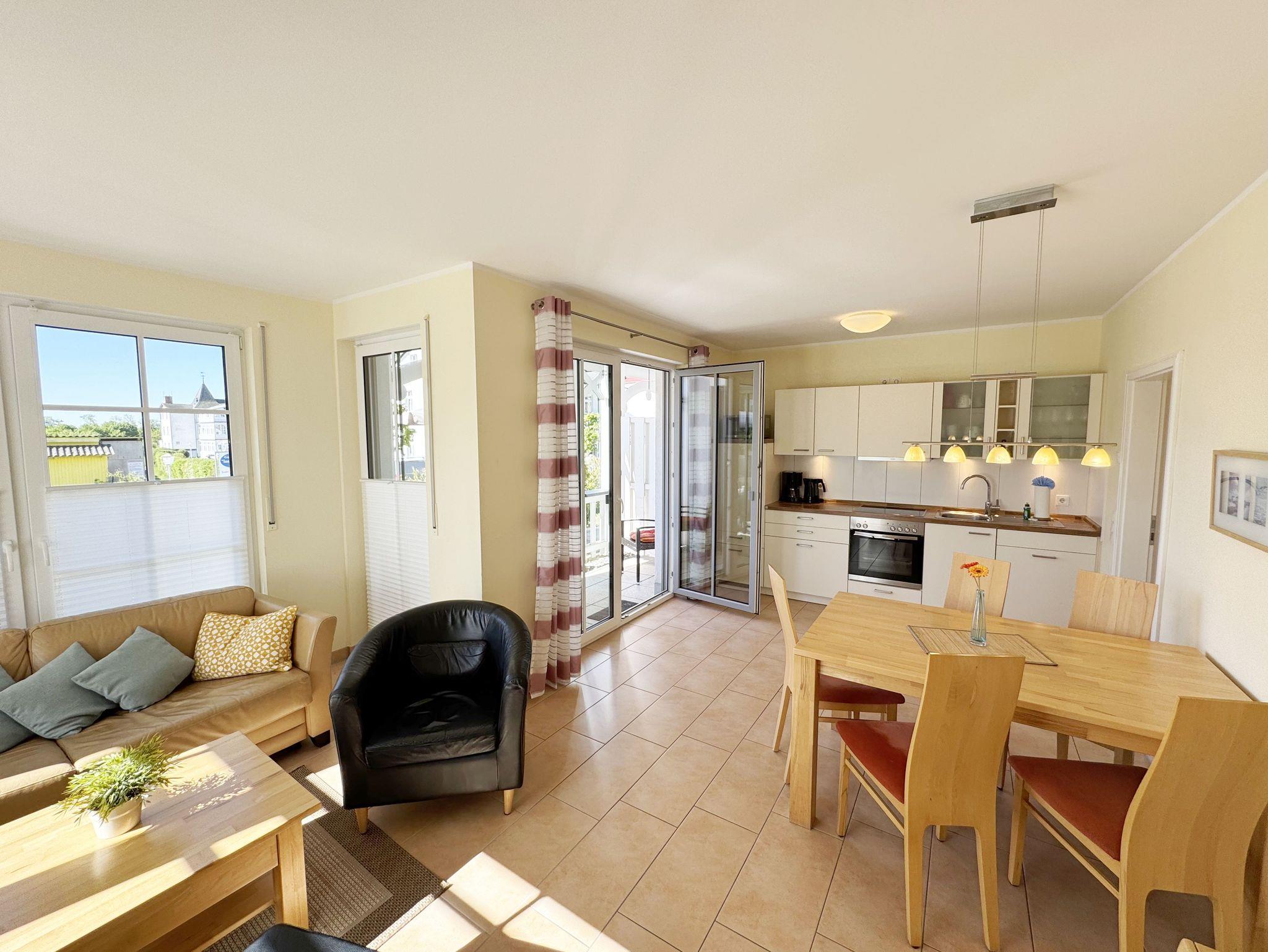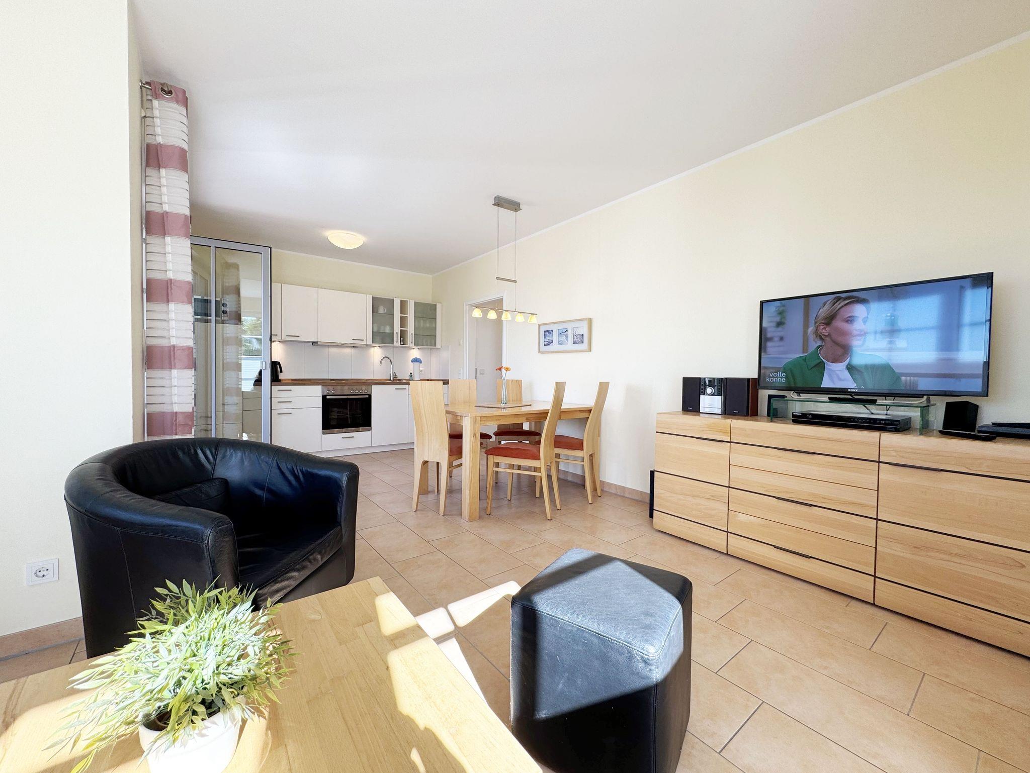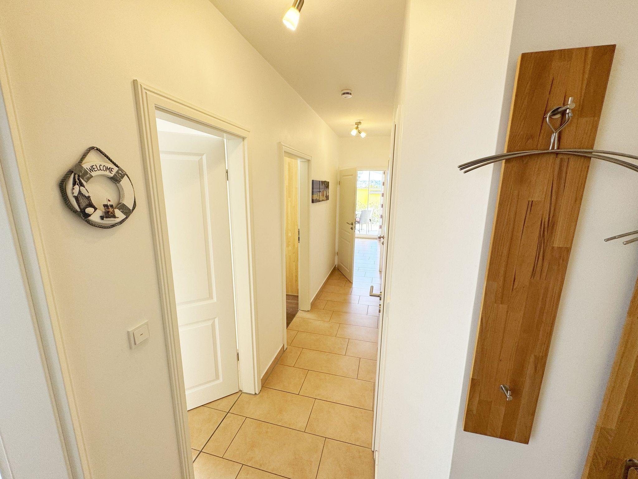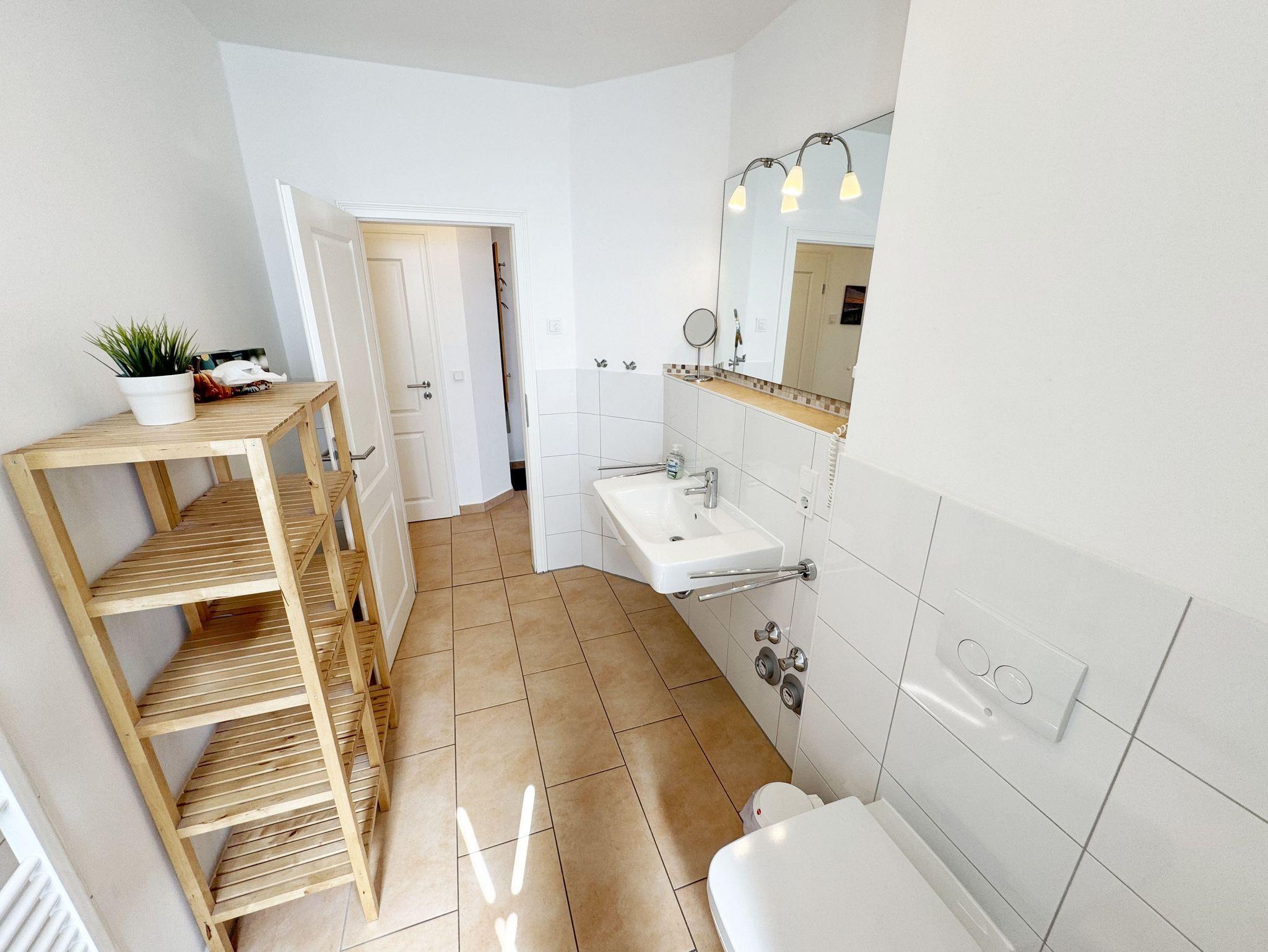 Die modern und gemütlich eingerichtete 3-Raumwohnung Nr. 01 (Nichtraucherwohnung) befindet sich im Erdgeschoss und umfasst eine Wohnfläche von ca. 70 qm und bietet ausreichend Platz für 2 bis 5 Erwachsene. Alle Fenster sind zur Verdunkelung mit Rollladen versehen. Der Wohnbereich ist mit einem Ledersofa mit integriertem Vollbett (Liegefläche 1,50m x 2,00m), 2 Sesseln, Smart-TV, Heimkinoanlage und einer Küchenzeile ausgestattet. Die Küchenzeile ist komplett eingerichtet und beinhaltet Ceranfeld, Backofen, Geschirrspüler, Mikrowelle, Kühlschrank mit Gefrierfach und diversen Küchenutensilien. Ein Essplatz mit einem Tisch und 5 Stühlen ist vorhanden. Das Bad verfügt über eine Dusche (90cm x 90cm), WC, Waschbecken, Kosmetikspiegel, Handtuchtrockner und einem Haar Fön. Ein Gäste-WC mit Waschbecken rundet den Sanitärbereich ab. Die beiden Schlafzimmer bestehen jeweils aus einem Doppelbett (2 x 0,90 m x 2,00m), verstellbare Lattenroste mit Nachttischkonsolen und einem Kleiderschrank (1,50m breit). In einem der Schlafzimmer befindet sich ein Flachbildschirm. In allen Räumen sorgt eine Fußbodenheizung für angenehme Wärme. Die zu der Wohnung gehörende Terrasse mit Terrassentisch, Korbsesseln mit Auflagen zeigt Richtung Süd/West und lädt bei Sonnenschein zum Verweilen ein. An die Terrasse grenzt ein kleiner mit umlaufenden Sträuchern dicht eingefriedeter Garten zur Alleinbenutzung/Südlage. Ein eigener PKW-Stellplatz (Nr.01) ist für Sie in der hauseigenen Tiefgarage (Einfahrtshöhe 1,90m) vorhanden, sowie eine Fahrradabstellmöglichkeit auf dem Areal und der in der Tiefgarage. Auch im Urlaub brauchen Sie in der Wohnung nicht auf einen Internetanschluss (WLAN/LAN) verzichten. Dieser ist für Sie inklusive! Ein Haustier ist in der Wohnung nicht erlaubt. Die Erstausstattung eines Wäschepaketes (komplette Bettwäsche, 1 Duschhandtuch, 1 kleines Handtuch) können Sie bis 14 Tage vor Anreise gegen einen Aufpreis dazu buchen oder durch eigene ergänzen. Ab 2 gebuchten Paketen erhalten Sie einmalig 1 Geschirrhandtuch und 1 Duschvorleger hinzu.