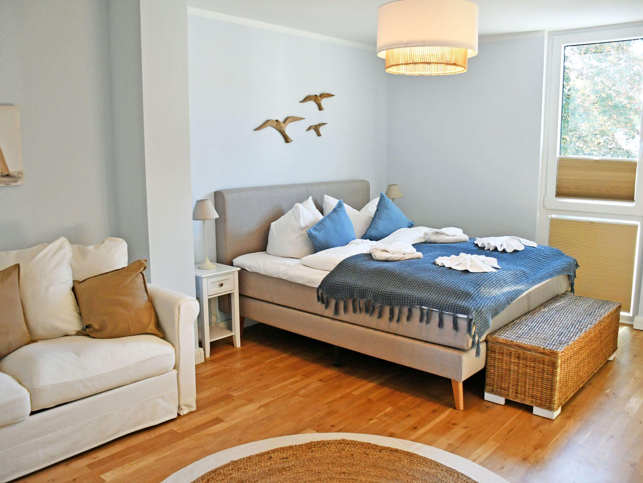 Jede der Wohnungen wird ebenerdig über die Eingangstür betreten. Hier erstreckt sich gleich rechtsseitig ein kleines Duschbad, sowie dem Flur folgend ein großzügiger langgezogener Schlafraum. Ein bequemes Boxspringbett (1,80m) mit Nachttischen und Leselampen sorgt hier für hohen Komfort und erholsamen Schlaf der Gäste und bildet den zentralen Punkt des Raumes. Ein 3- türiger Kleiderschrank und eine Kommode bieten ausreichend Stauraum für Kleider, das Schlafsofa im gradlinigen nordischen Stil bietet die Möglichkeit einer zusätzlichen Aufbettung für einen Gast in dem großen Schlafraum. Der große Bettkasten bietet Stauraum für die zur Aufbettung zusätzlich benötigten Bettdecken. Die Fenster können bei Bedarf zum Schlafen verdunkelt werden.