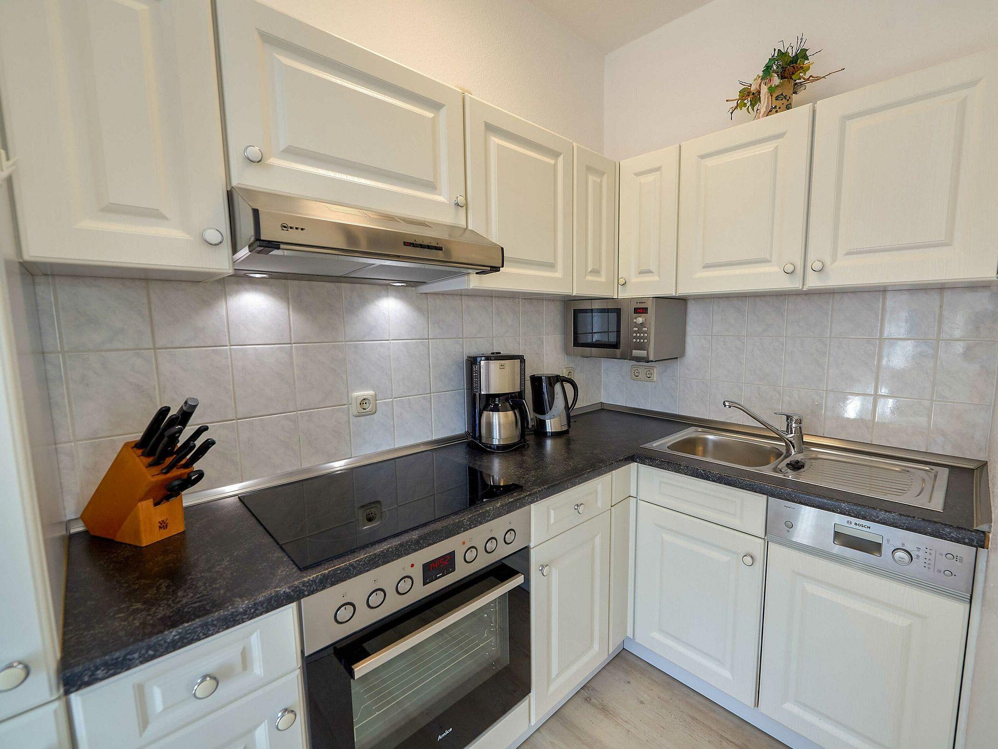 Die zum Wohnbereich hin offene Küchenzeile verfügt über einen Kühlschrank mit Gefrierfach, einen Herd mit Ceran-Feld und Backofen, eine Mikrowelle, einen Geschirrspüler, einen Wasserkocher, einen Toaster, eine Kaffeemaschine und diverses Kleininventar. Auch eine Grundausstattung an Putz- und Reinigungsmitteln gehört zum selbstverständlichen Komfort der Wohnung.