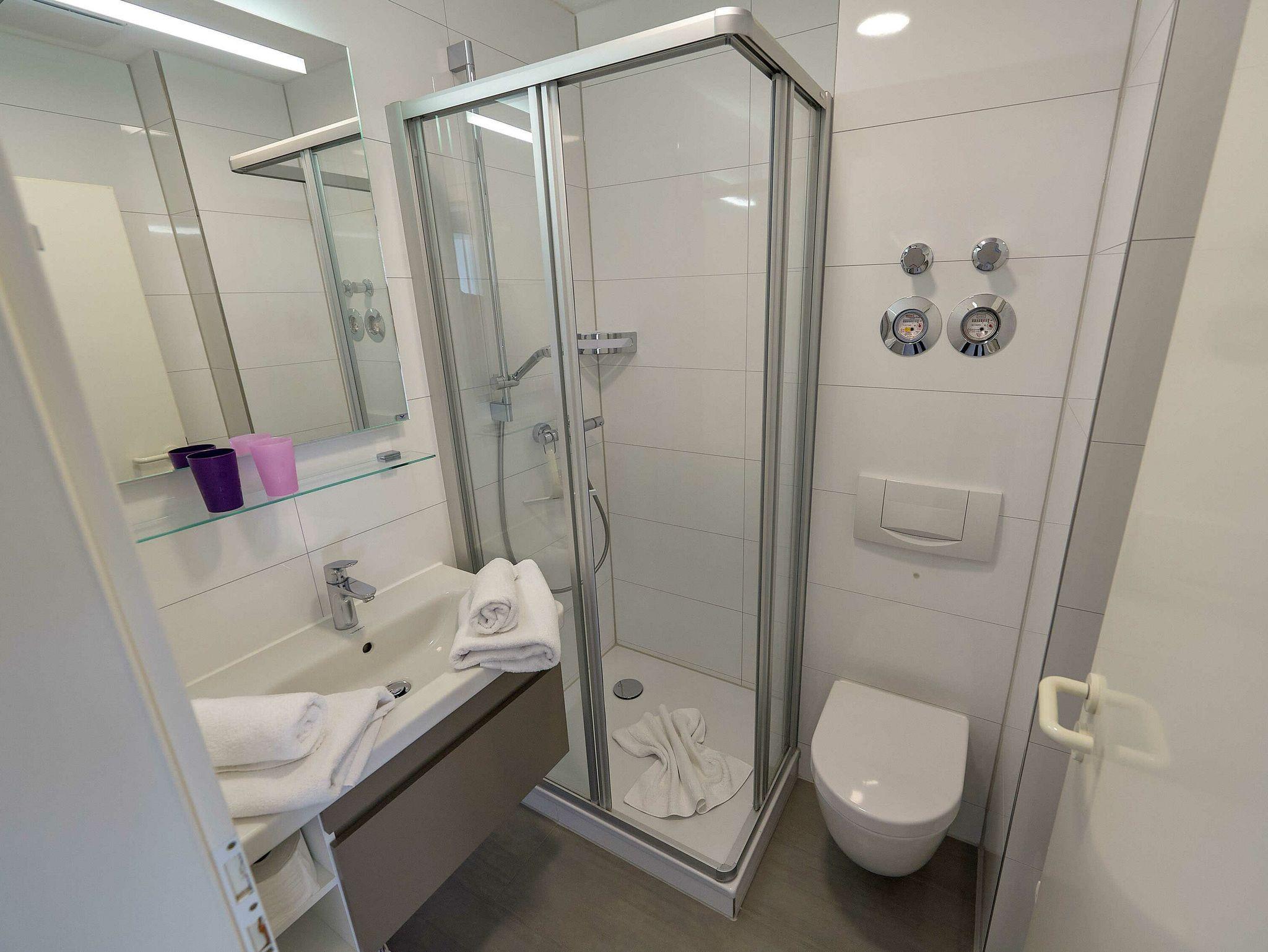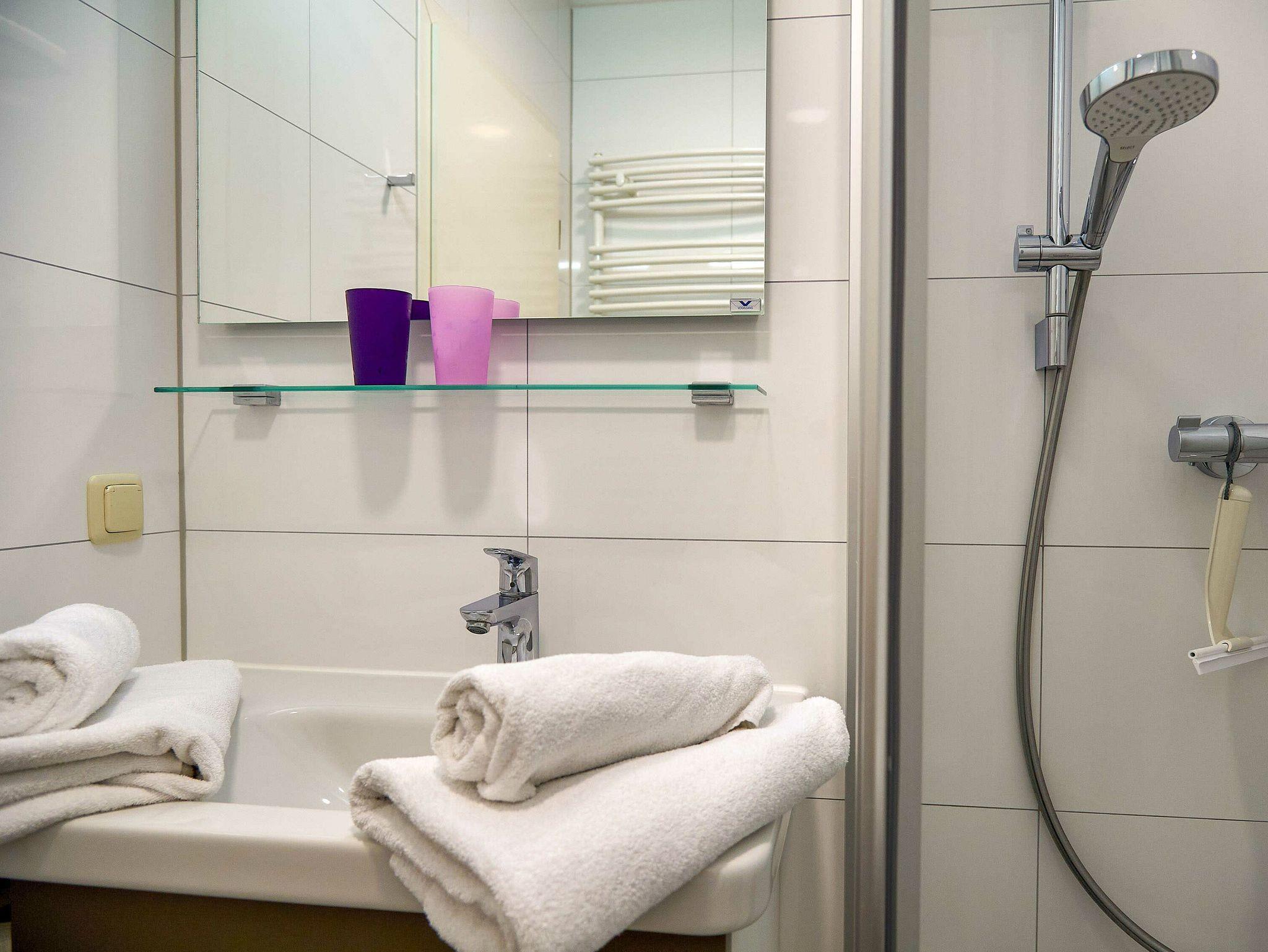 Im hell gefliesten Badezimmer sorgen Dusche/WC, Waschtisch, Fön und ein beheizbarer Handtuchtrockner für Wohlbefinden.