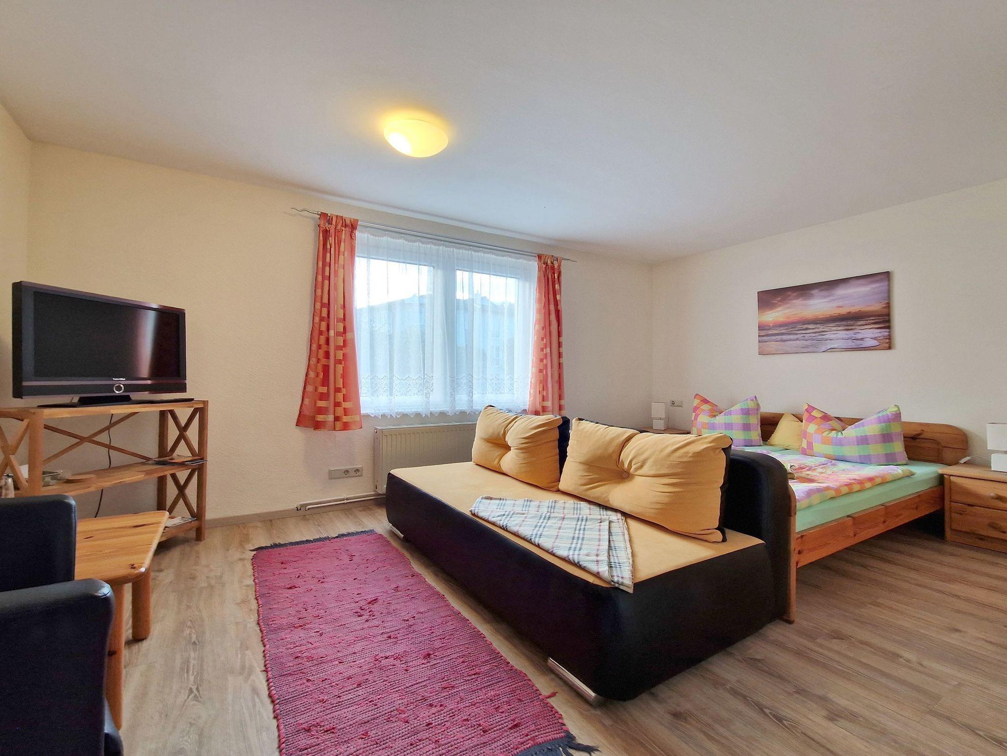• WOHNEN/SCHLAFEN: Wohnraum mit Couch, Doppelbett und Flachbild-TV