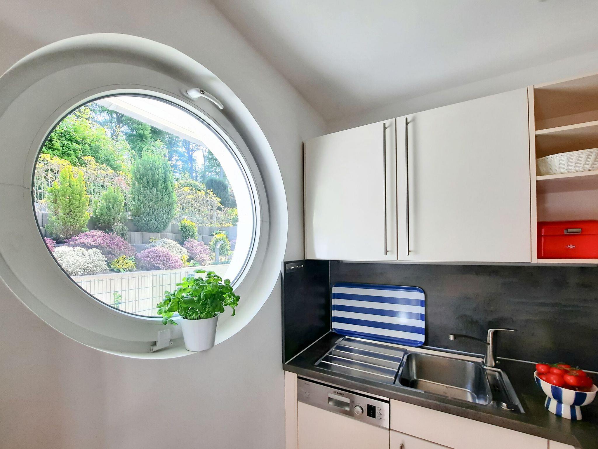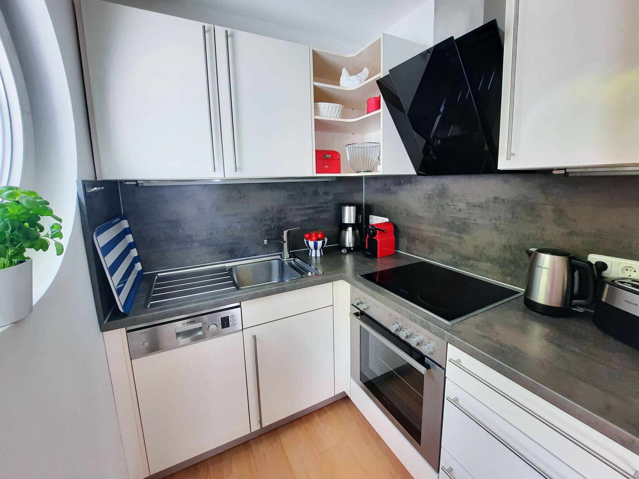 In der separaten Küche finden Sie ein 4-Zonen-Cerankochfeld mit Backofen, einen Kühlschrank, eine Spülmaschine, eine Nespressomaschine, einen Eierkocher, Wasserkocher, Toaster und diverses Kleininventar vor.