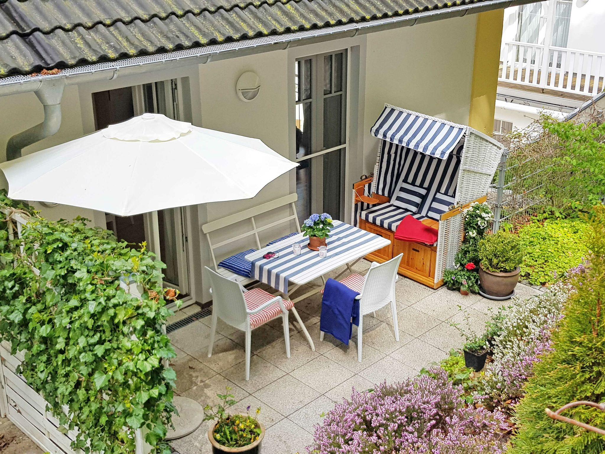 Durch den Bau des Hauses am Hang finden Sie hier eine möblierte Terrasse zur Ost-Seite vor, wo Sie beim Frühstück die Morgensonne genießen und aus dem Strandkorb den Blick ins Grüne schweifen lassen können.