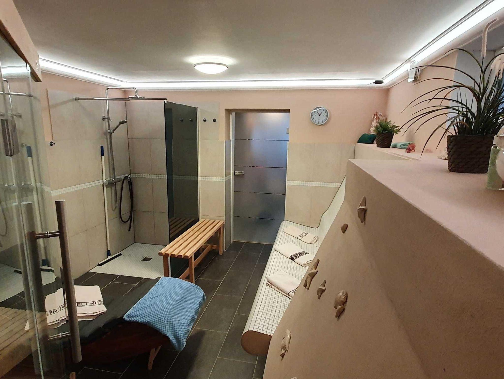 Vergessen Sie Ihren Alltagsstress und entspannen Sie sich in unserer hauseingenen Sauna. Diese kann nach Vereinbarung mit dem Vermieter gerne genutzt werden. Hier finden zwei bis sechs Personen ausreichen Platz. Unsere Sauna ist eine Bio Sauna mit Verdampfer 45° 65 °, man kann sie auch als Trockensauna nutzen von 60° - 90°. Der Saunaraum hat eine Dusche, eine Wärmebank und eine Ruheliege. Zusätzlich gibt es für Sie einen Abkühlraum wo Sie gemütlich entspannen und etwas trinken können. Die Saunagebühr wird direkt vor Ort bei Ihrem Vermieter erhoben.