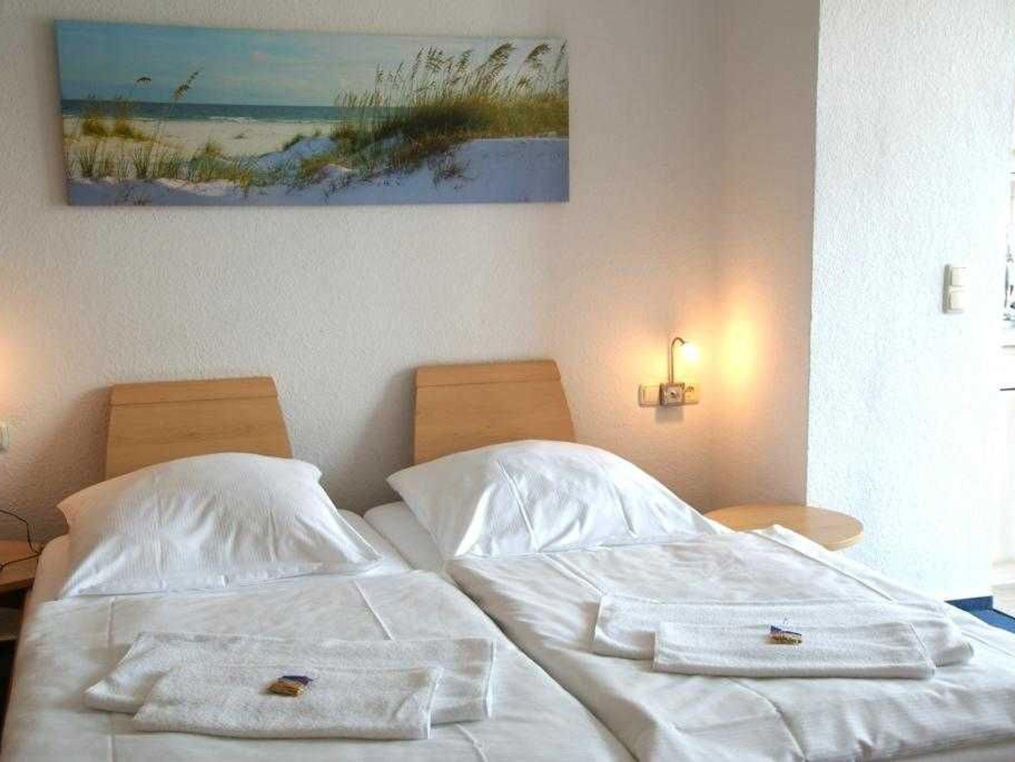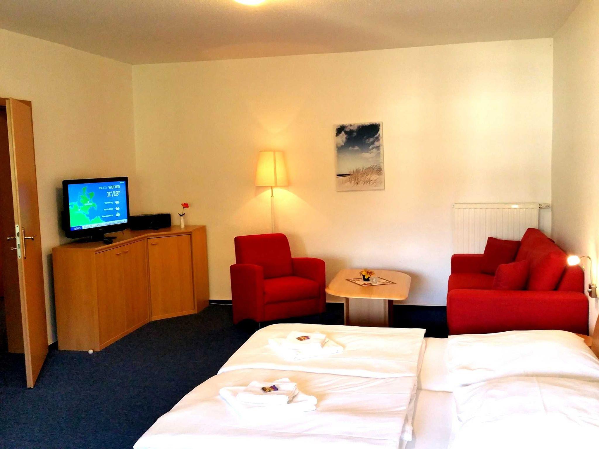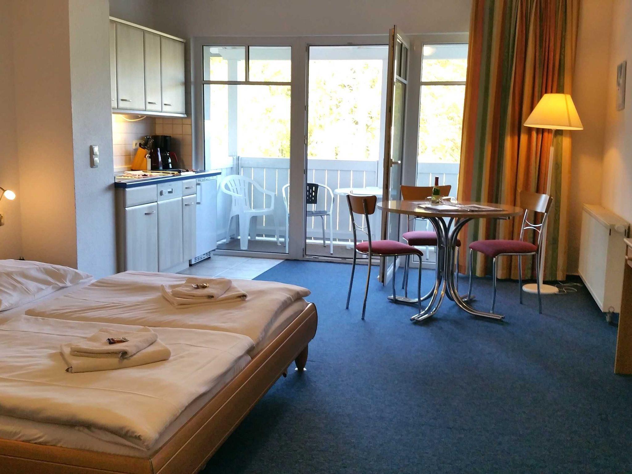 Das 1 Raumappartement hat einen Wohn-Schlafraum mit Doppelbett für 2 Pers.und einer ausziehbaren Couch, Kabel-TV,CD Stereoanlage ,Esstisch, gut ausgestattete Küchenzeile mit Geschirrspüler, Kaffeemaschine, Toaster und Microwelle. Babybett ( ohne Wäsche )und Hochstuhl für die kleinen stellen wir für 10 Euro zur Verfügung ( bitte vorbestellen ) .