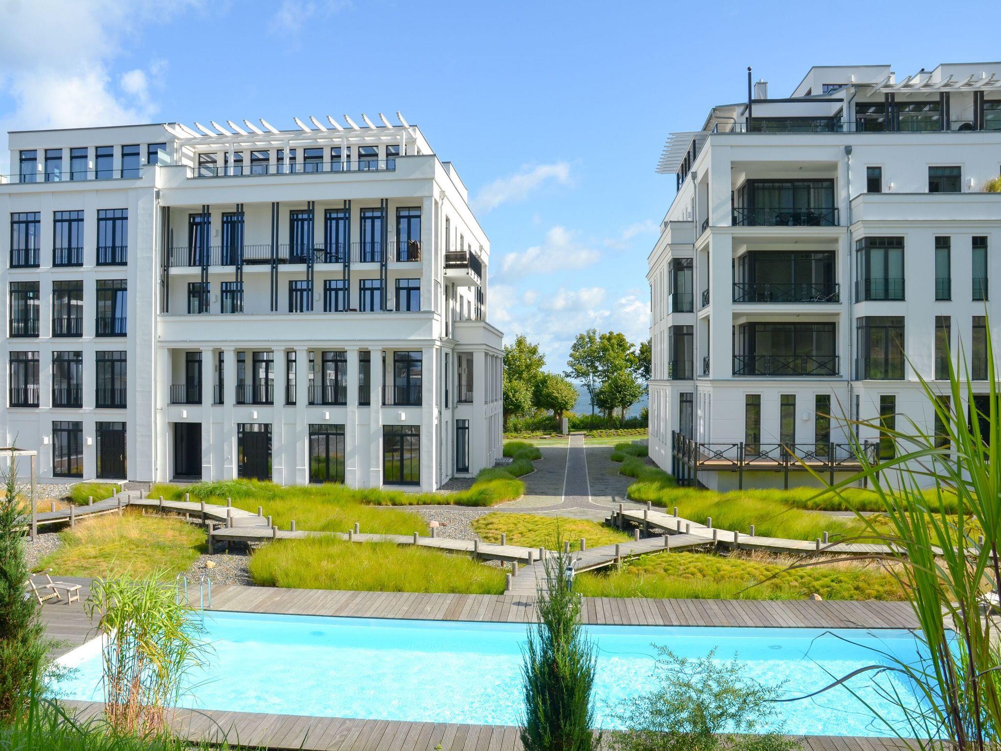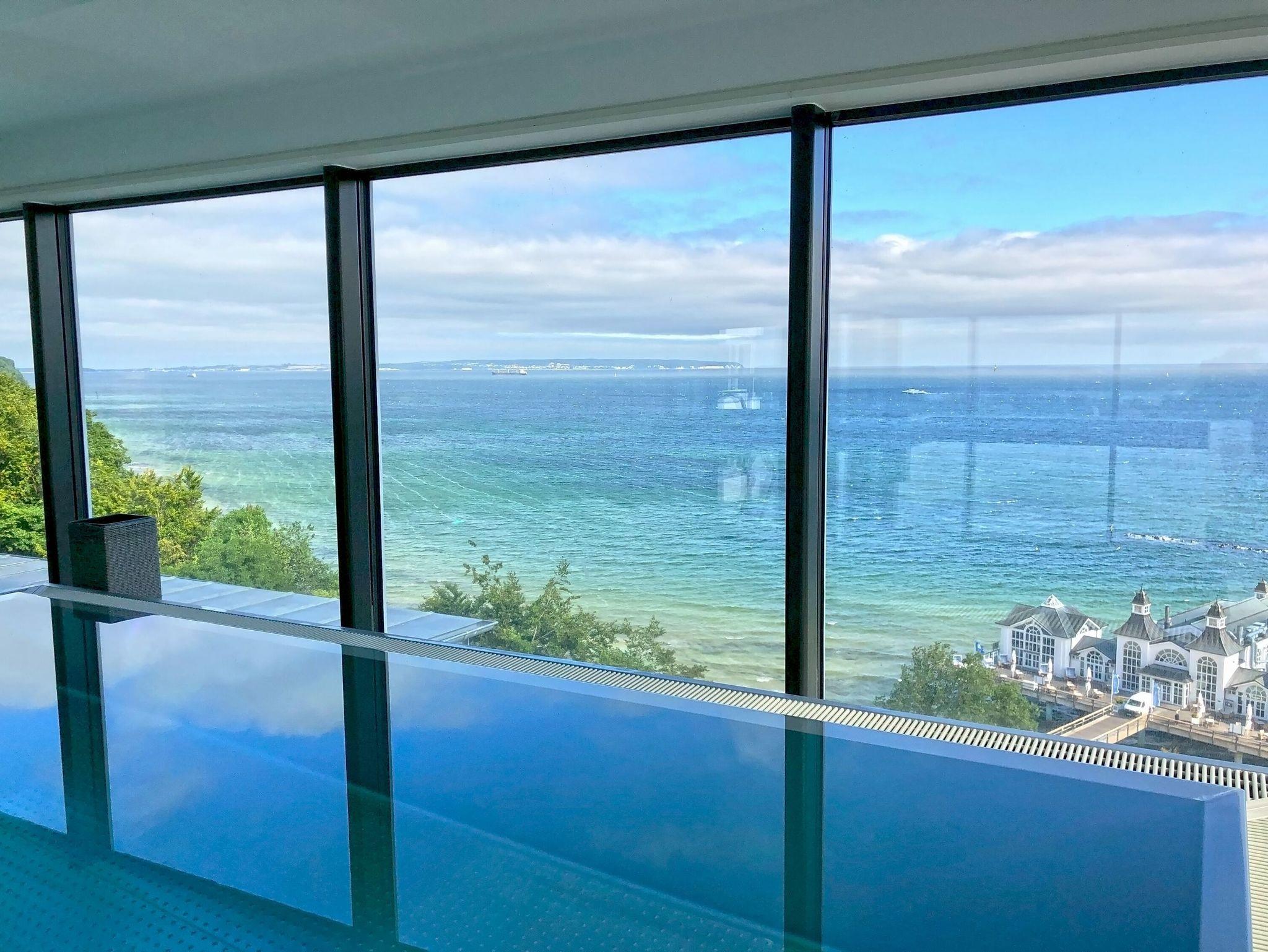 In der Sommersaison bietet der große solarthermiebetriebene Außenpool (15m x 5,5 m) mit Sonnenliegen entspannte Badefreuden. Als besonderes Bonbon können Sie darüber hinaus ganzjährig im benachbarten FIRST Sellin den SKY-Pool mit Meerblick und die Dachsaunen mitnutzen. Die dortige Dachterrasse besticht neben dem herrlichen Meerblick vor allem durch das Hallenbad (12 m lang x 4,30 m breit, 1,20 m tief, ca. 29°C Wassertemperatur), die Saunen mit Ostseeblick und den Wellnessbereich (SPA).