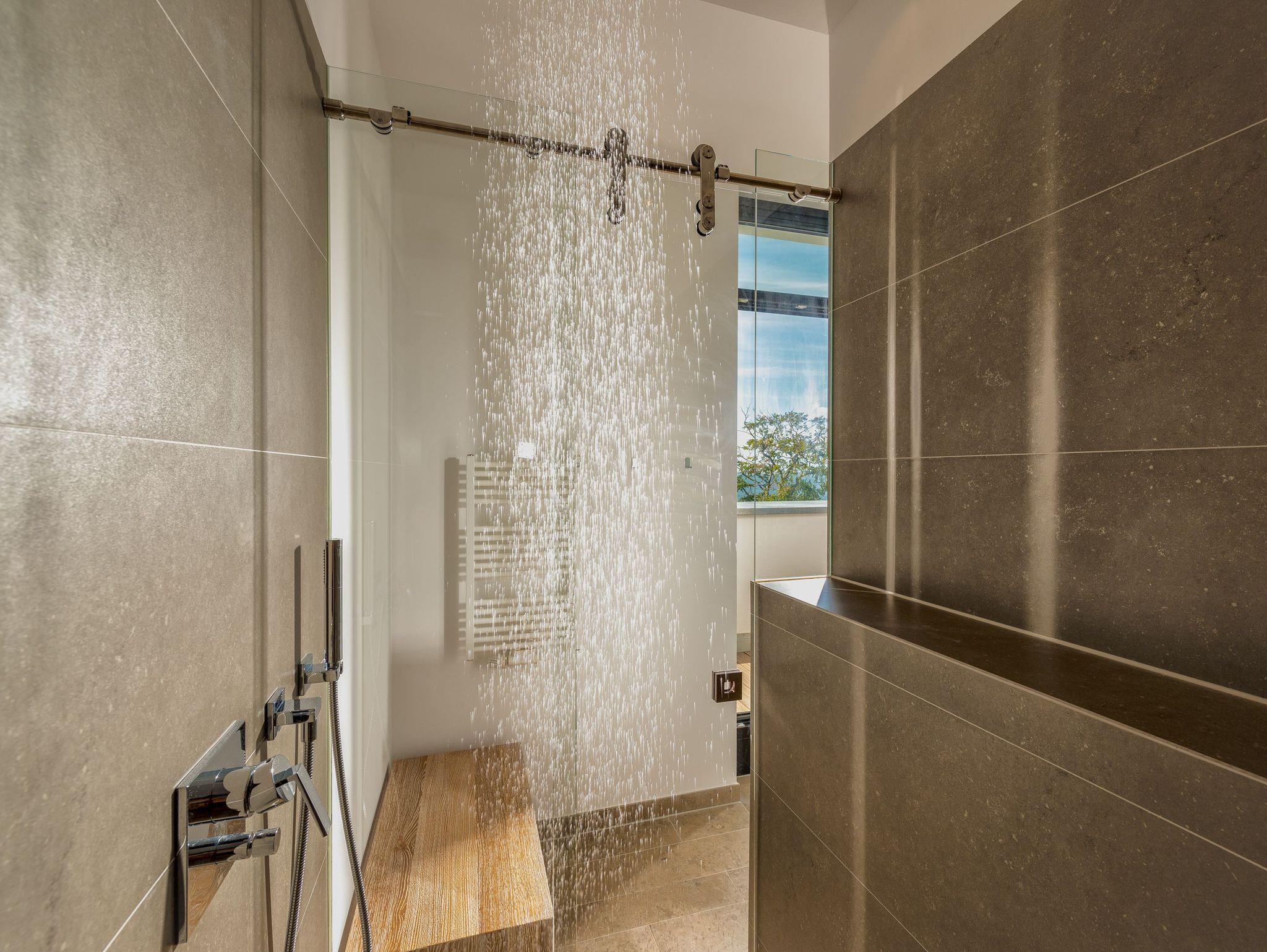 Vom Flur aus betreten Sie das Kinderschlafzimmer. Hier gibt es ein eigens angefertigtes Designer - Dreietagenbett mit vier bequemen Schlafmöglichkeiten und eine Kindersitzgruppe für unsere kleine Gäste. Daran anschließend finden Sie einen vom Schlafzimmer optisch getrennten Waschbereich mit Waschbecken und Spiegel. Von hier gelangen Sie durch eine Tür in den separaten, kleinen Wellnessbereich mit eigener Sauna und zwei Walkin-Duschen, eine davon mit Rainshower-Duscherlebnis. Die Sauna können Sie auch durch eine weitere Tür vom Flur aus betreten. Ein zusätzliches Gäste-WC steht zur Verfügung.