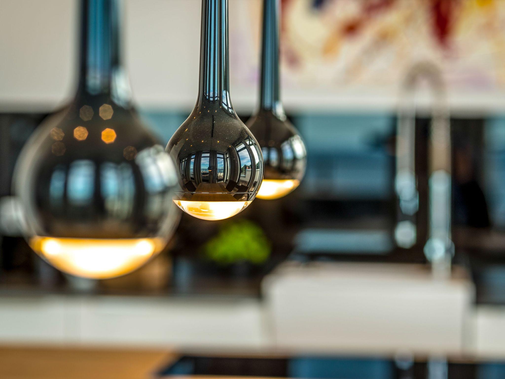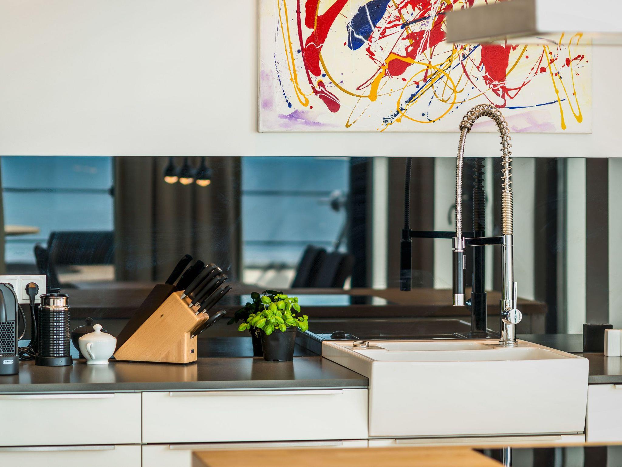 Die harmonisch in den Wohnbereich integrierte, offene Küche mit Marken-Einbaugeräten lässt das Herz eines jeden Hobbykochs höher schlagen. Eine freistehende Kücheninsel mit einem Induktionskochfeld, ein Backofen, eine Mikrowelle, diverse Küchengeräte und Kleininventar runden den hochwertigen Eindruck ab.