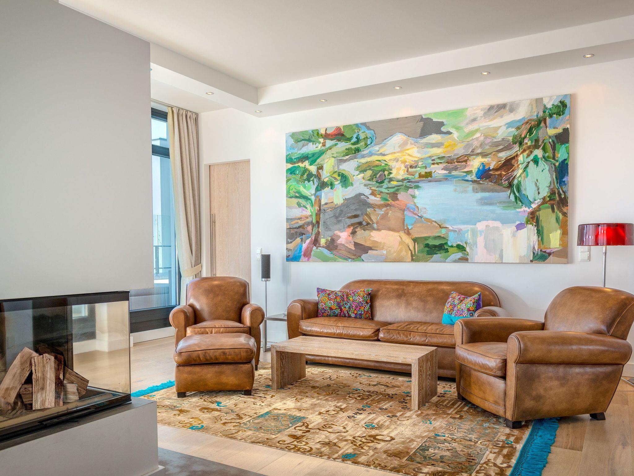 Vom Eingangsbereich aus gelangen Sie in den ca. 50 qm großen, hellen Wohnbereich. Das hochwertige Clubsofa und zwei gemütliche Clubsessel versprechen Entspannung nach einem erlebnisreichen Tag und ein Heimkino-System mit DVD-Player von LOEWE und einem großformatigen LCD-Fernseher sorgen für das passende Entertainment. In der kühleren Jahreszeit verbreitet ein prasselndes Feuer im Kamin Behaglichkeit und Romantik.
