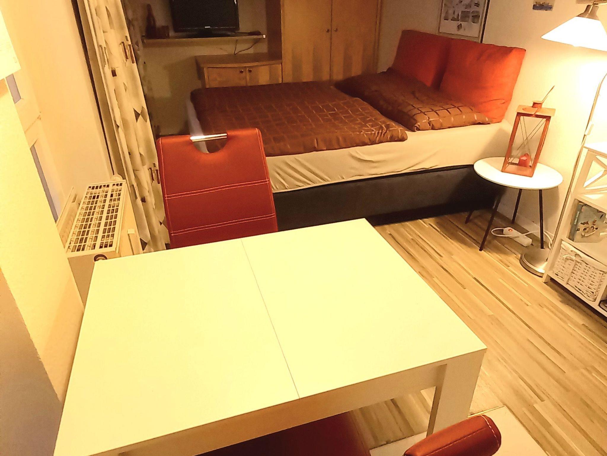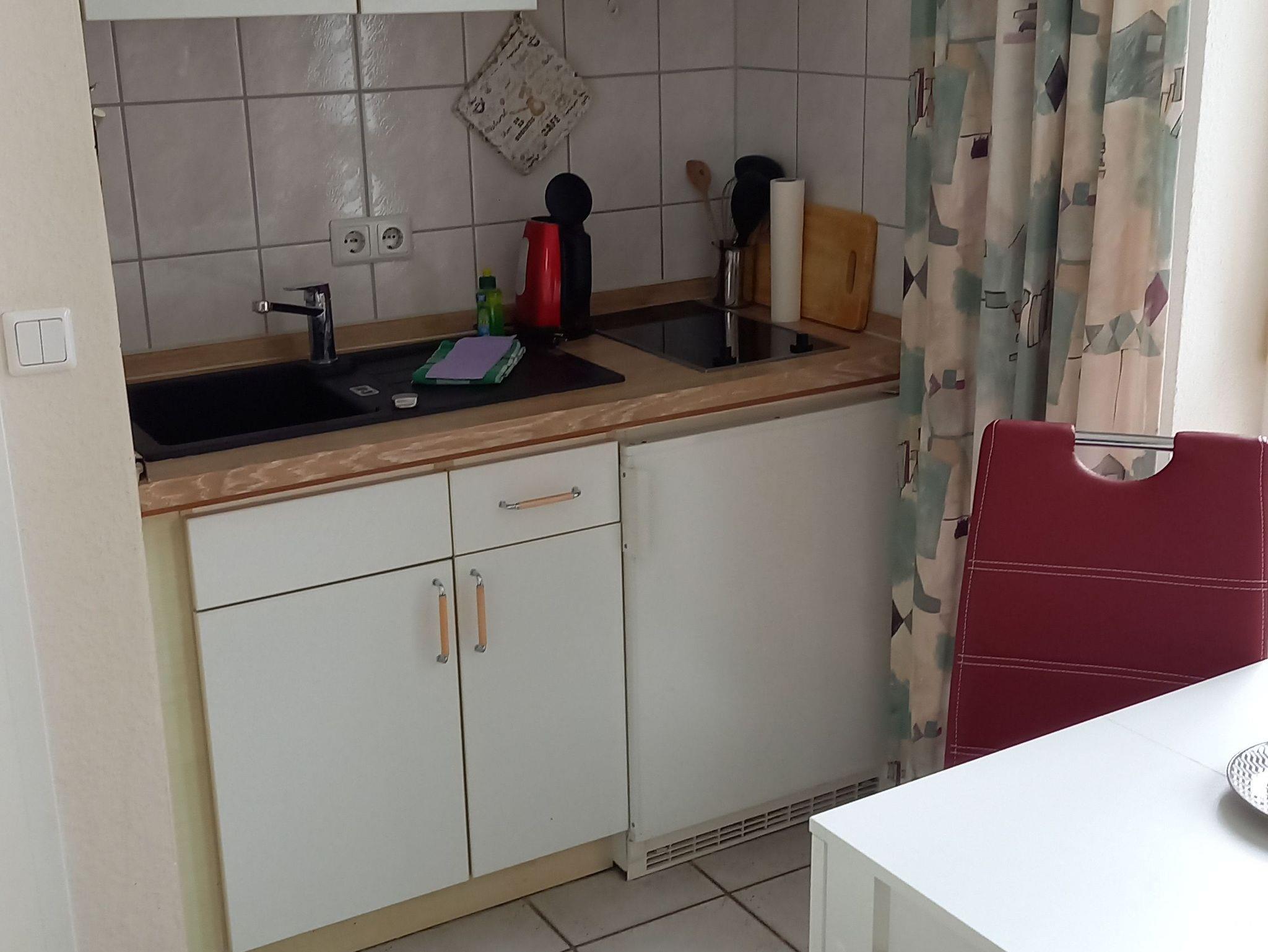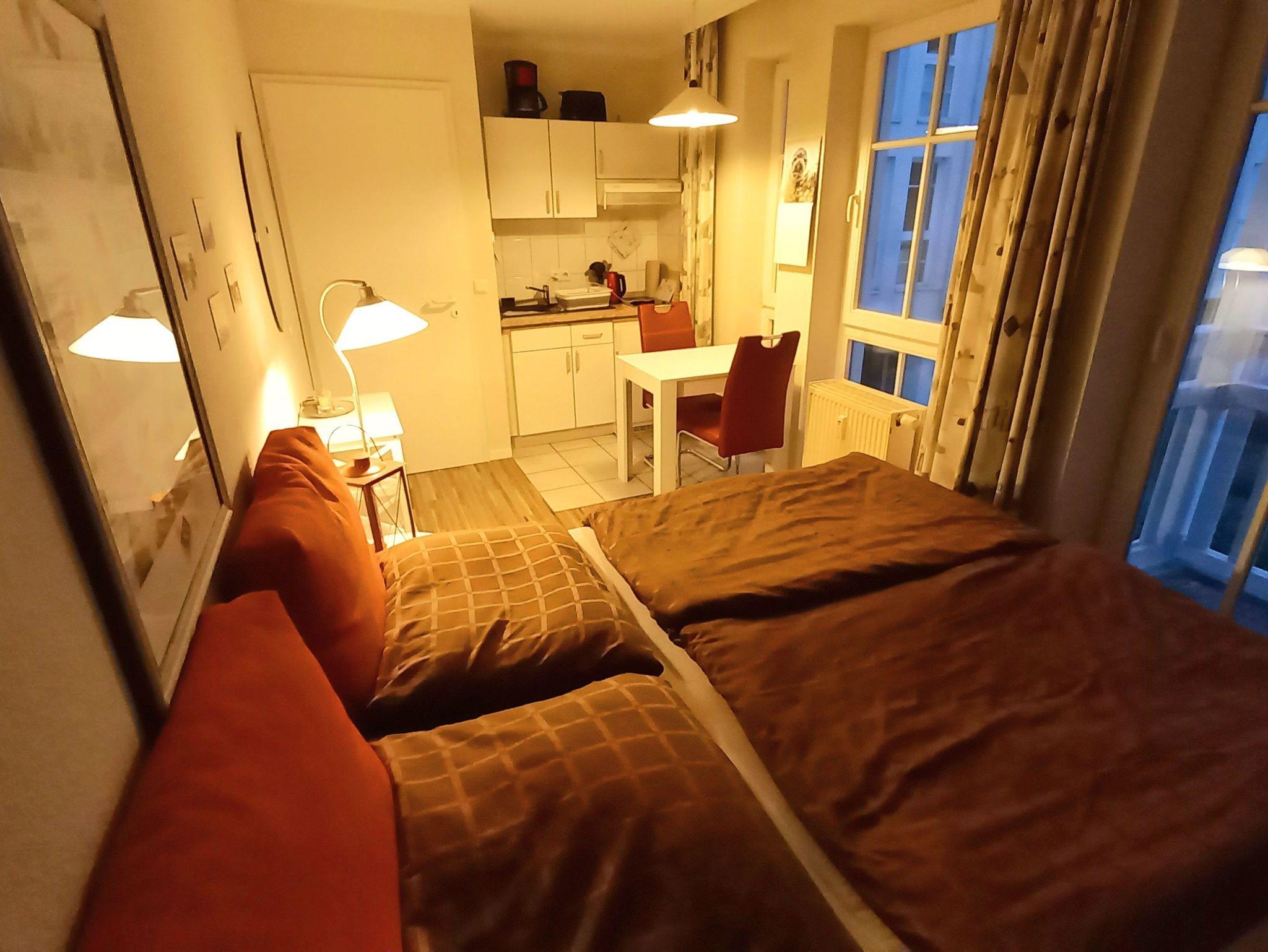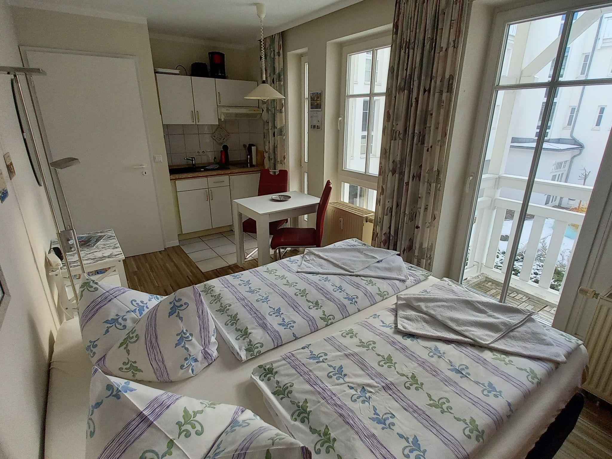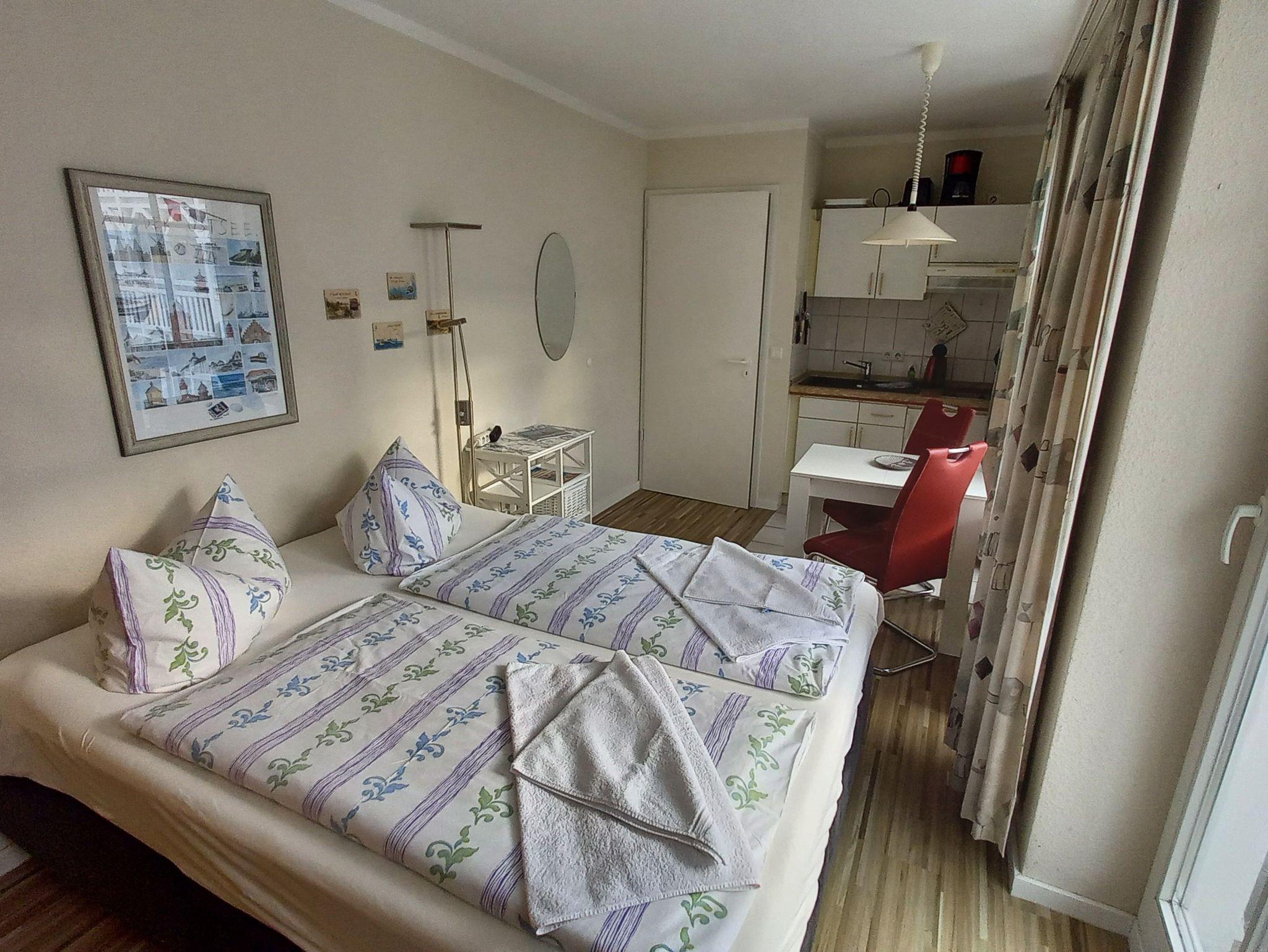kleine preiswerte Ferienwohnung in einer Ferienanlage, 1 kombinierter Wohn-Schlafraum mit Küchenzeile, 1 Bad mit Dusche und WC, 1 Balkon in Südwestrichtung,