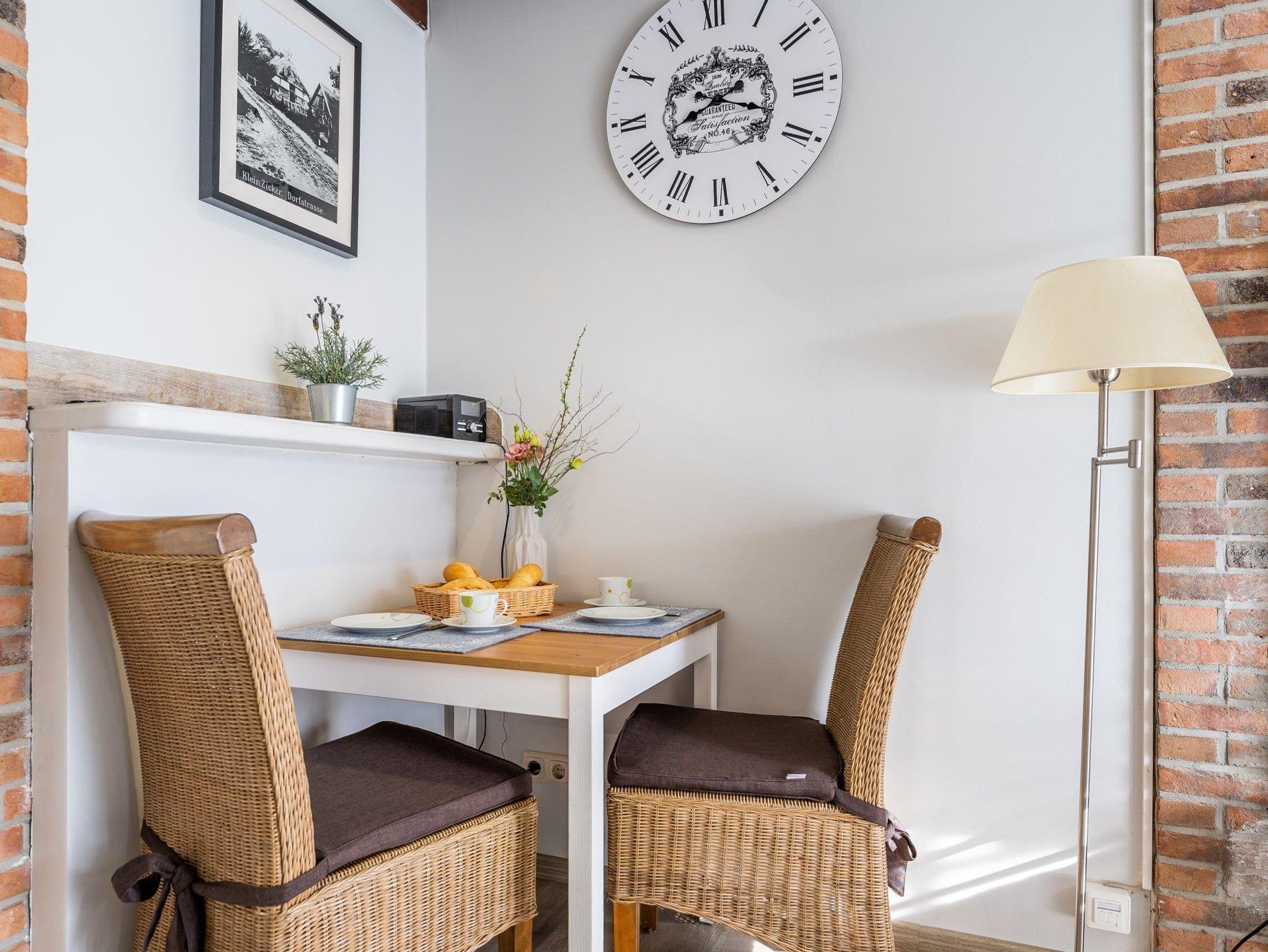 • komplett eingerichtete Miniküche mit Mikrowelle und Essplatz