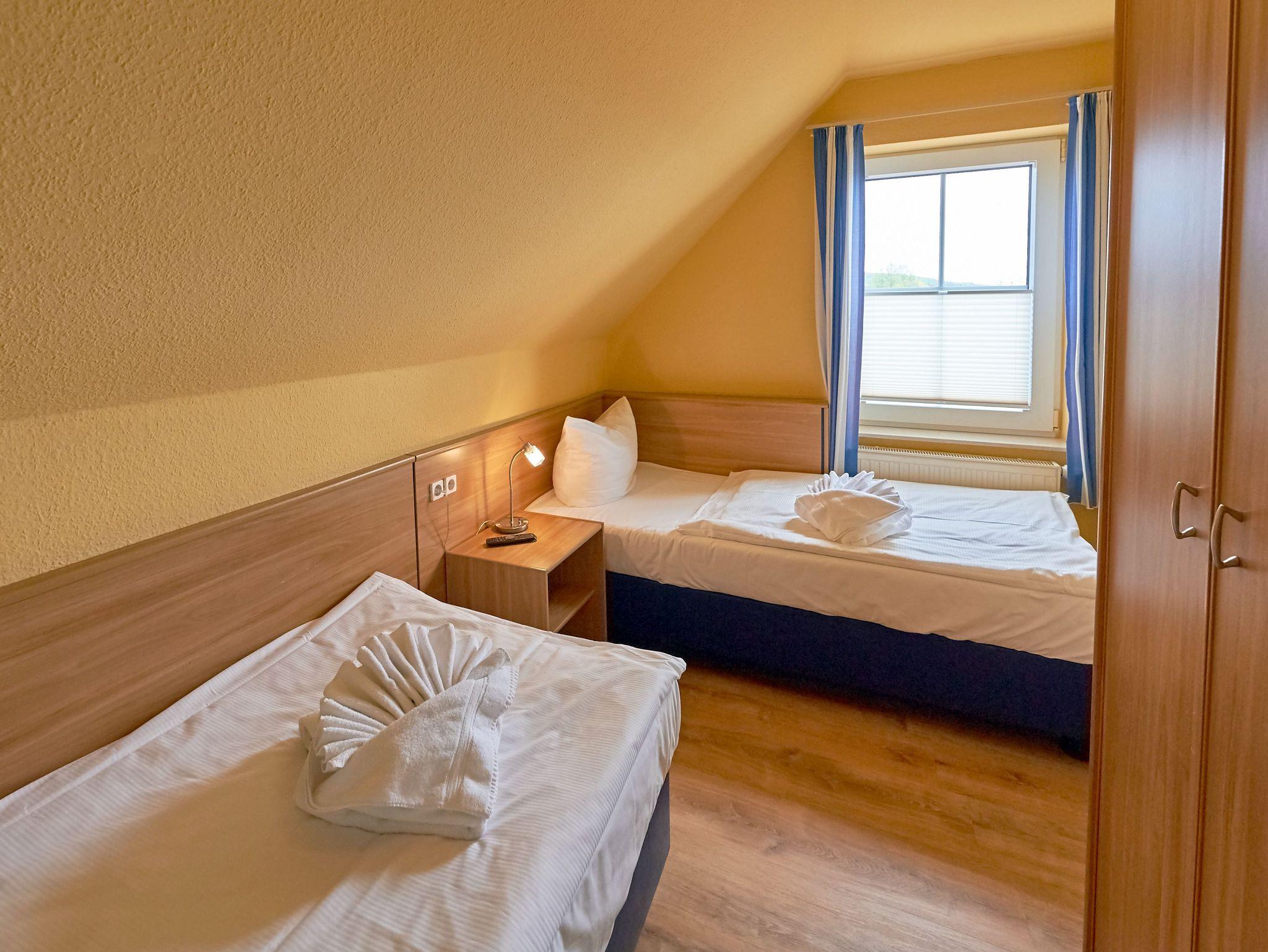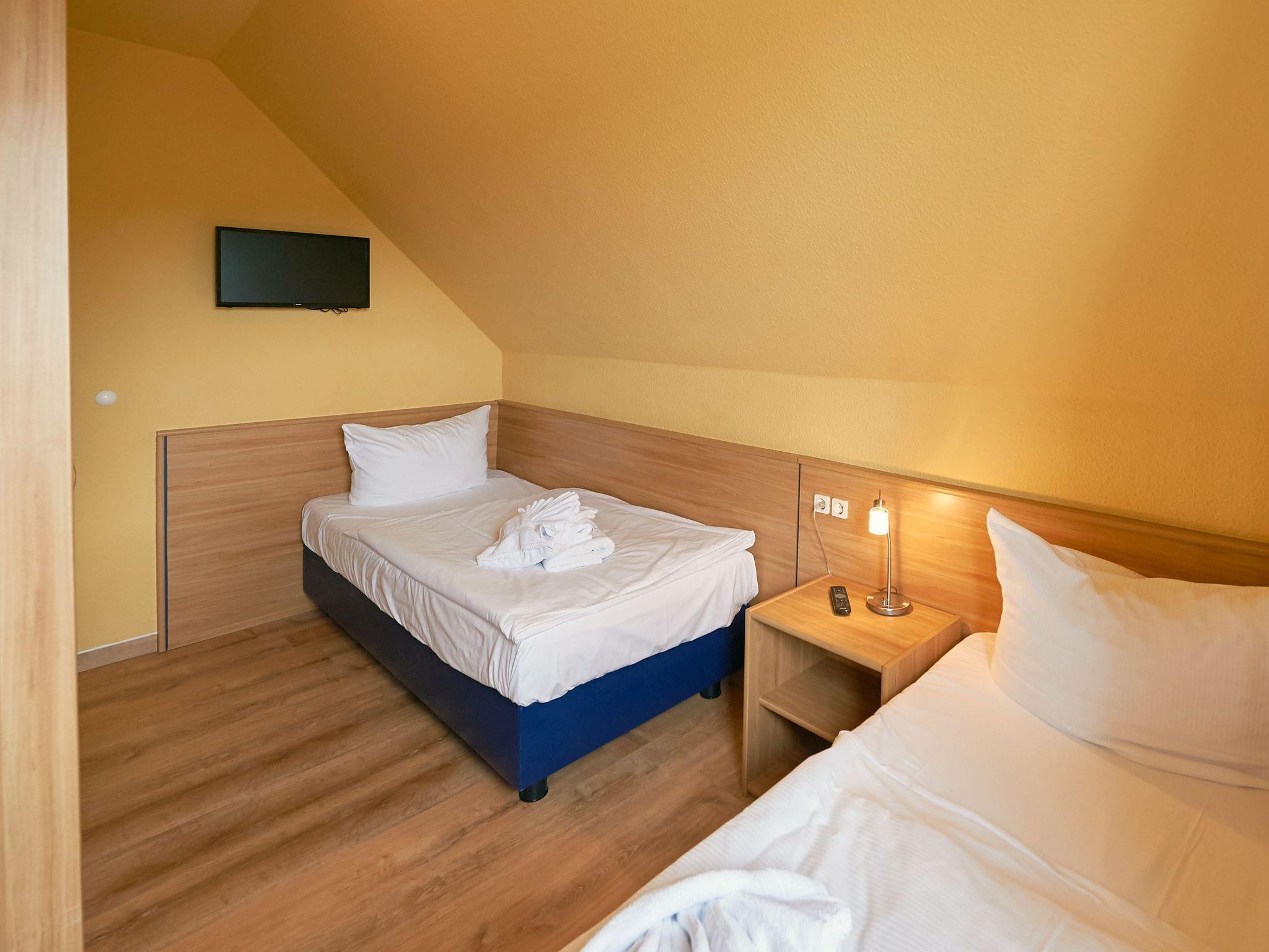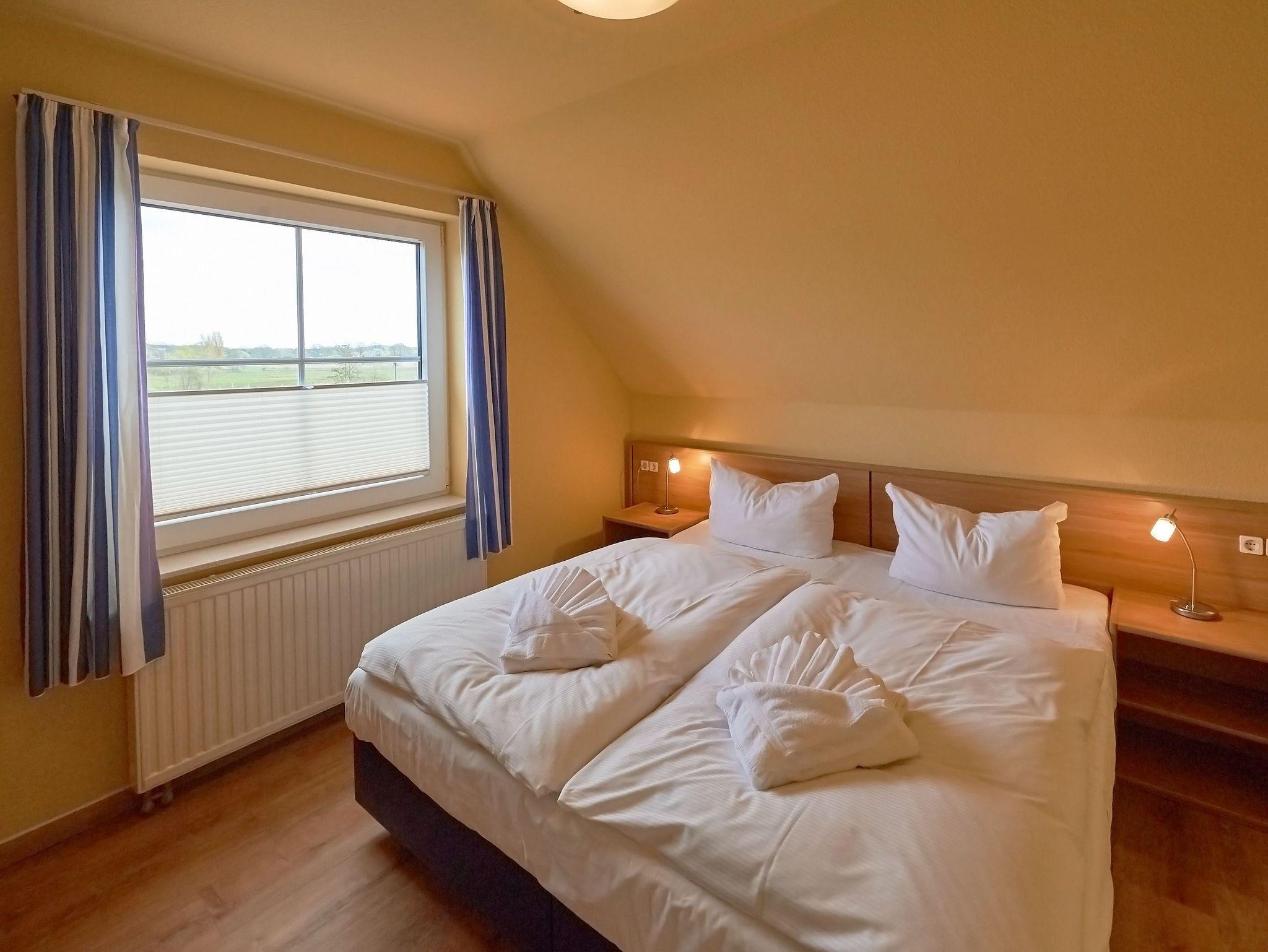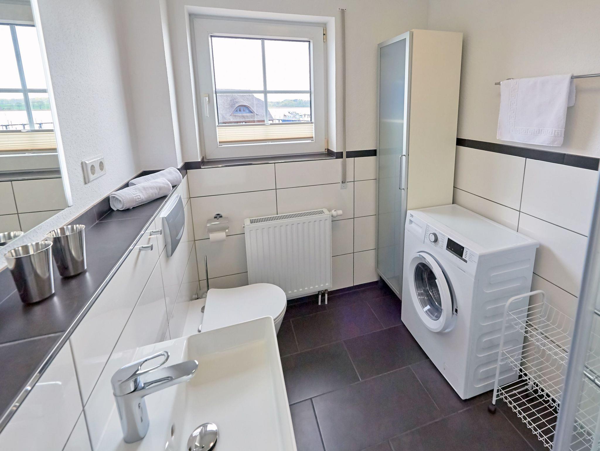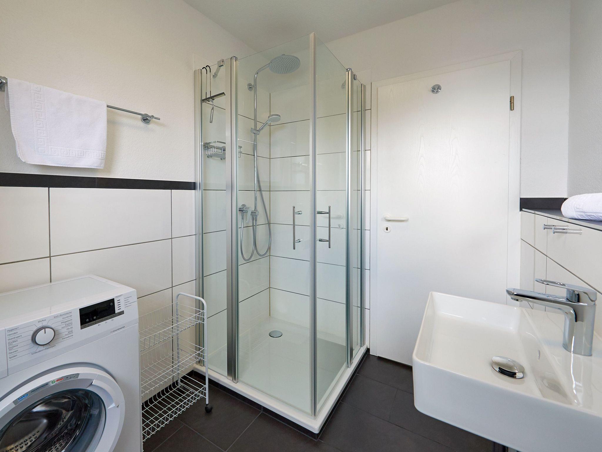 Eines der beiden Schlafzimmer verfügt über ein Doppelbett, das andere über zwei Einzelbetten. Im Badezimmer mit Dusche gibt es auch eine Waschmaschine.