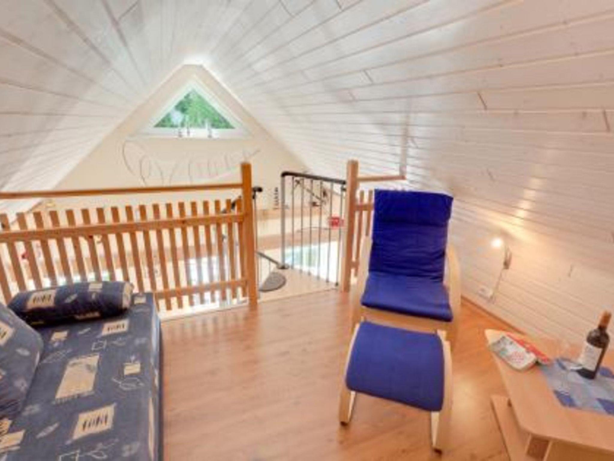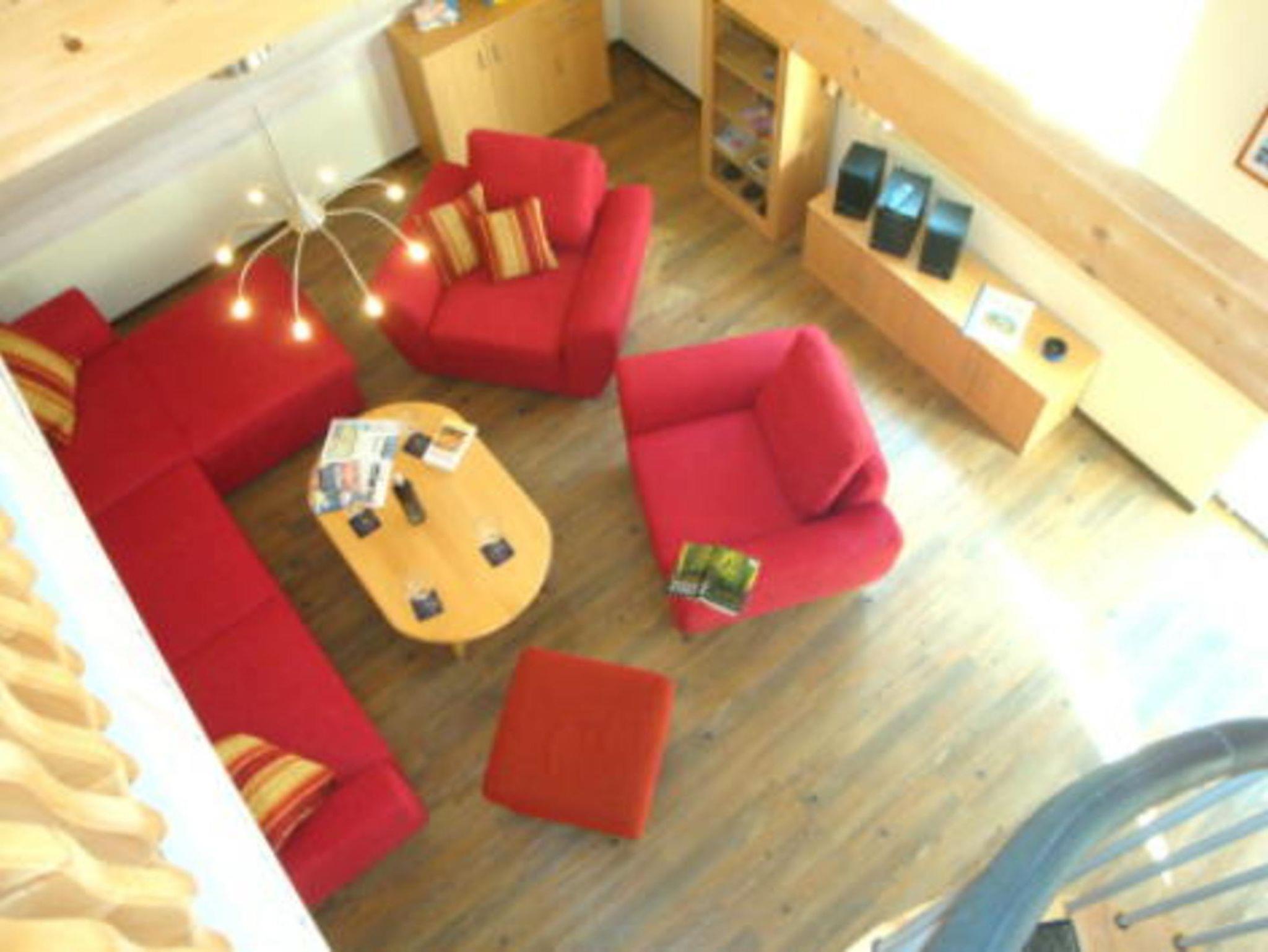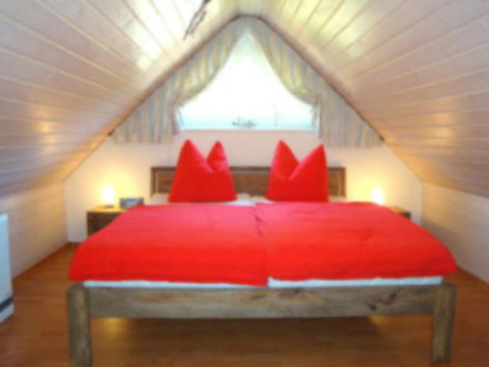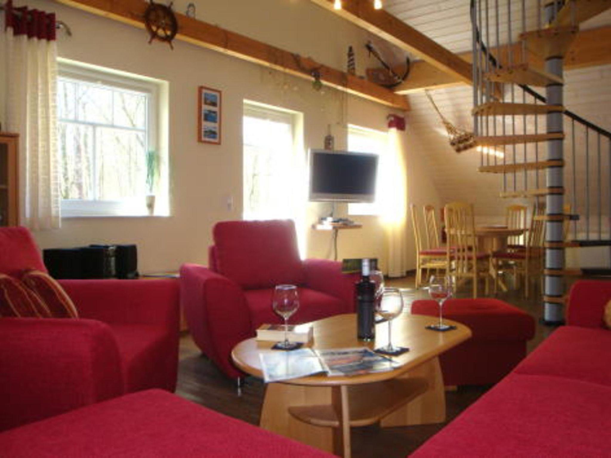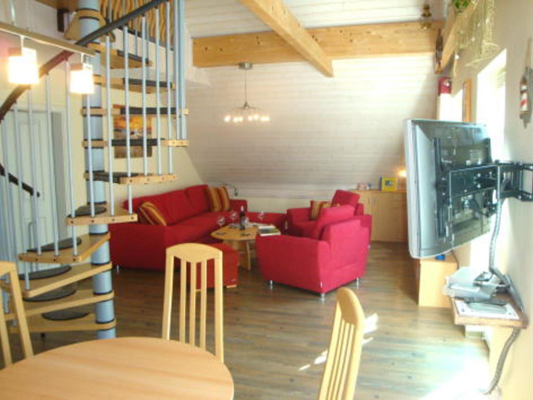 Die 90 qm große Ferienwohnung ist für 6 Erwachsene Personen plus eine zusätzliche Aufbettung und erstreckt sich über 2 Etagen. Über eine Wendeltreppe im Wohnzimmer kann man eine offene Galerie mit Couch, Leseecke und kleinem Schrank erreichen. Dahinter befindet sich das 2. Schlafzimmer durch eine Tür getrennt, mit Doppelbett und Einbauschränken. Ein separates Schlafzimmer mit Doppelbett und Kleiderschrank findet man unten neben dem großen Bad. Zur Badausstattung zählen die Dusche, Waschbecken, WC, Handtuchtrockner und Haarfön.