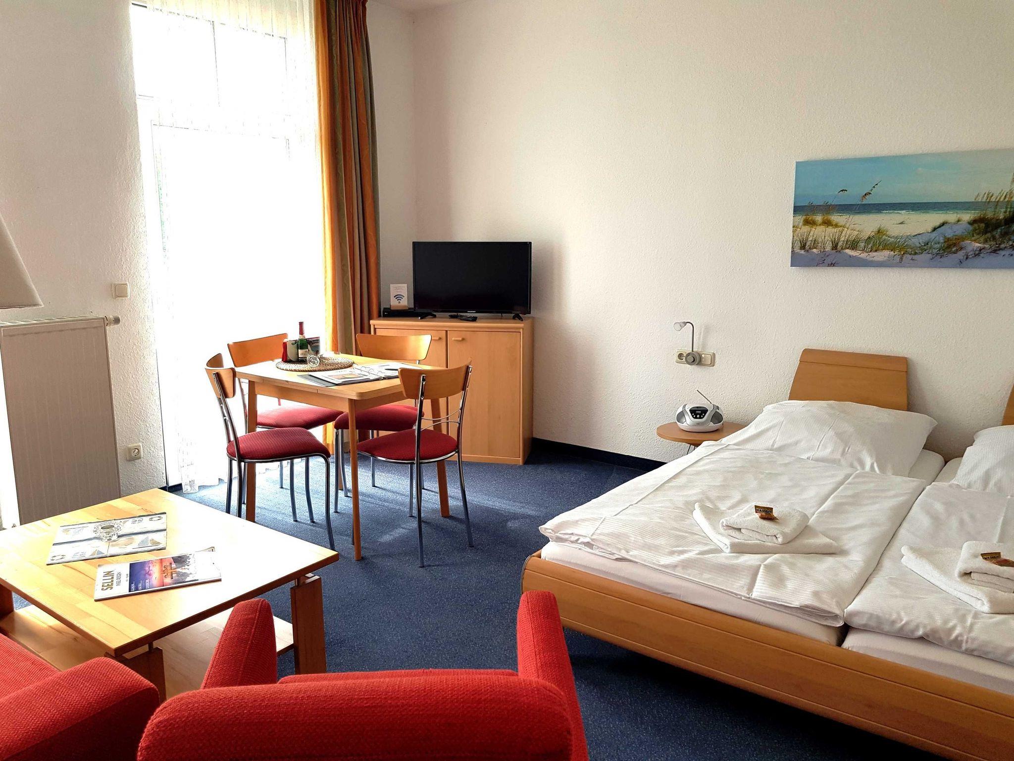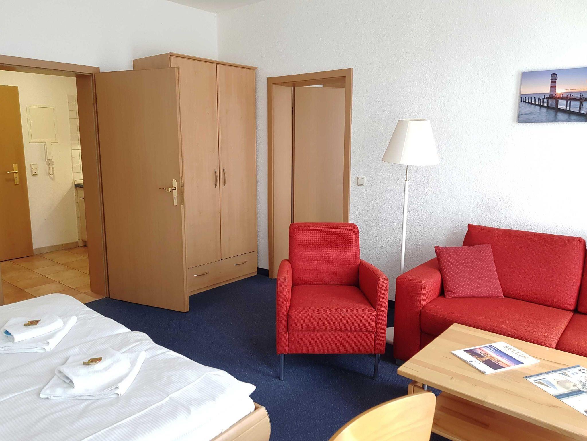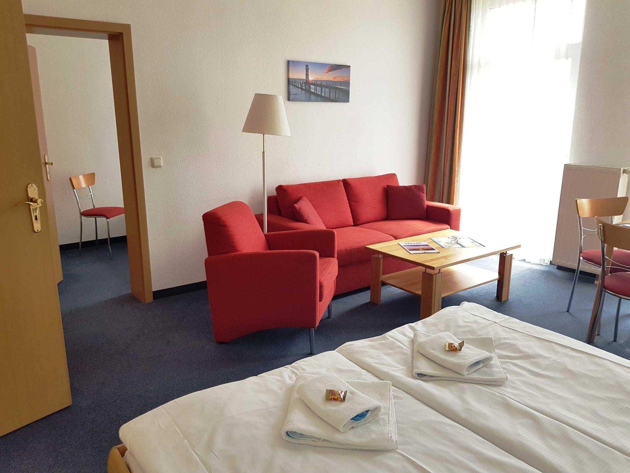 2 Raum Apartment mit Wohn-Schlafraum und Doppelbett und einem 2. Zimmer mit Ausziehcouch .Einem Esstisch im Wohnschlafraum für 4 Personen und gut ausgestatte Küche mit Geschirrspüer, Kaffemaschine, Wasserkocher etc. Babybetten ohne Wäsche können für einmalig 10 Euro gemietet werden. Bitte vorbestellen .